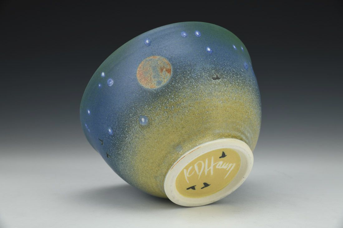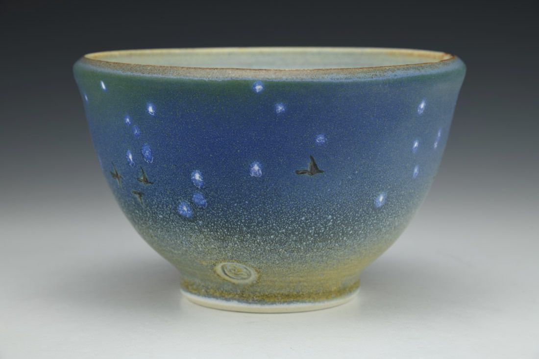 Porcelain, wheel thrown, sprayed, carved and brushed surface, cone 6 oxidation fired, 4 x 6.25 x 6.25 inches.