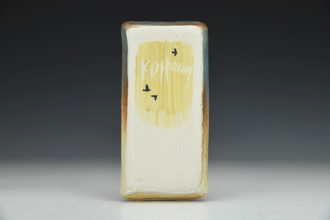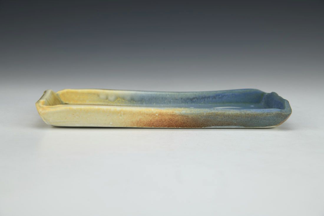 Porcelain, hand built with slabs, sprayed, carved and brushed surface, cone 6 oxidation fired, 0.5 x 6.75 x 3.25 inches.