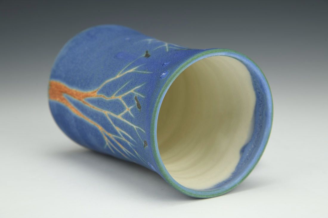 Porcelain, wheel thrown, sprayed, carved and brushed surface, cone 6 oxidation fired, 5.25 x 4.5 x 3.25 inches.