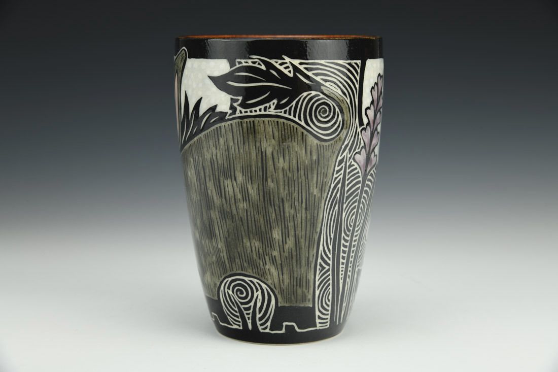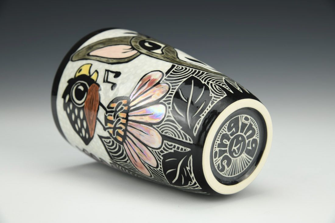 Porcelain, wheel thrown, sgraffito, underglaze, glaze, mother of pearl luster, cone 5.5 oxidation fired, 5.5 x 3.5 x 3.5 inches.