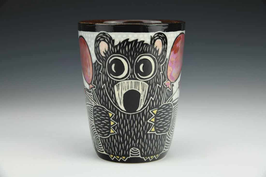 Porcelain, wheel thrown, sgraffito, underglaze, glaze, mother of pearl luster, cone 5.5 oxidation fired, 4.75 x 3.75 x 3.75 inches.