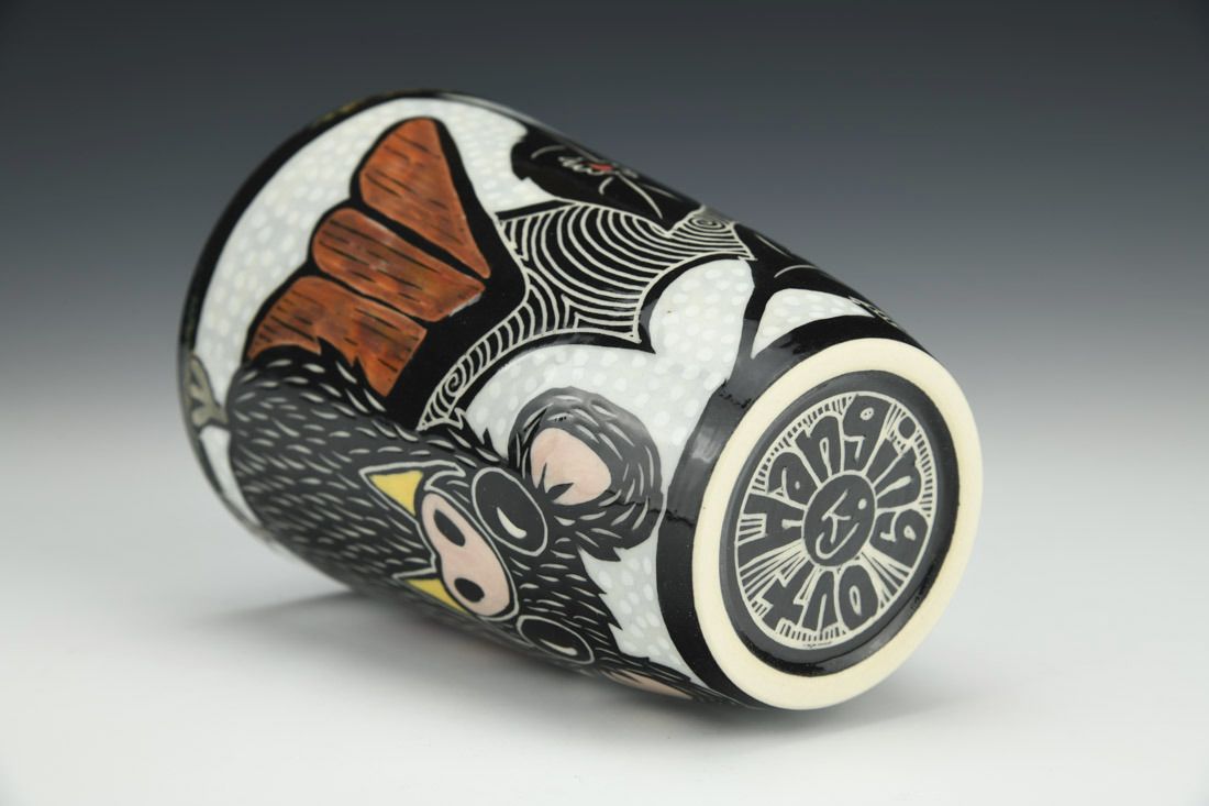 Porcelain, wheel thrown, sgraffito, underglaze, glaze, mother of pearl luster, cone 5.5 oxidation fired, 5.25 x 3.75 x 3.75 inches.