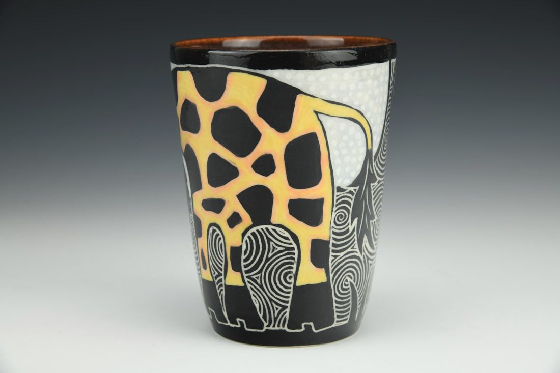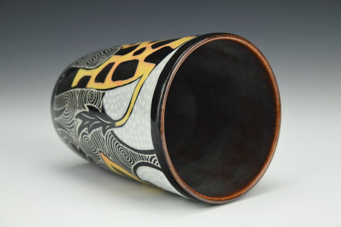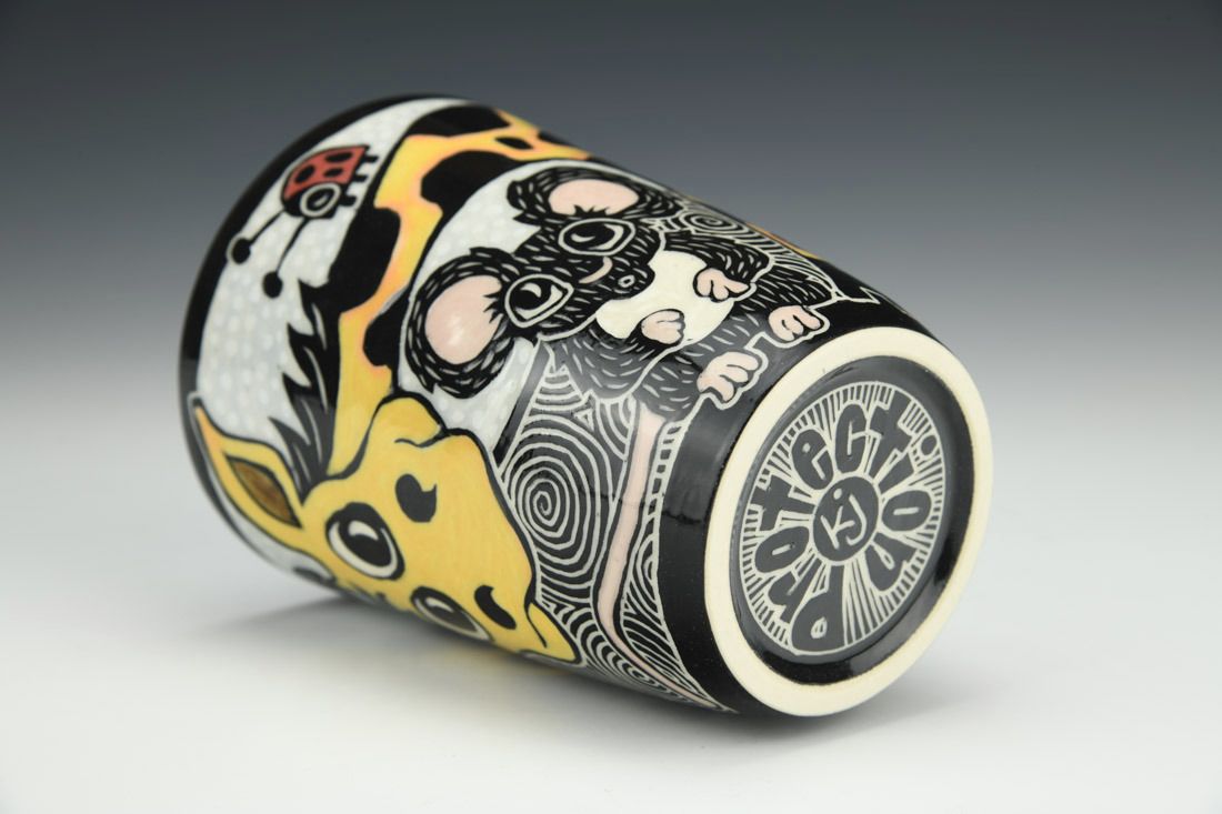Porcelain, wheel thrown, sgraffito, underglaze, glaze, cone 5.5 oxidation fired, 4.75 x 3.5 x 3.5 inches.