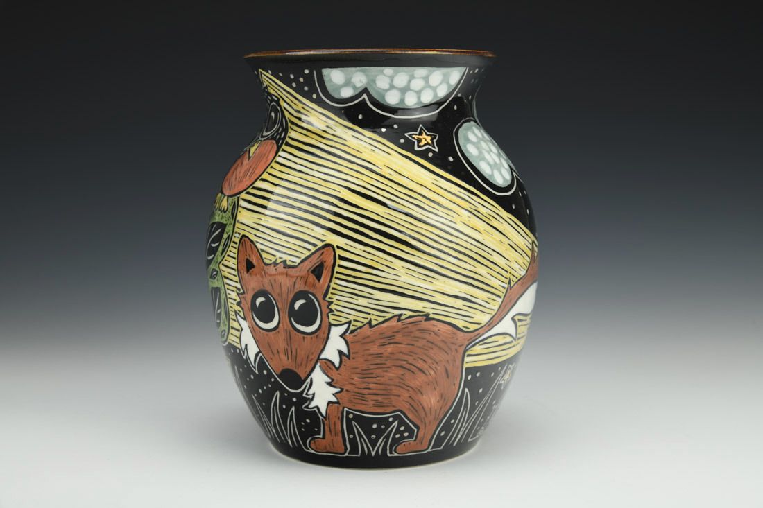Porcelain, wheel thrown, sgraffito, underglaze, glaze, gold luster, white gold luster, amber mother of pearl luster, cone 5.5 oxidation fired, 8 x 6 x 6 inches.