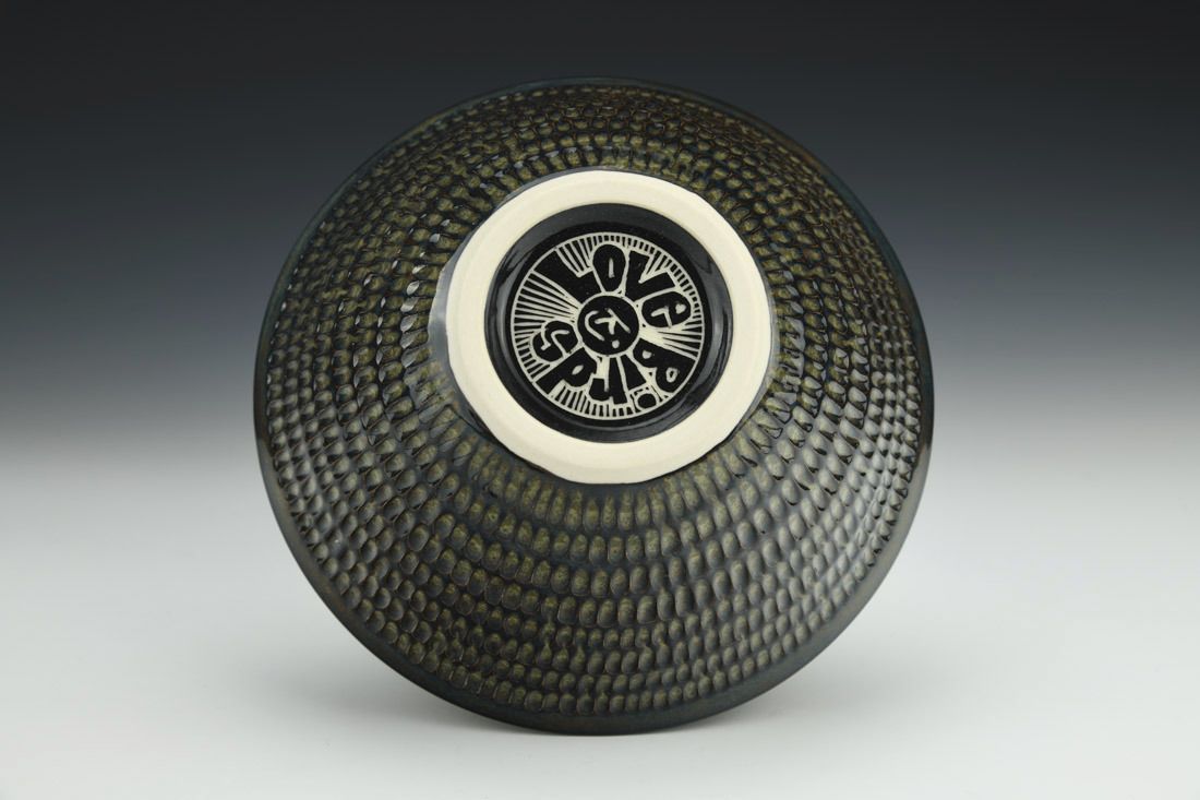 Porcelain, wheel thrown, sgraffito, underglaze, glaze, gold luster, cone 5.5 oxidation fired, 3 x 7 x 7 inches.