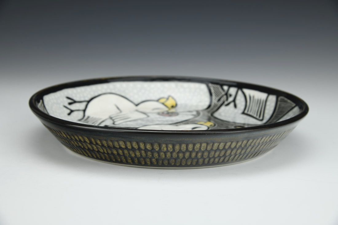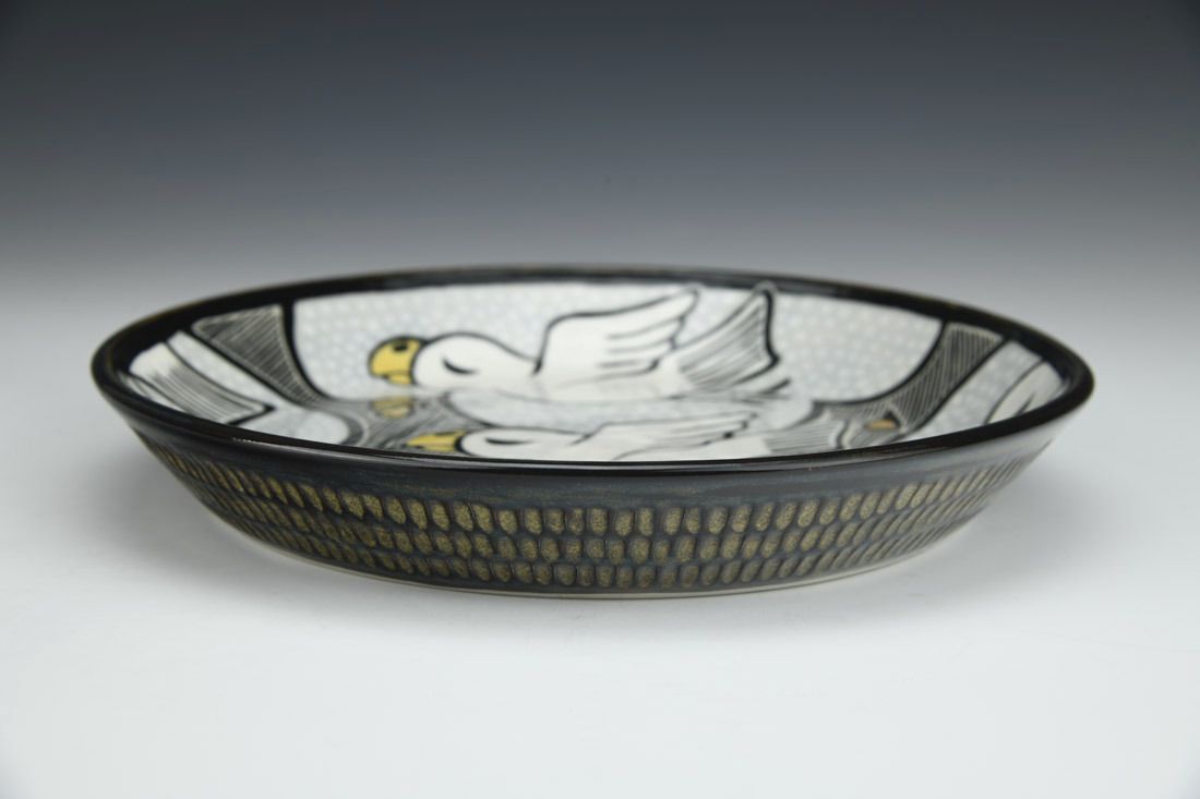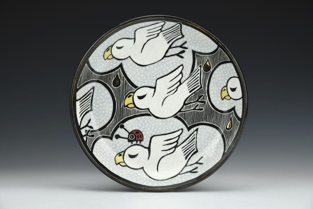 Porcelain, wheel thrown, sgraffito, underglaze, glaze, gold luster, cone 5.5 electric fired, 1.25 x 8.25 x 8.25 inches.