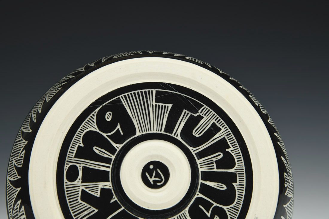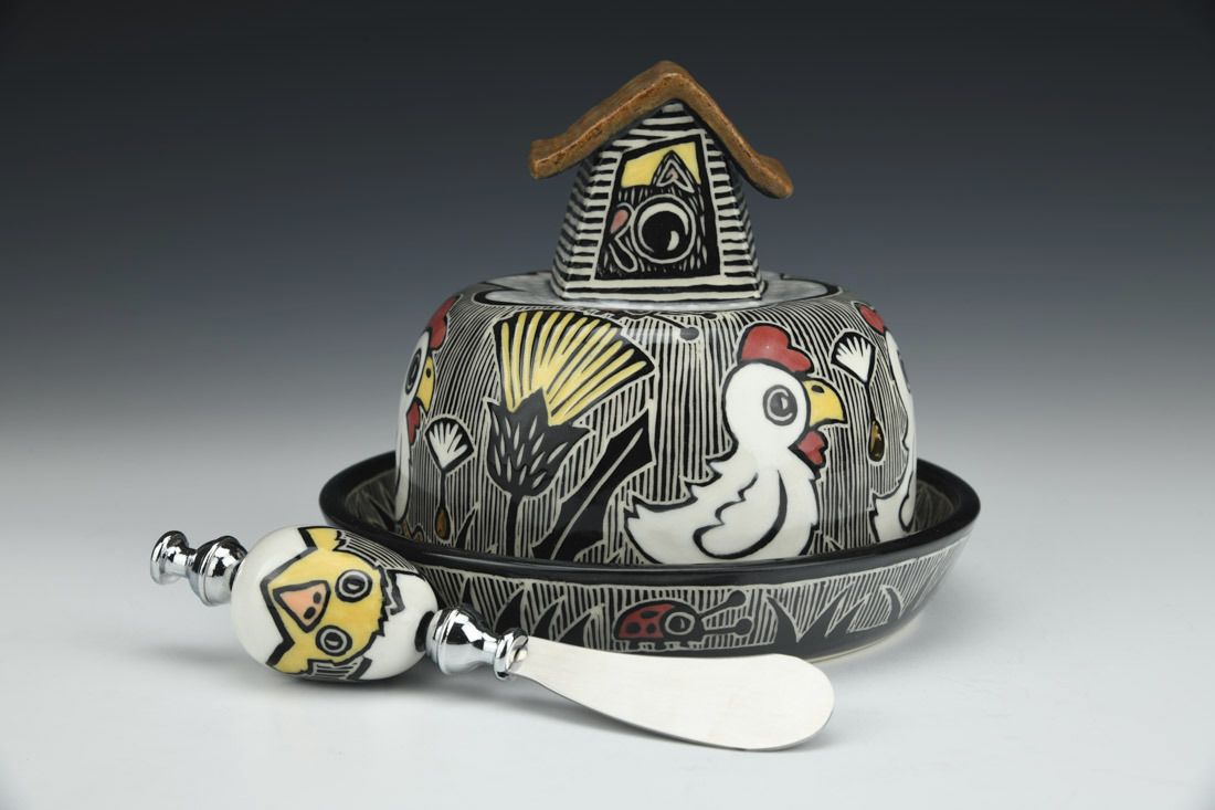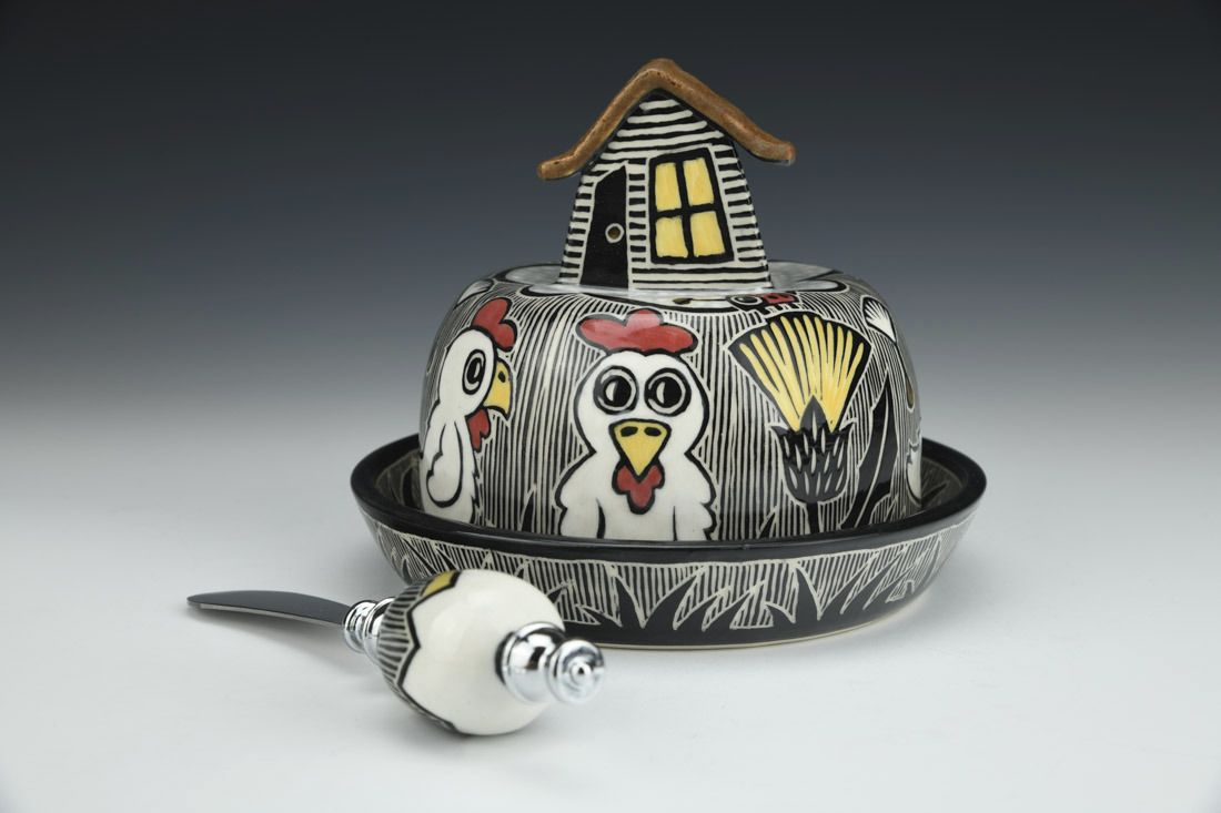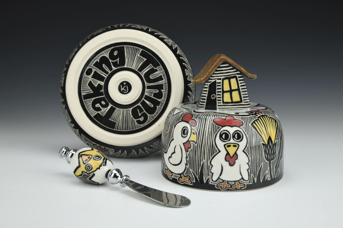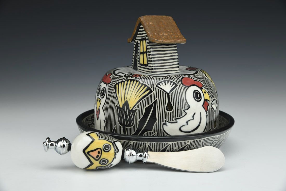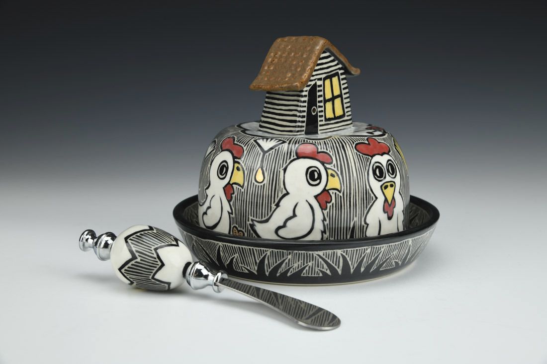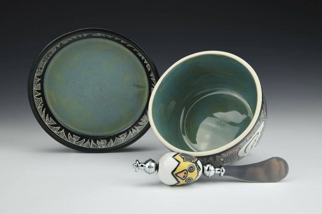 Porcelain with metal, wheel thrown and hand built, sgraffito, underglaze, glaze, gold luster, cone 5.5 electric fired, 5 x 6 x 6 inches.