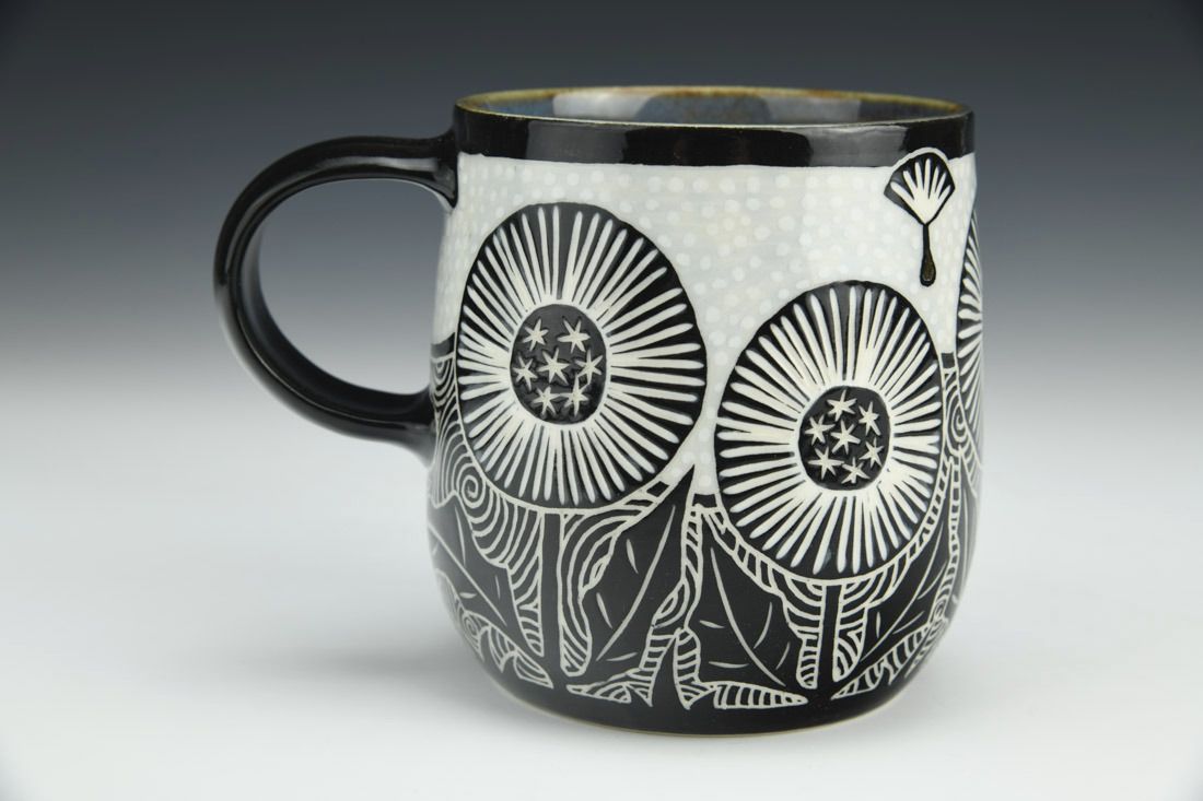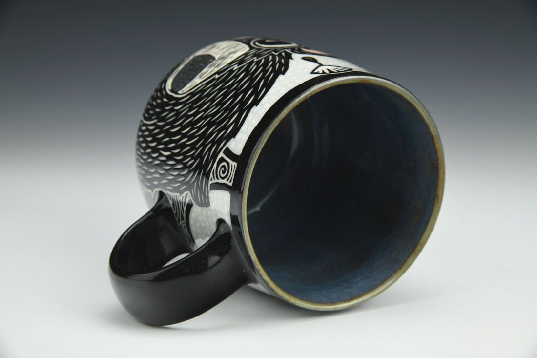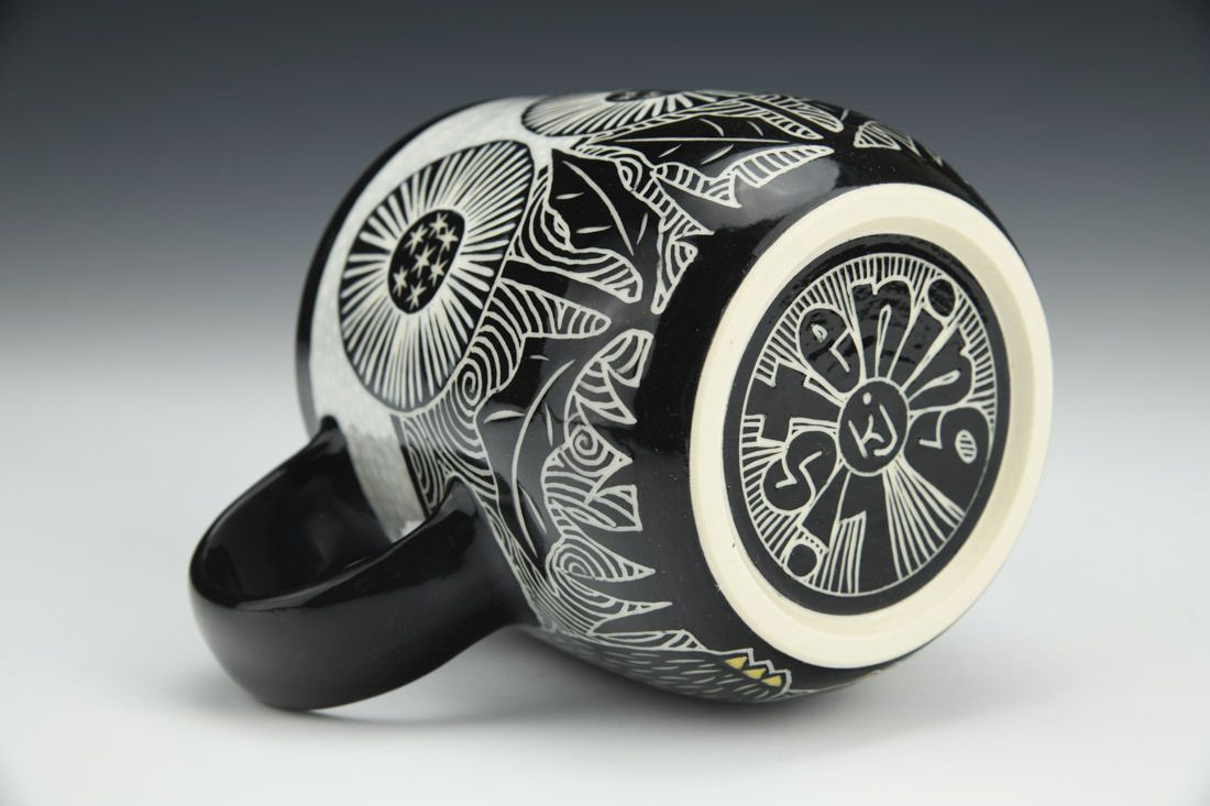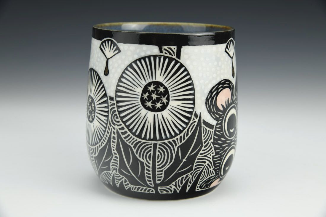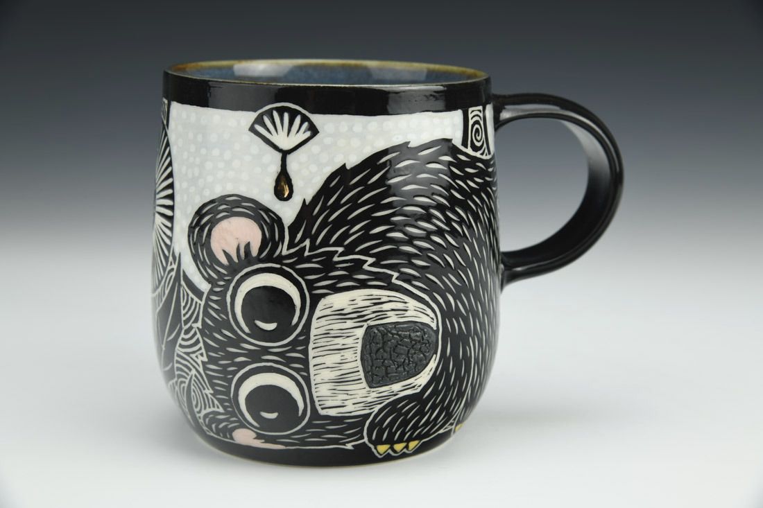Porcelain, wheel thrown, sgraffito, underglaze, glaze, gold luster, cone 5.5 electric fired, 4.25 x 5.5 x 4 inches.