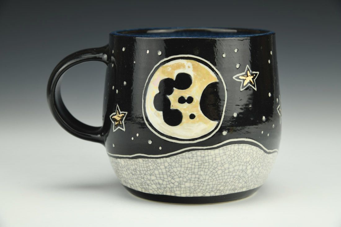 Porcelain, wheel thrown, sgraffito, underglaze, glaze, gold luster, white gold luster, amber mother of pearl luster, ink, cone 5.5 oxidation fired, 3.75 x 5.5 x 4 inches.