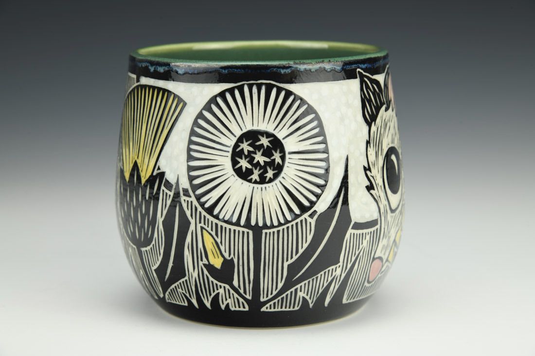 Porcelain, wheel thrown, sgraffito, underglaze, glaze, cone 5.5 oxidation fired, 3.75 x 5.5 x 3.75 inches.