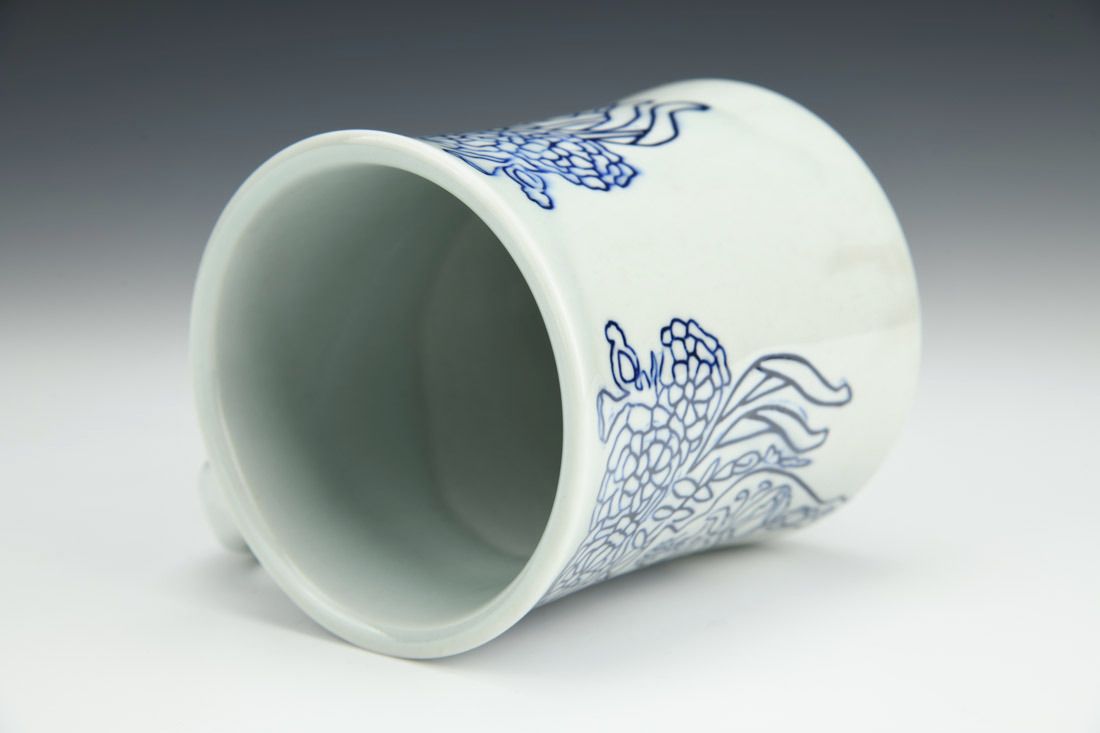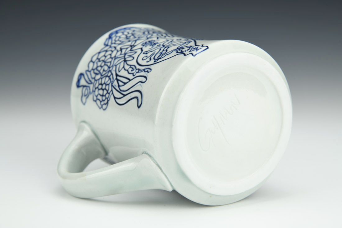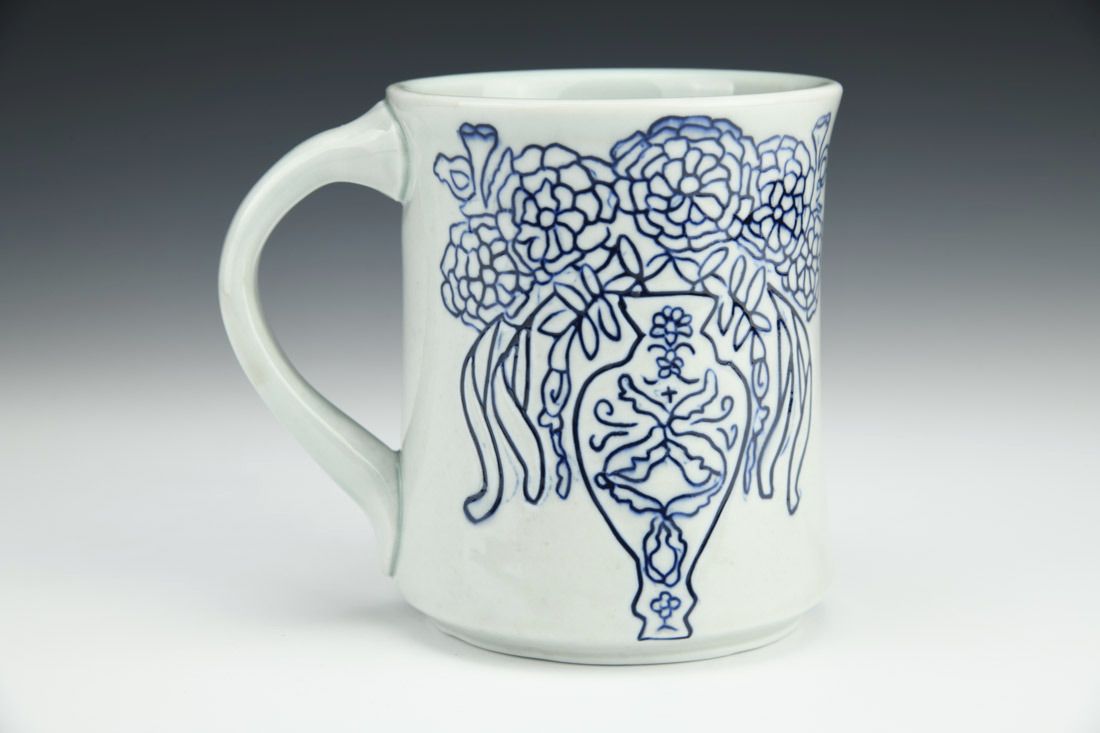 Porcelain, wheel thrown, inlaid, terra sigillata, mason stain, celadon glaze, cone 10 reduction fired, 4.5 x 5 x 3.75 inches.