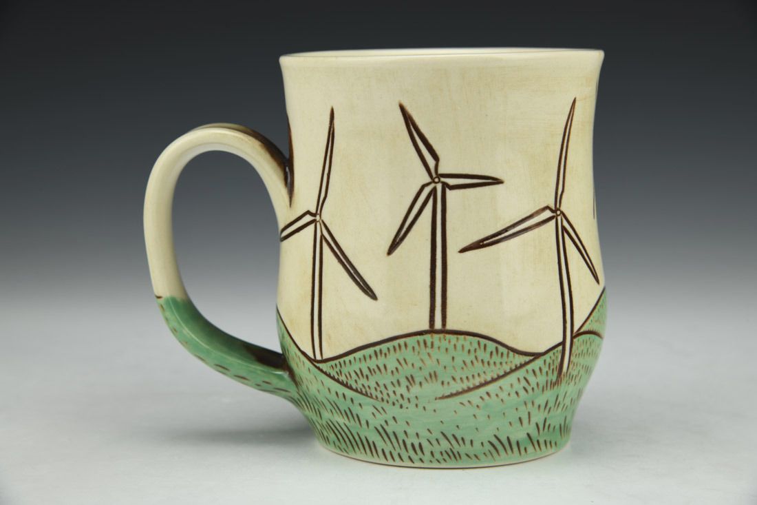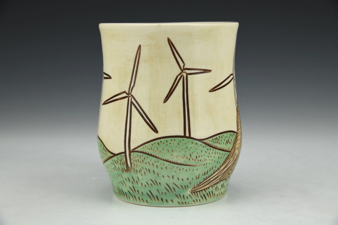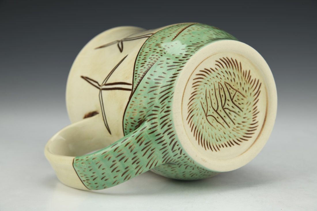 White stoneware, wheel thrown, sgraffito, underglaze, clear glaze, cone 6 electric fired, 4.25 x 5 x 3.25 inches.