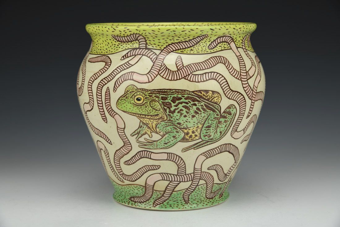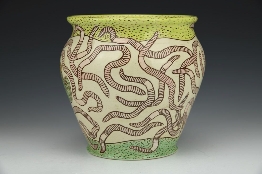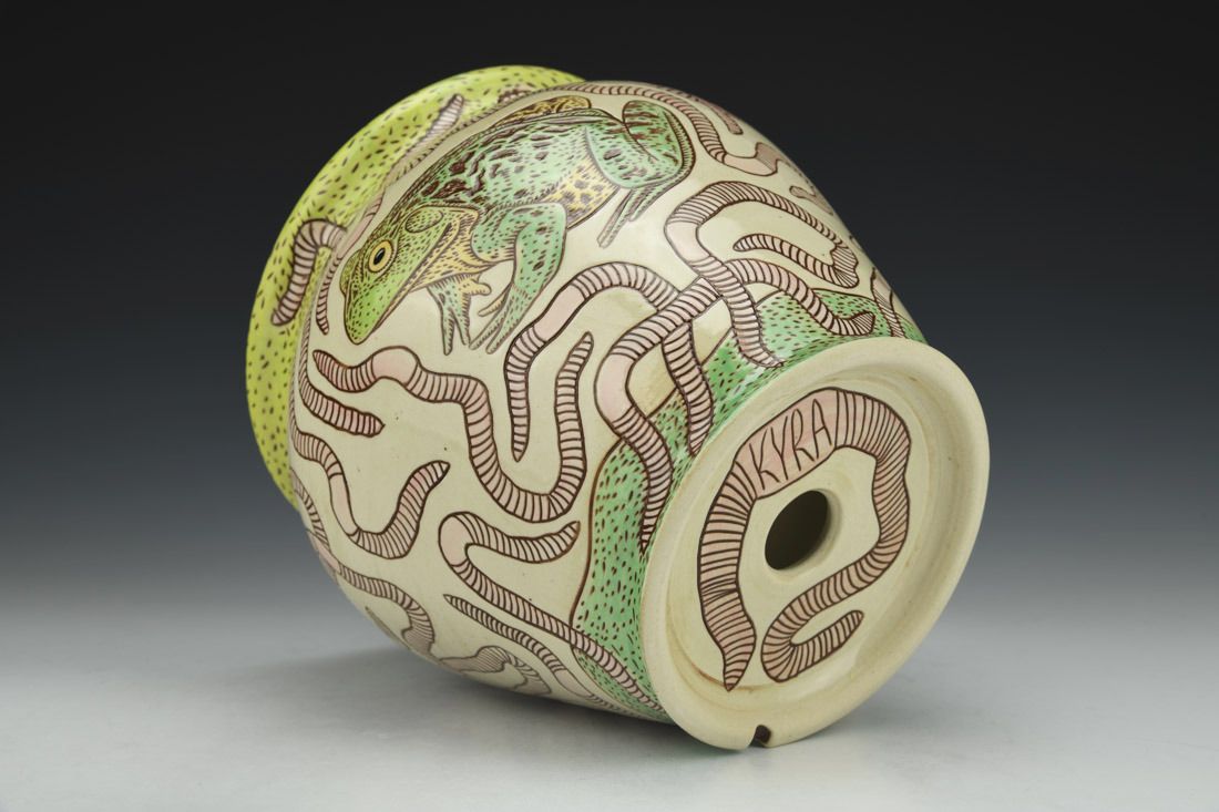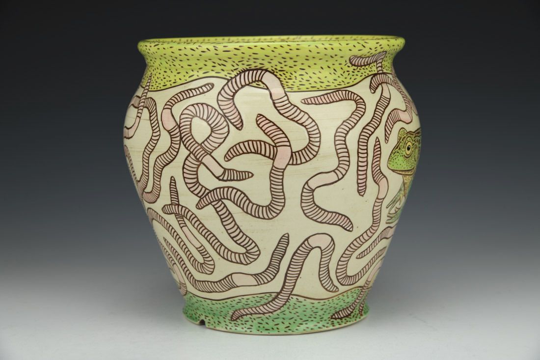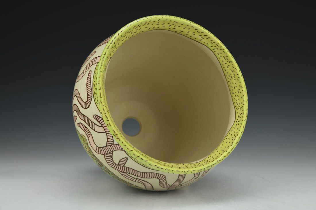White stoneware, wheel thrown, sgraffito, underglaze, clear glaze, cone 6 electric fired, 6.25 x 7 x 7 inches.