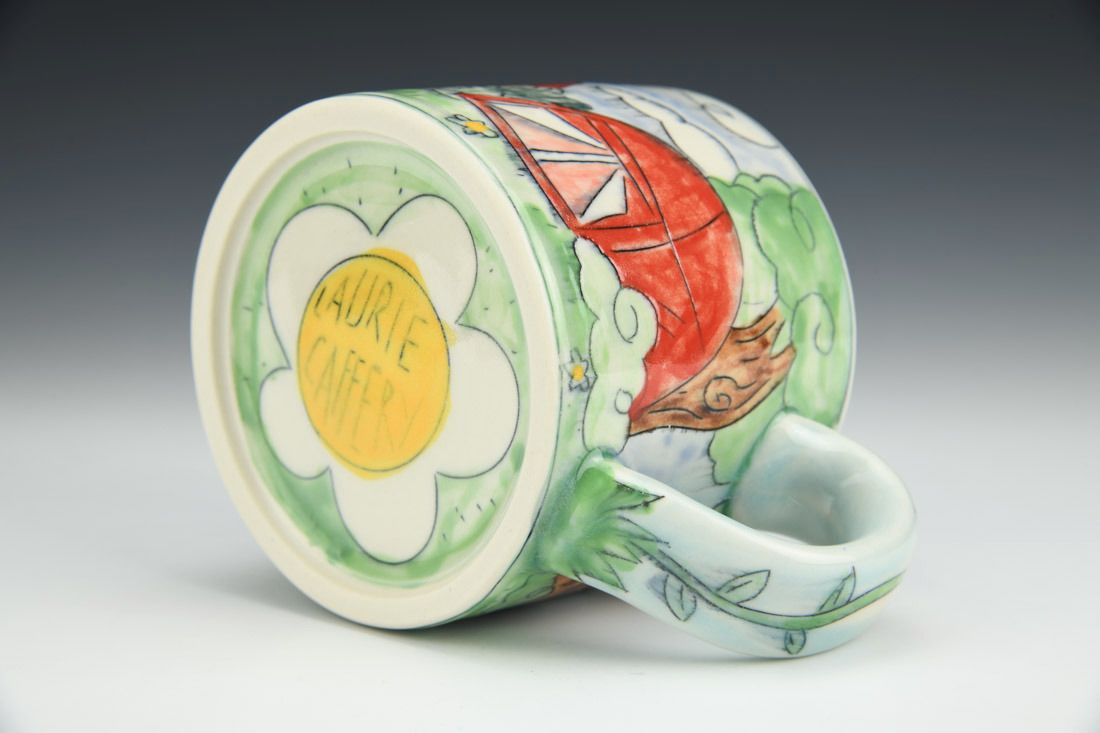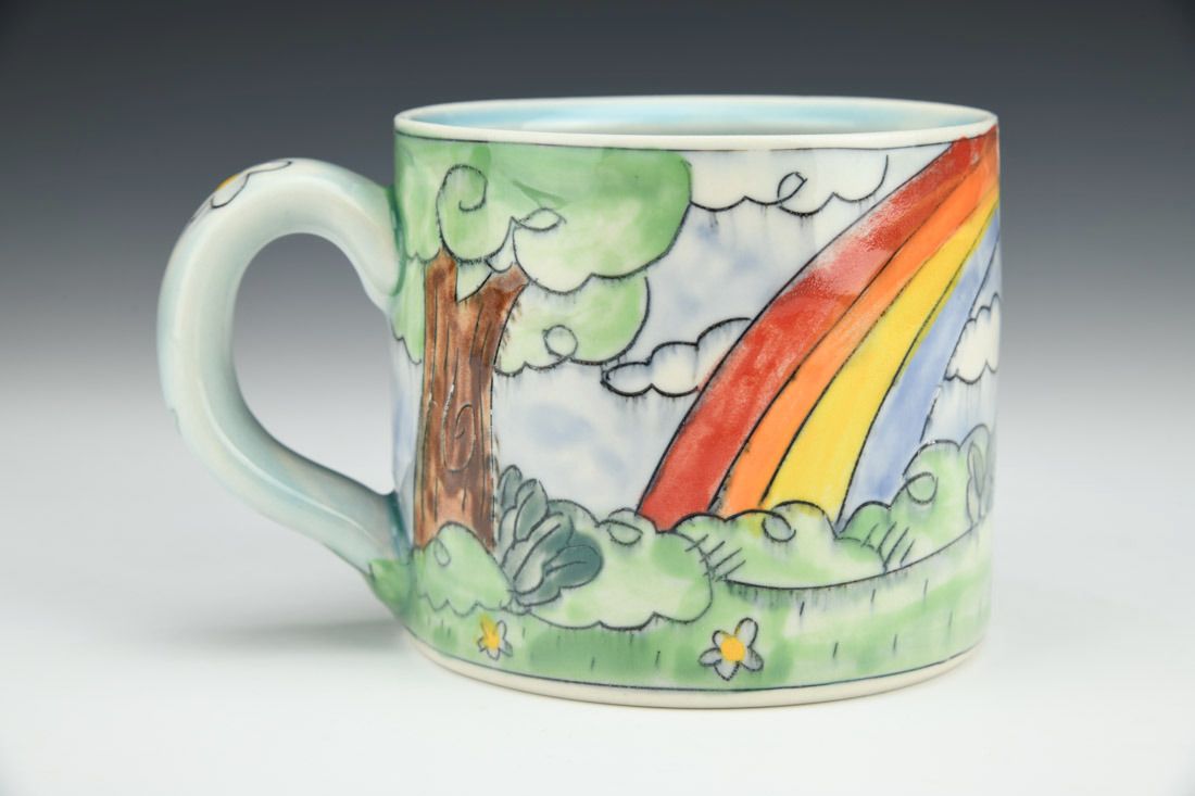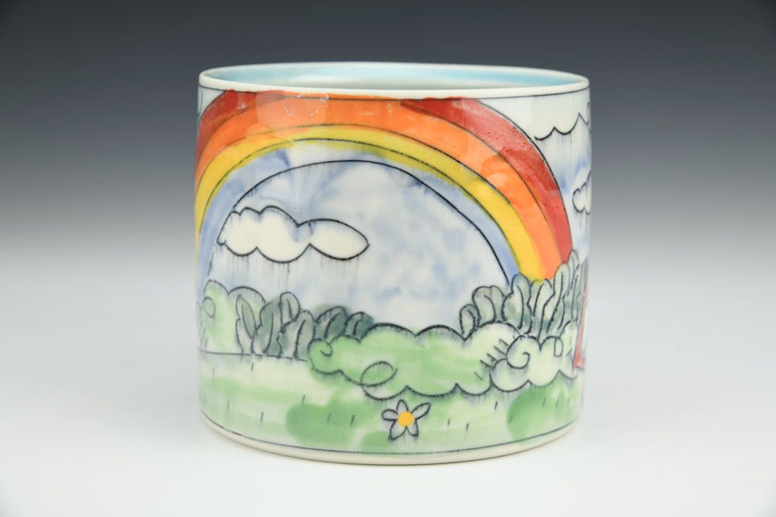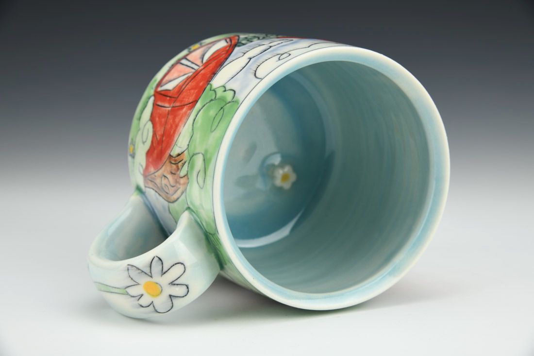 Porcelain, wheel thrown with slipcast handle, inlaid and painted illustrations, underglaze, glaze, cone 6 electric fired, 3.5 x 5.5 x 4 inches.