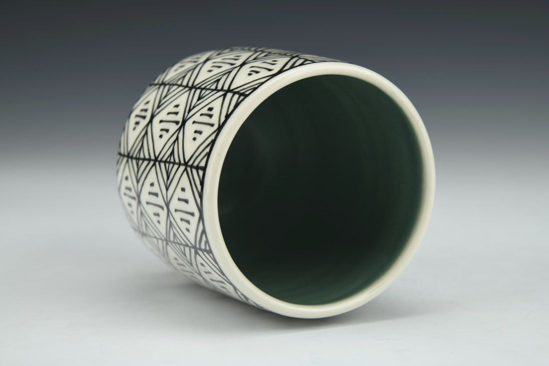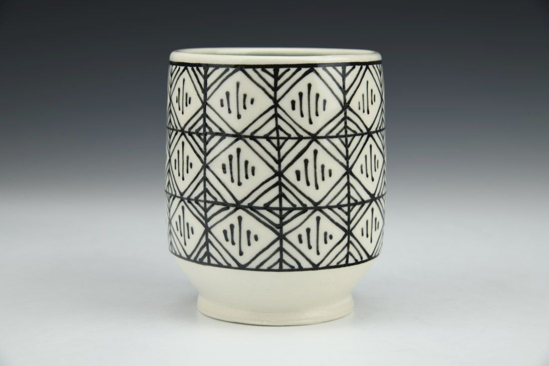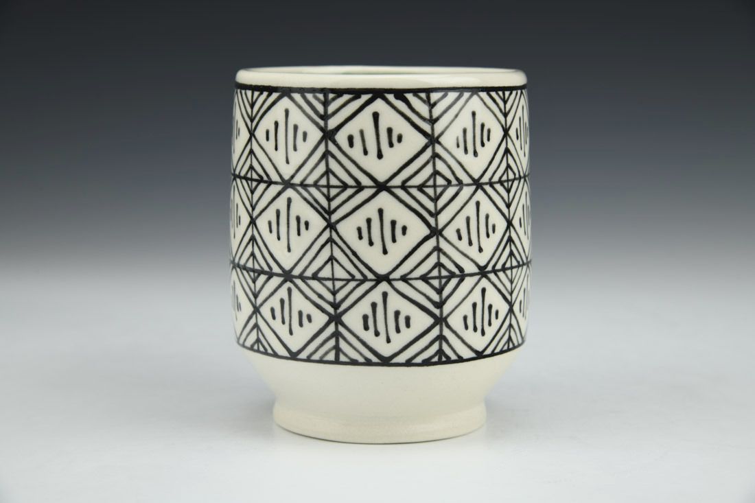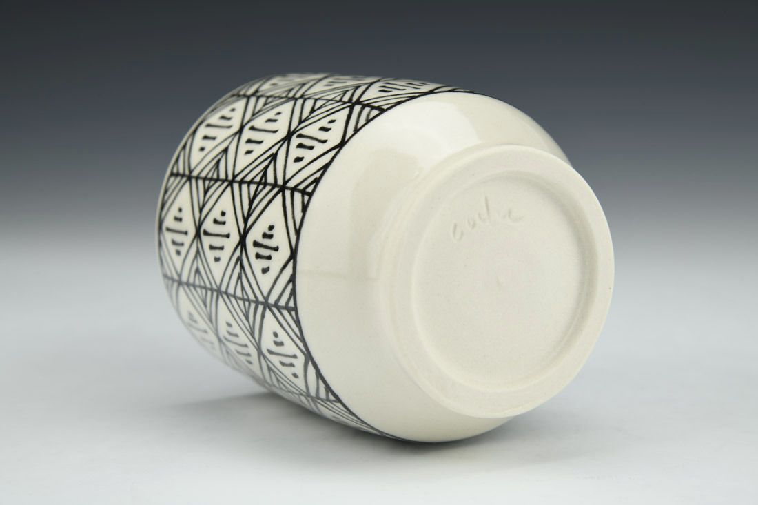 Porcelain, wheel thrown, hand drawn, underglaze, cone 6 fired, 3.75 x 3.25 x 3.25 inches.