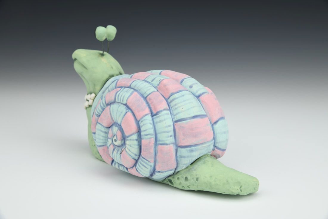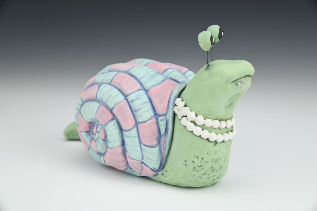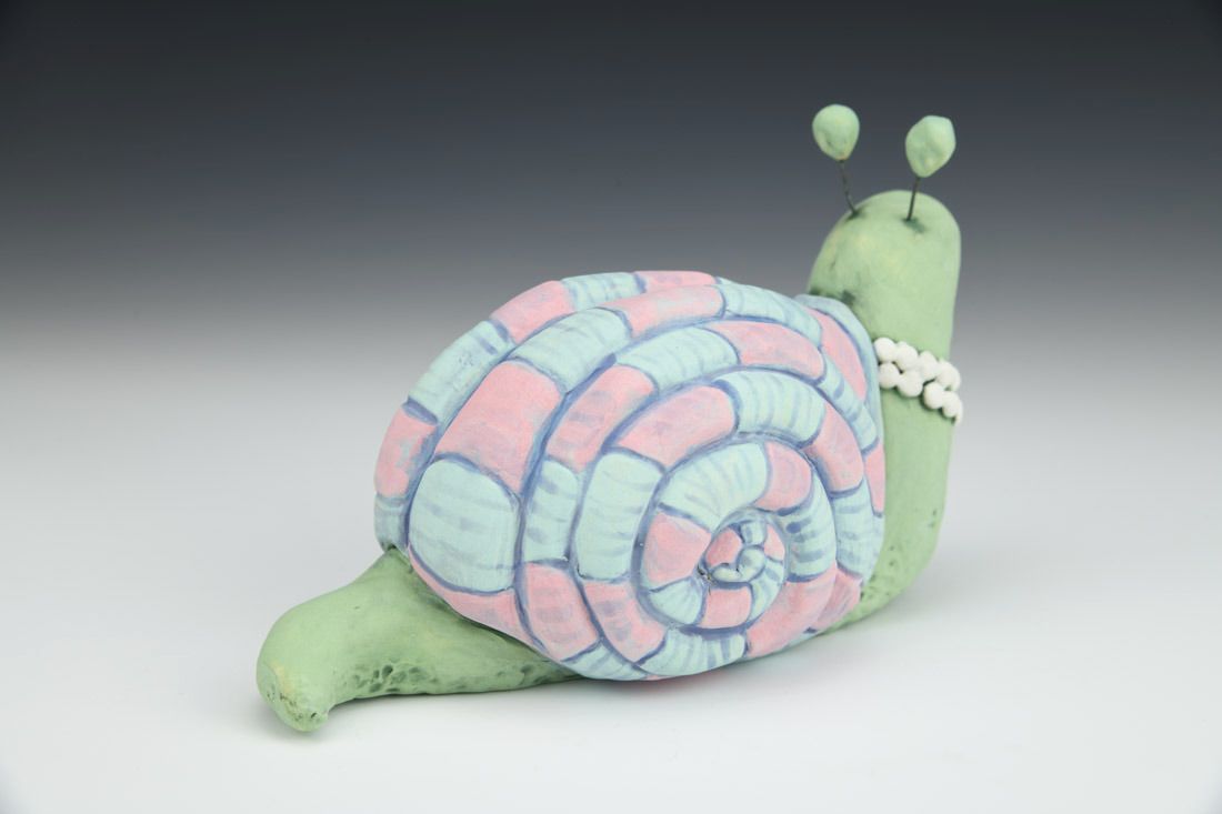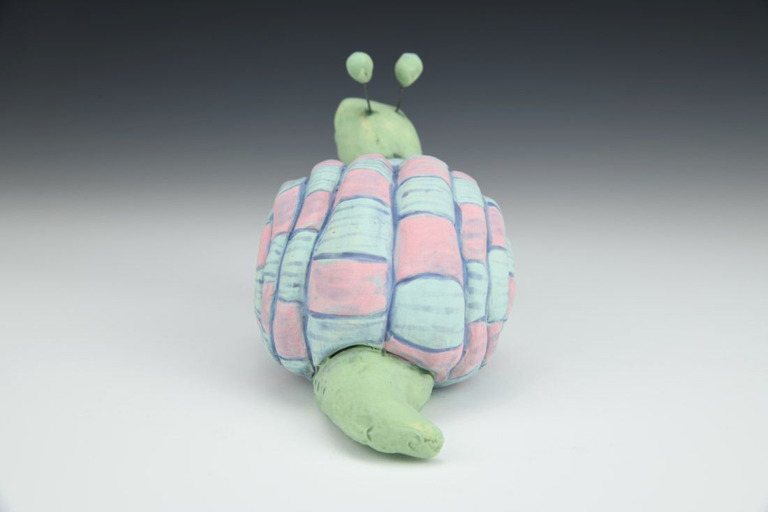 Stoneware with nichrome wire, hand built with coils and pinched, carved, painted underglazes, 4 x 4.25 x 3.25 inches.