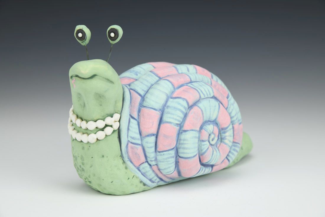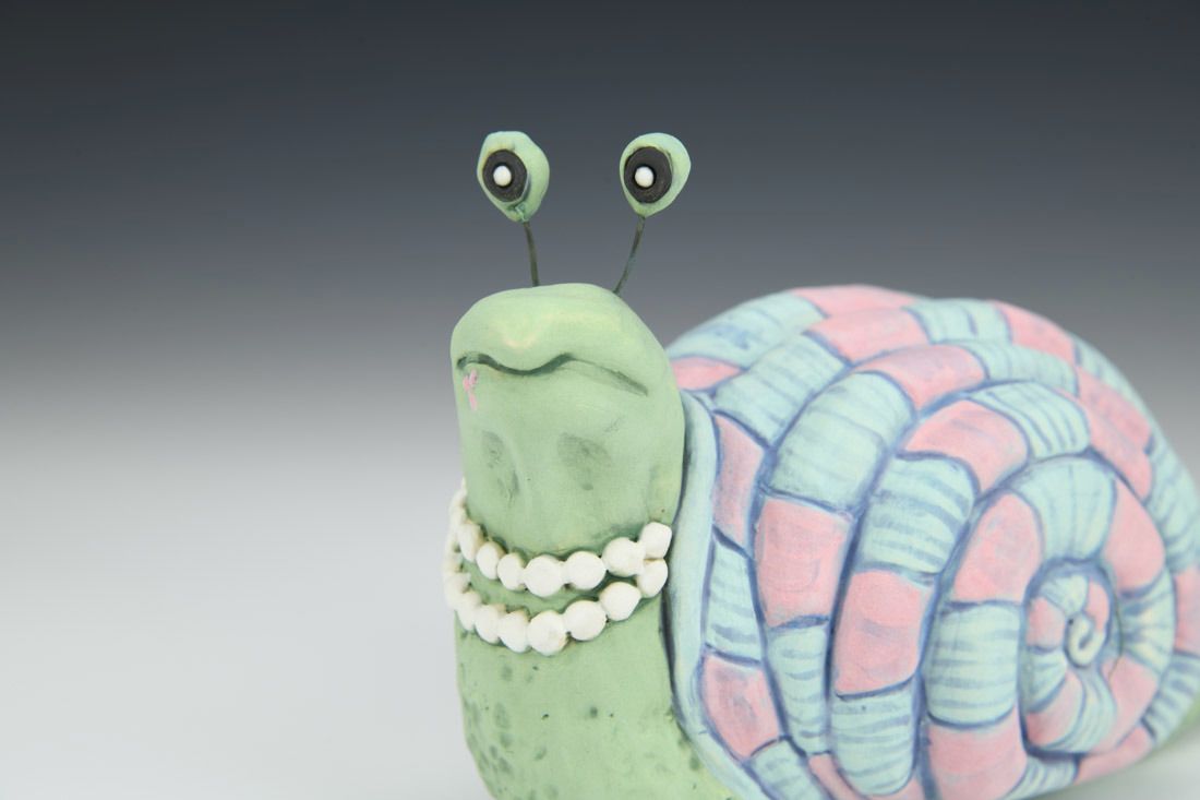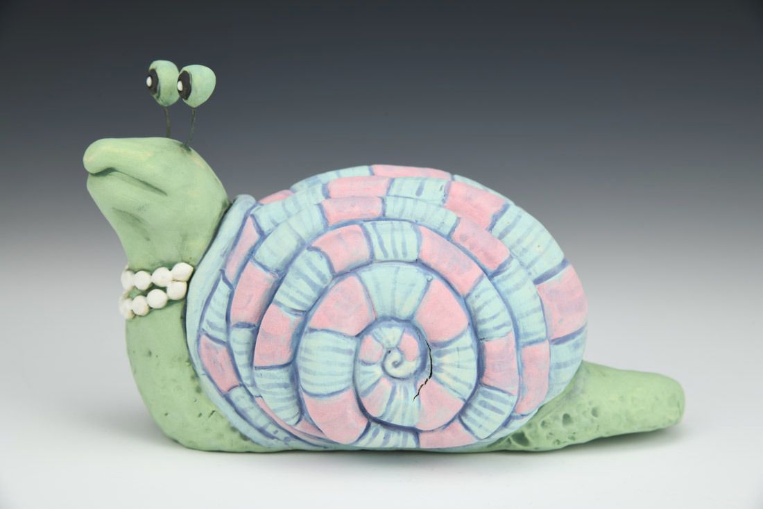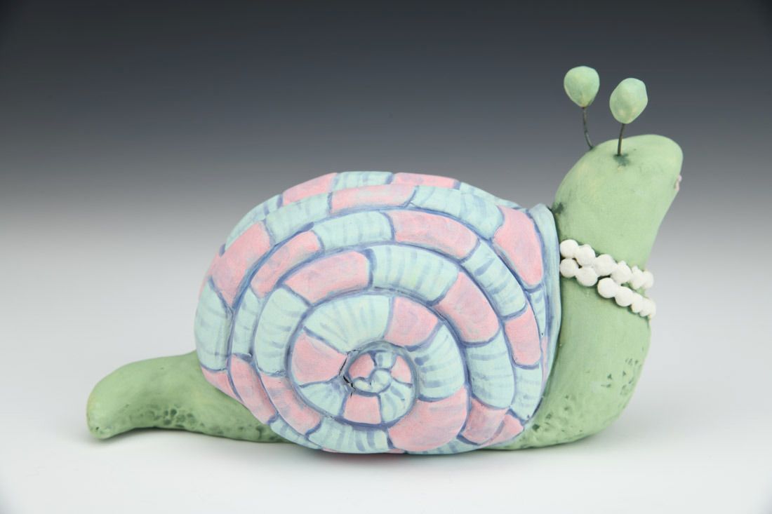 Stoneware with nichrome wire, hand built with coils and pinched, carved, painted underglazes, 4 x 4.25 x 3.25 inches.