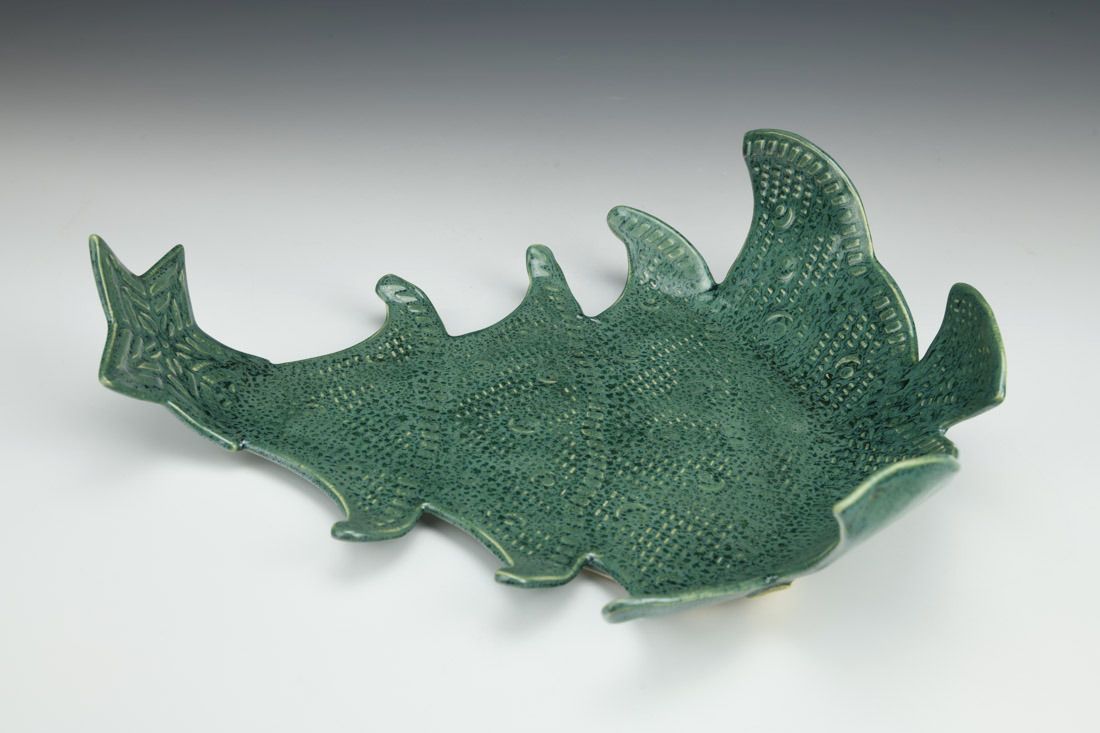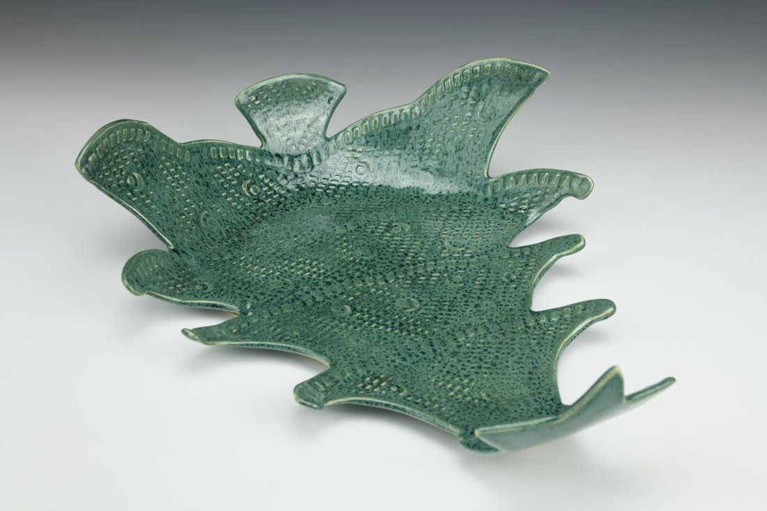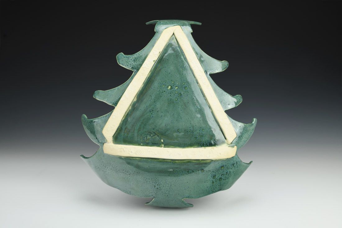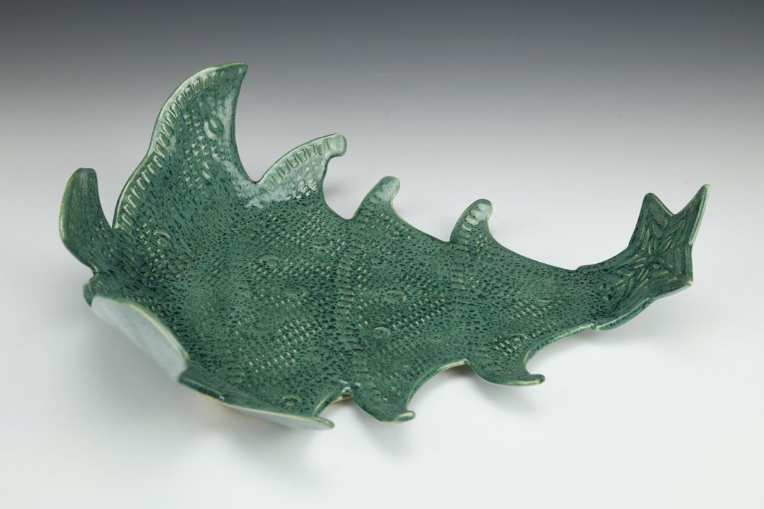 White stoneware, hand built, glaze, cone 5 fired, 3 x 11 x 12 inches.
