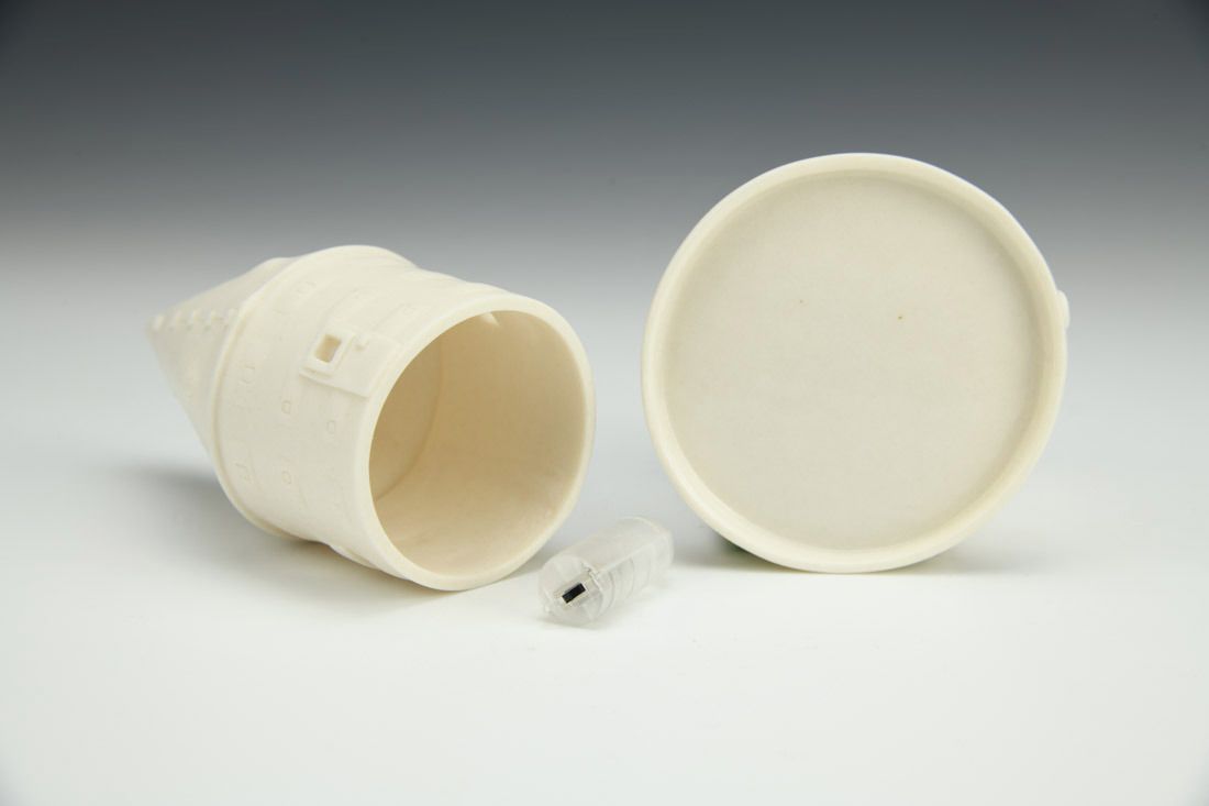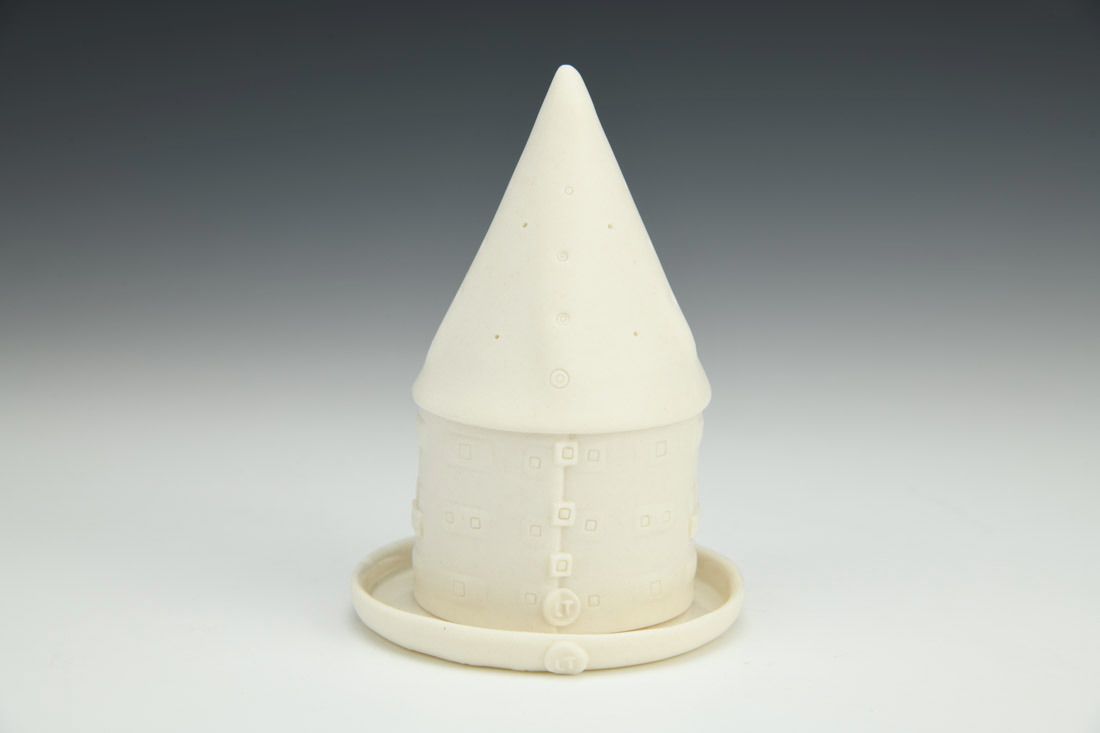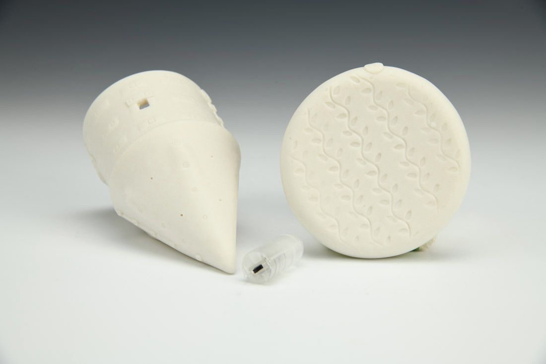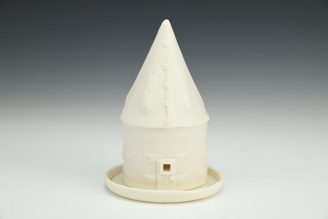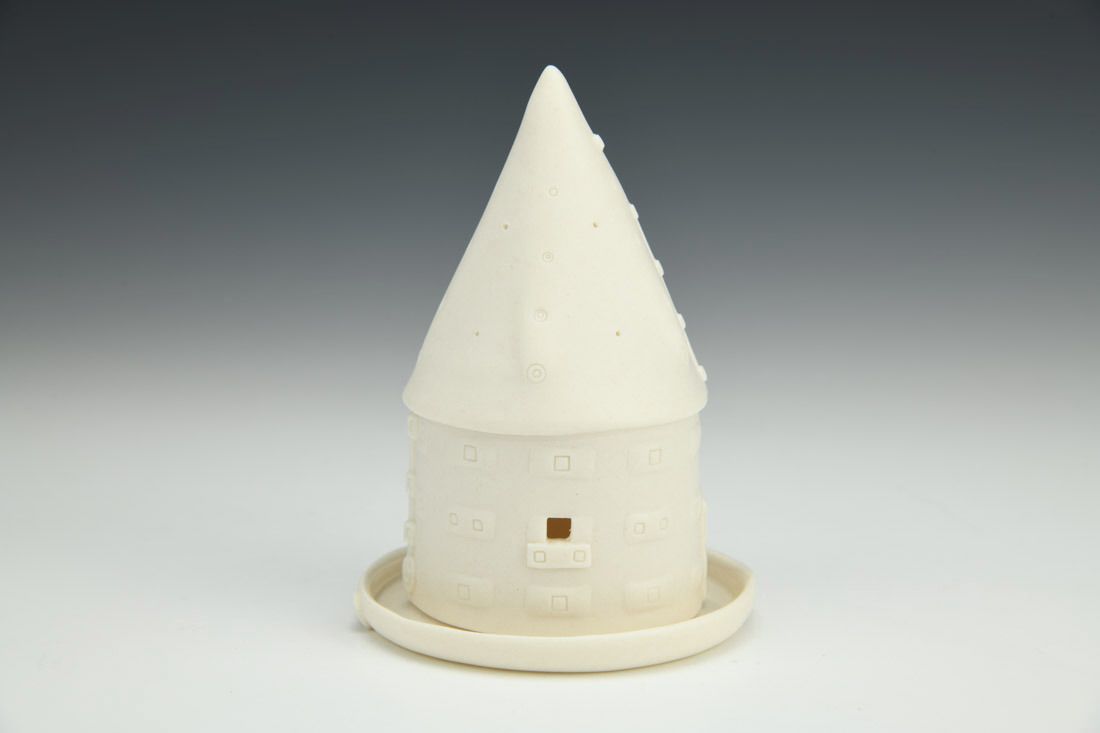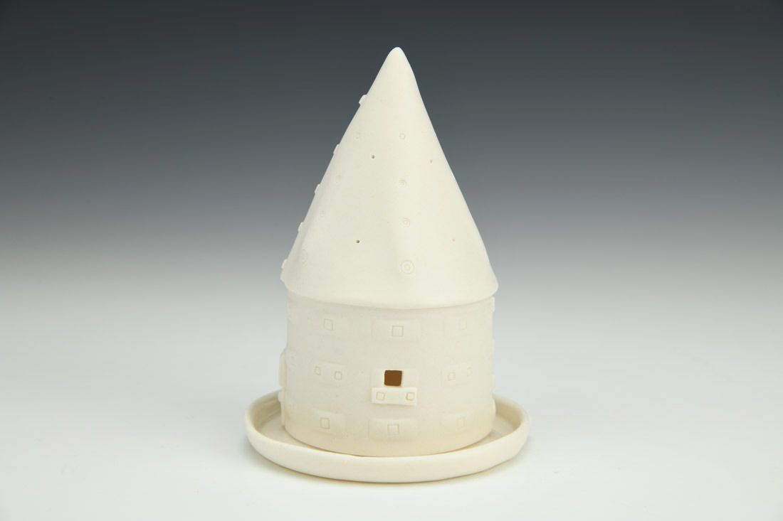 Porcelain with battery operated LED, hand built with slabs, clear glaze, cone 6 electric fired, 4 x 3 x 3 inches.