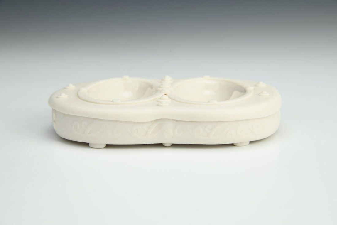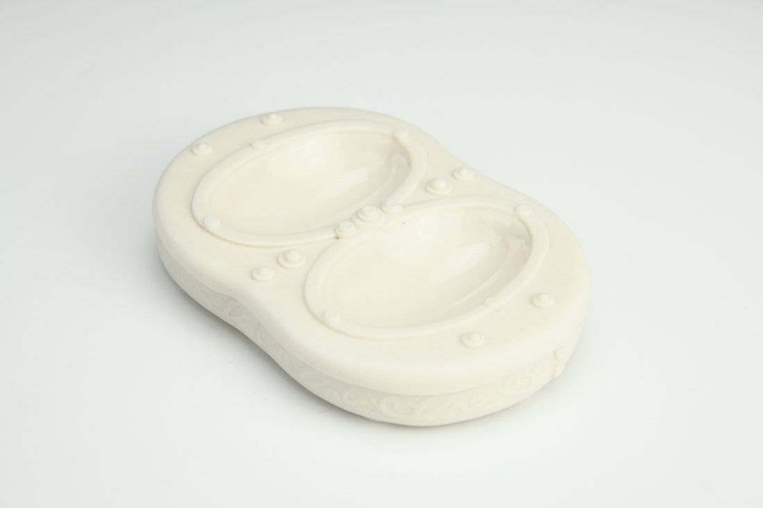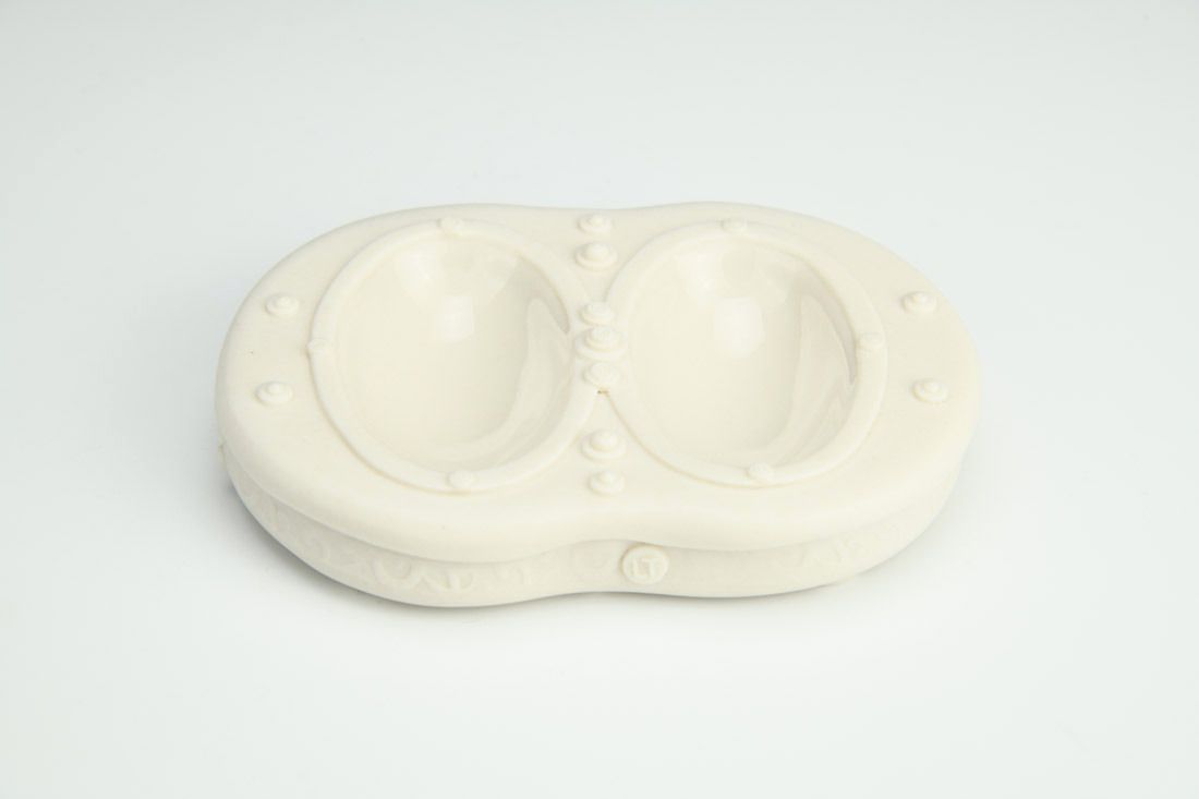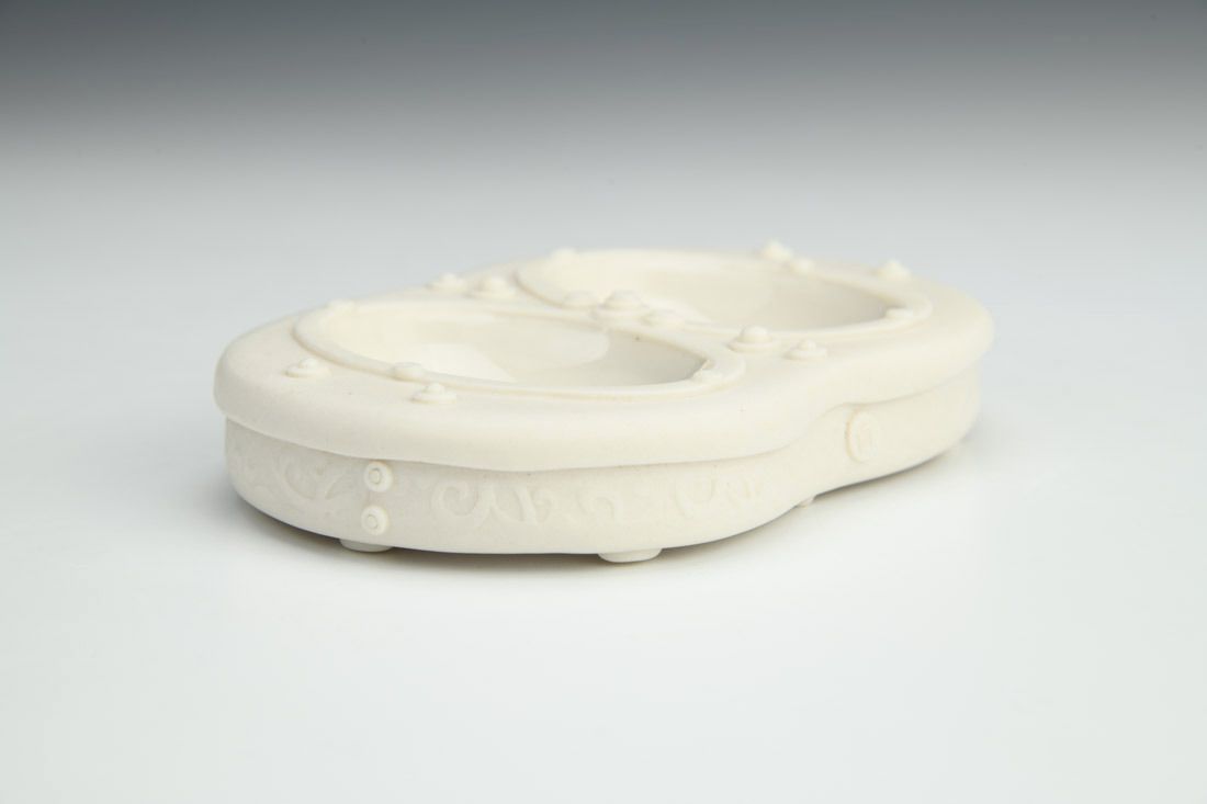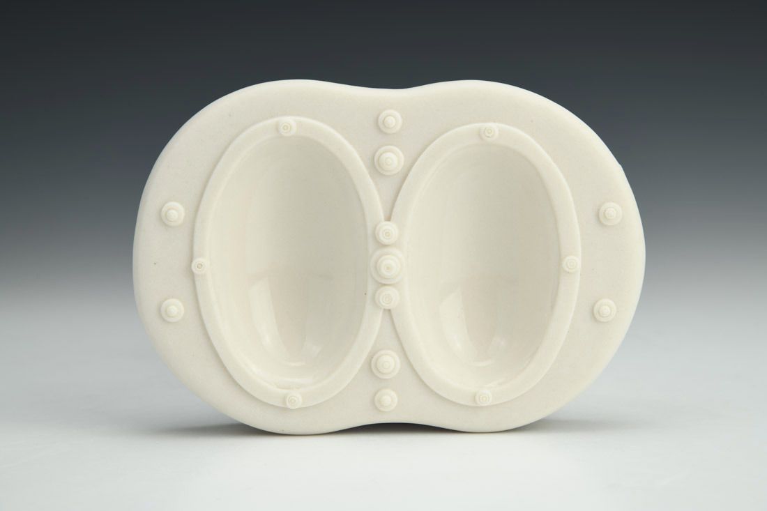 Porcelain, hand built with slabs and sculptural elements, clear glaze, mid range fired, 0.5 x 3.25 x 4.75 inches.