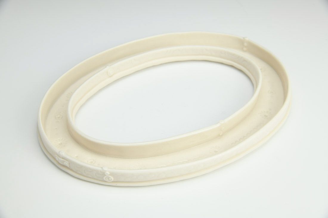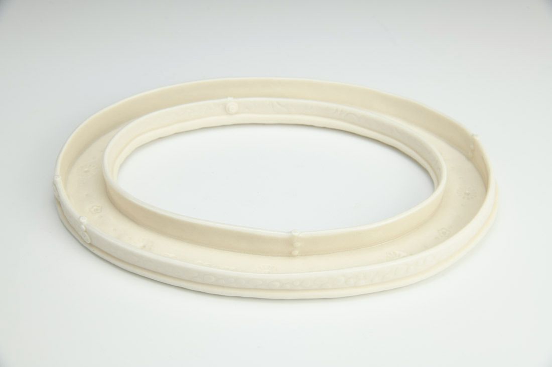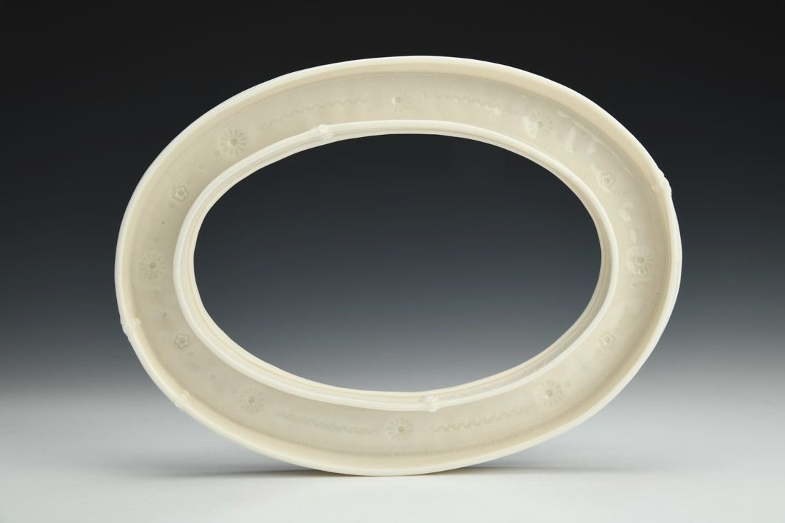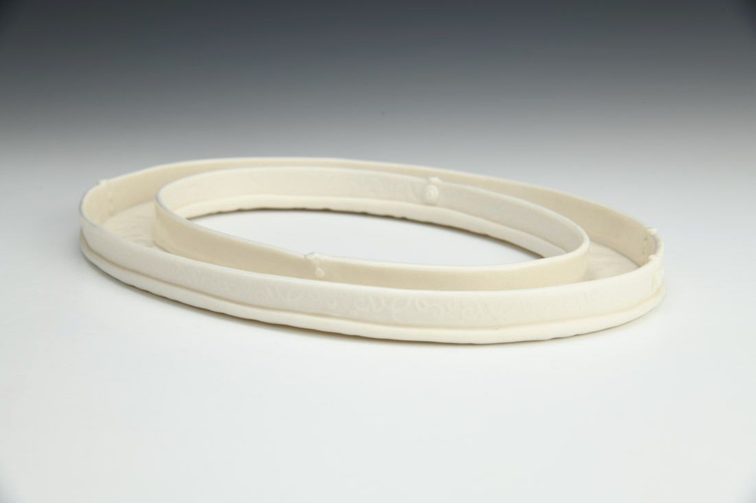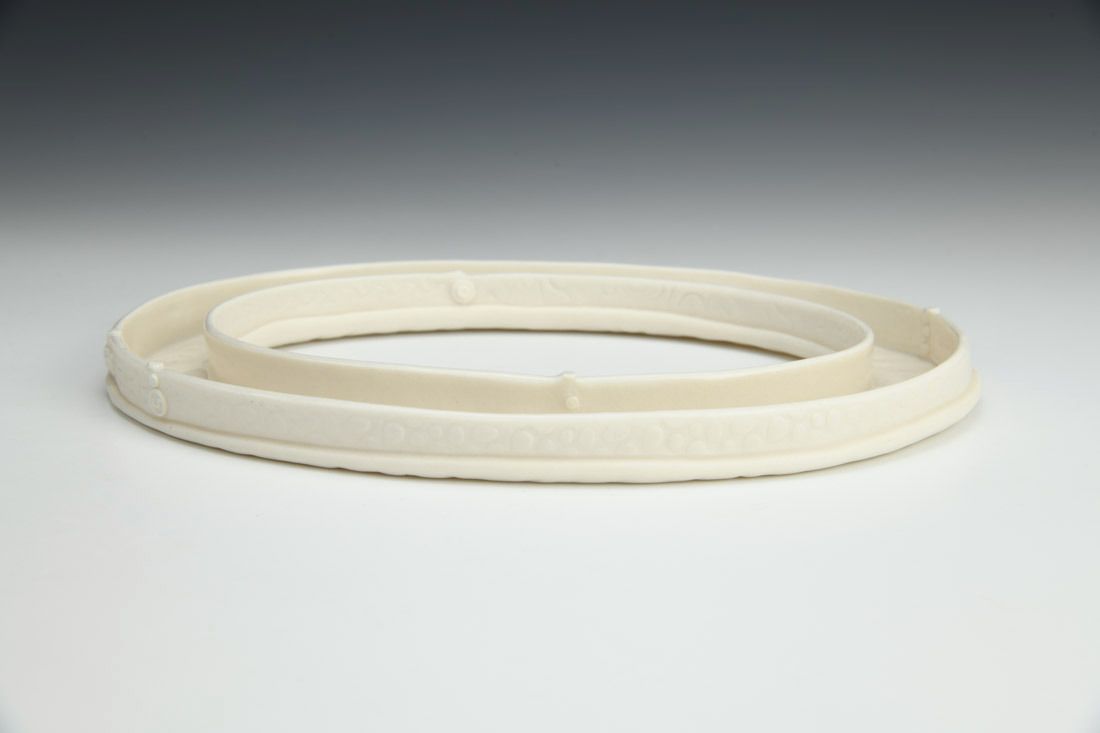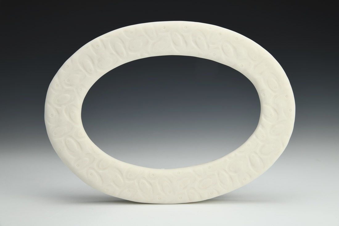 Porcelain, hand built with slabs and sculptural elements, clear glaze, mid range fired, 0.5 x 6.5 x 9 inches.