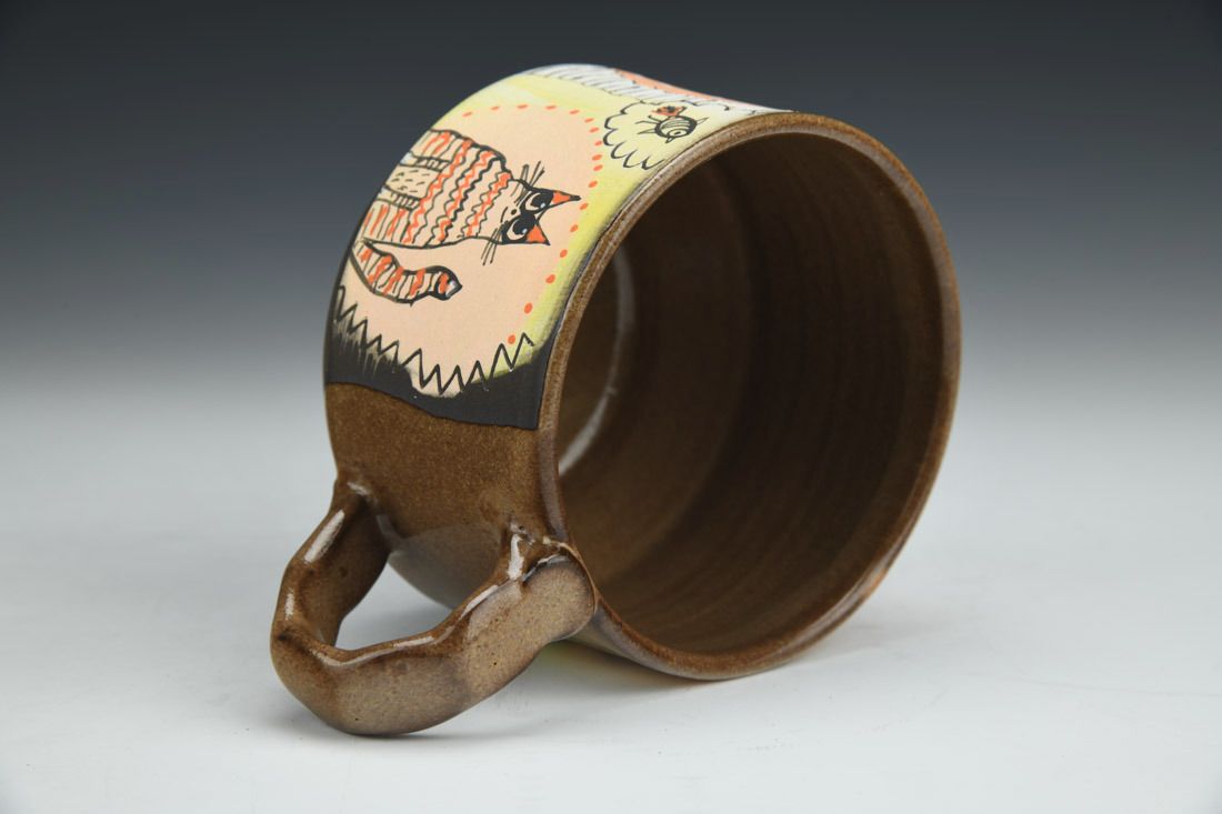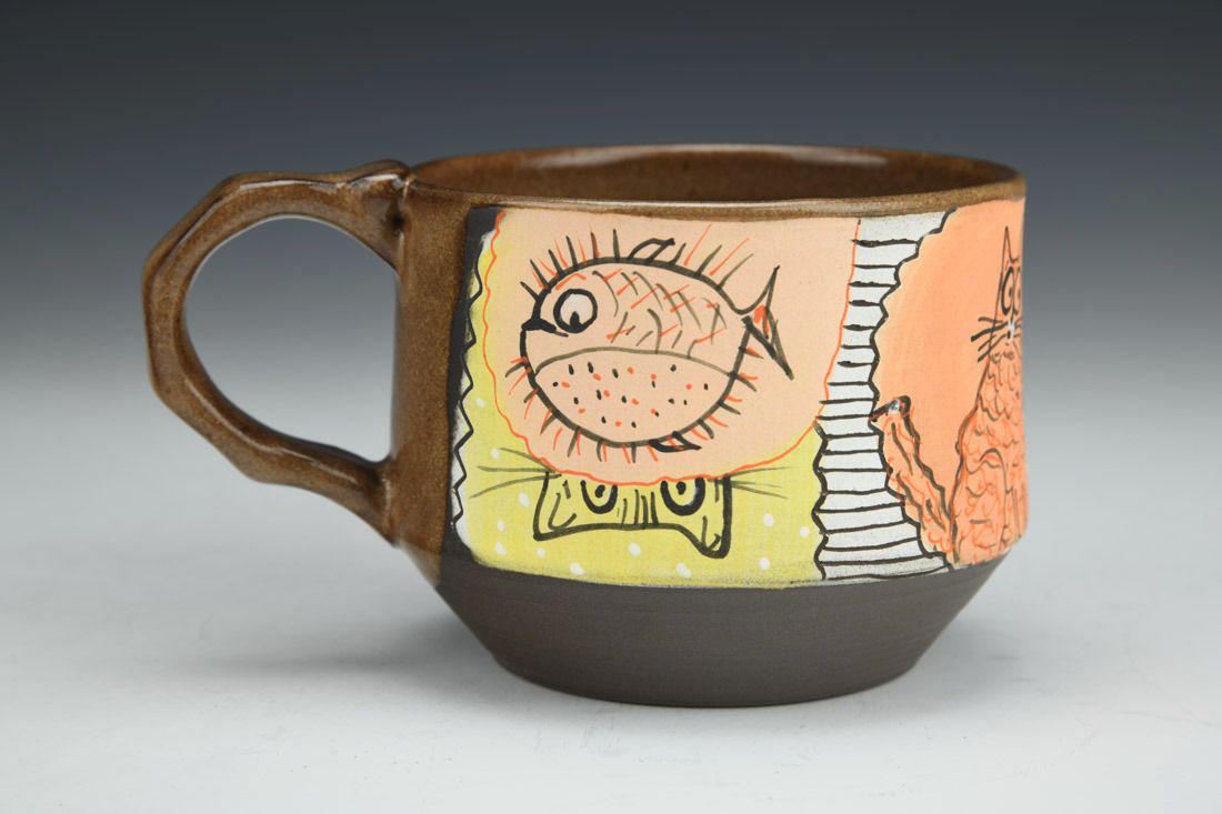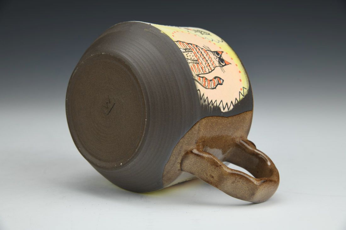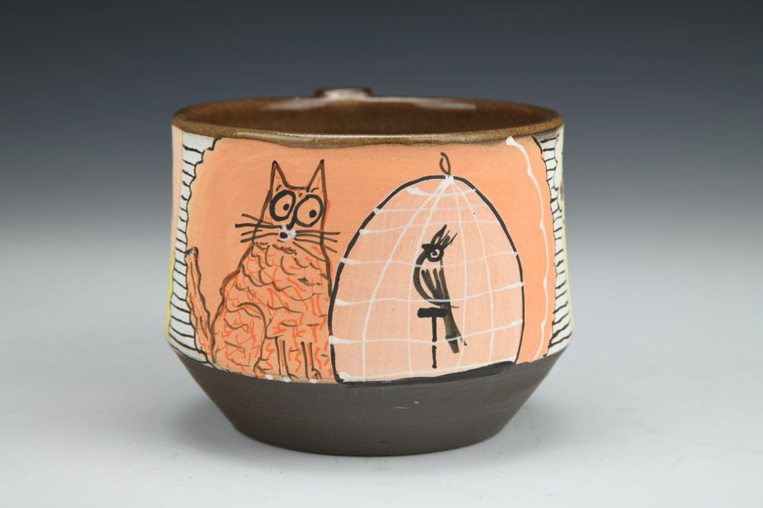 Stoneware, wheel thrown, hand carved, hand painted, underglaze, glaze, cone 6 fired, 3 x 5.25 x 3.75 inches.