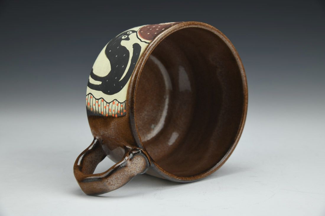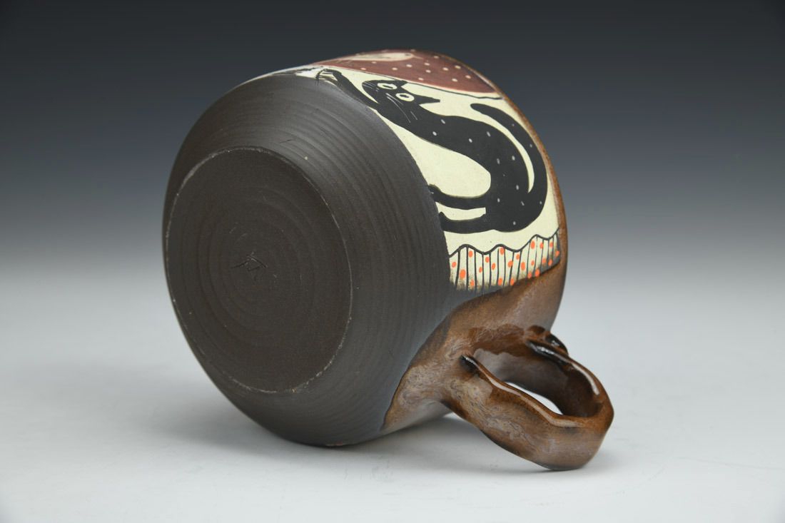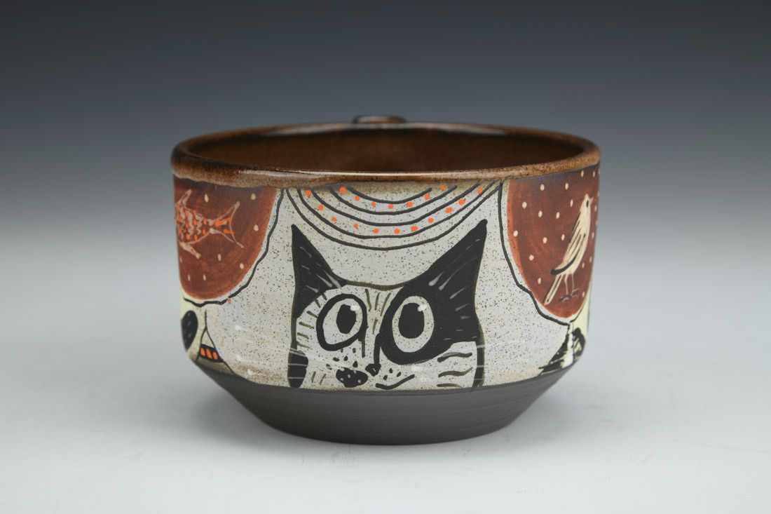 Stoneware, wheel thrown, hand carved, hand painted, underglaze, glaze, cone 6 fired, 2.75 x 5.25 x 4 inches.