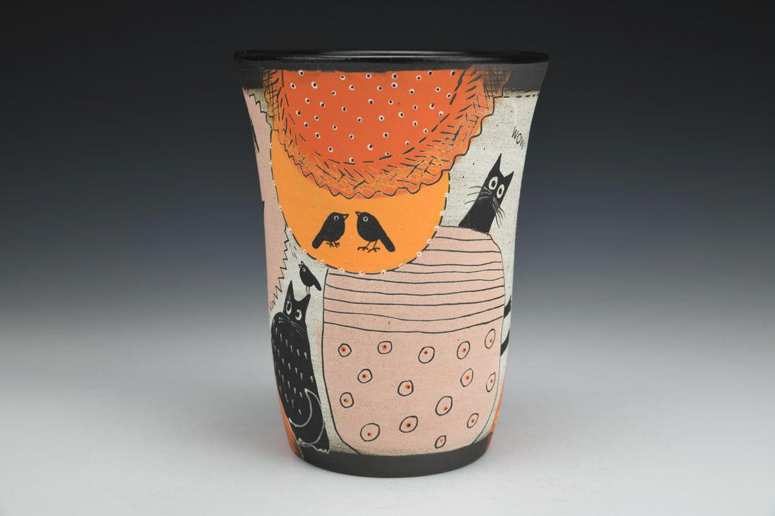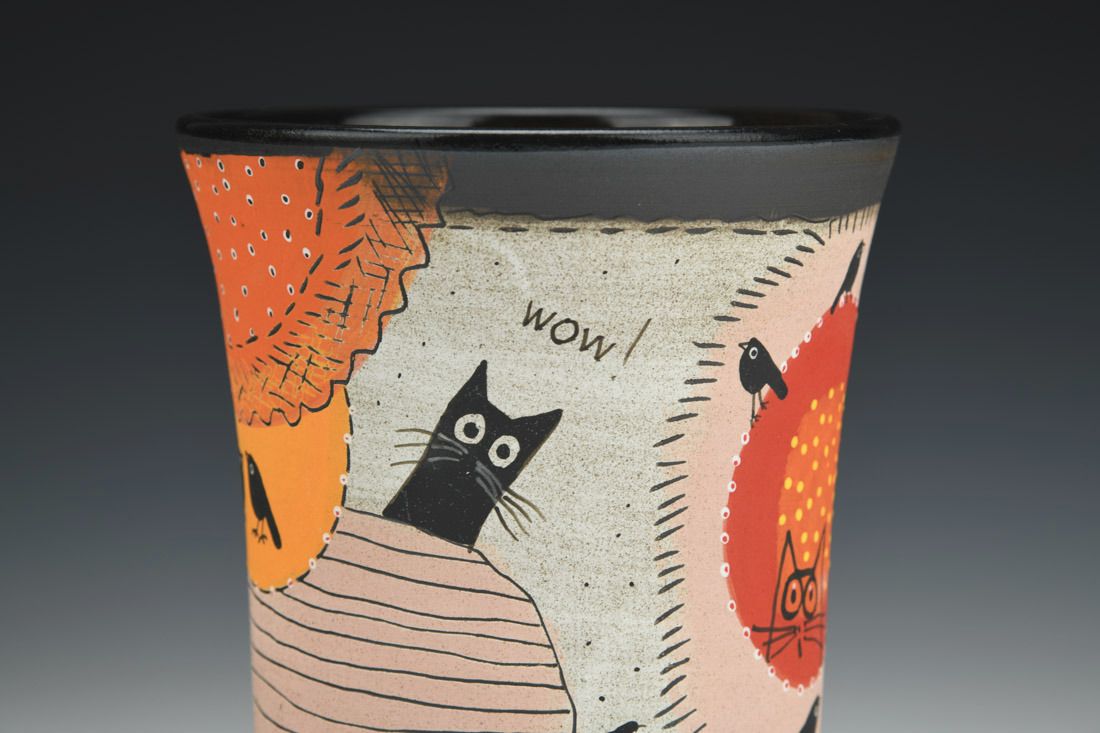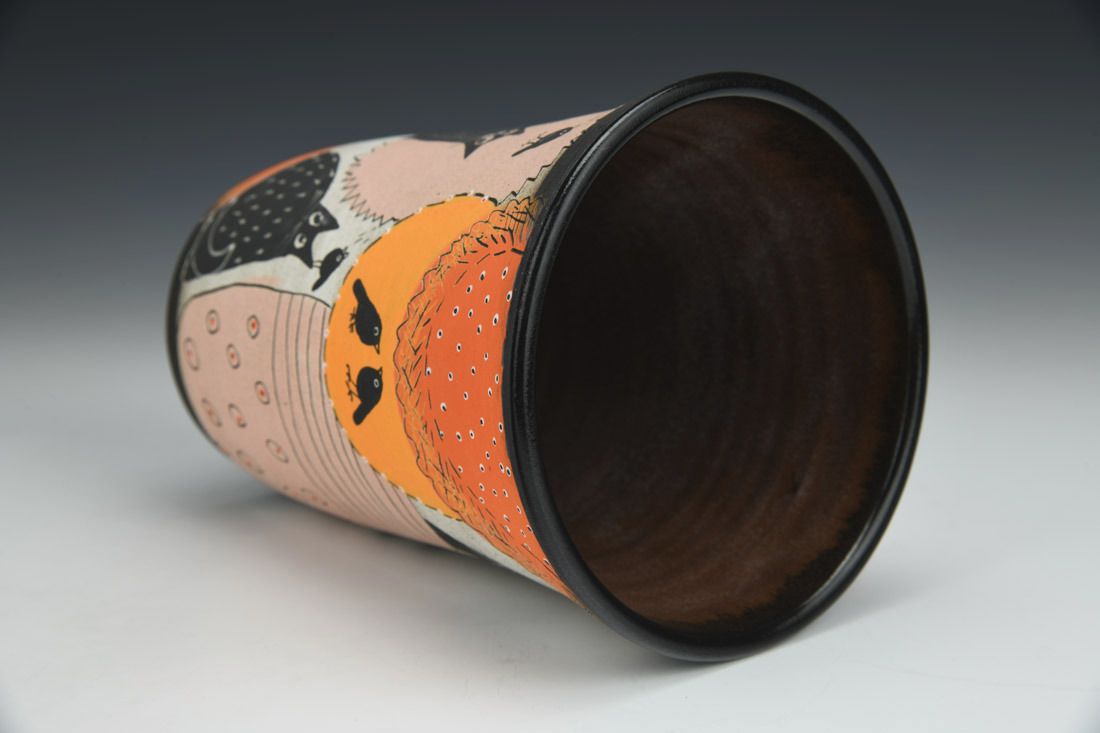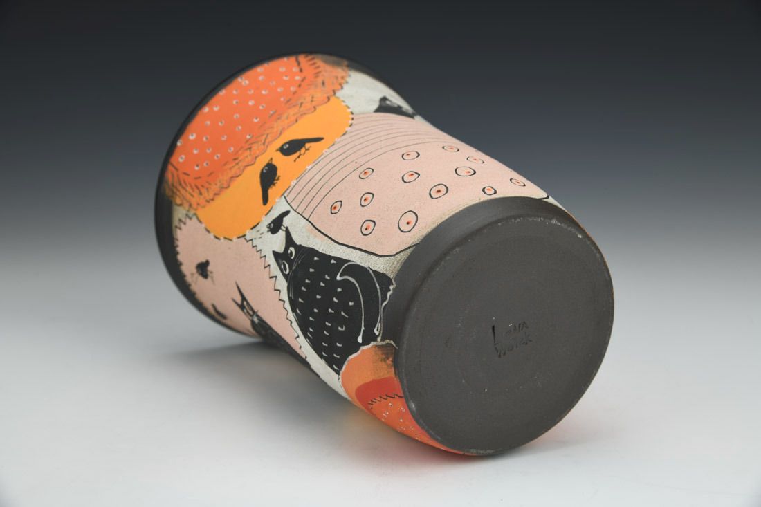 Stoneware, wheel thrown, hand carved, hand painted, underglaze, glaze, cone 6 fired, 6.5 x 5 x 5 inches.
