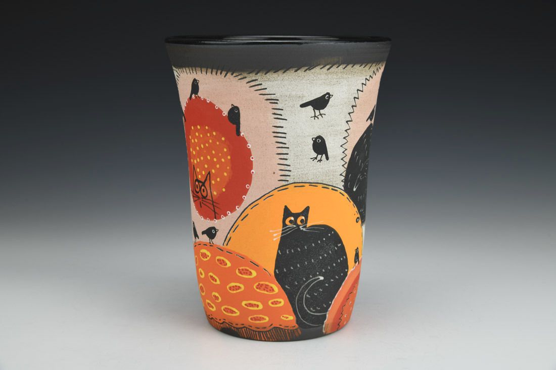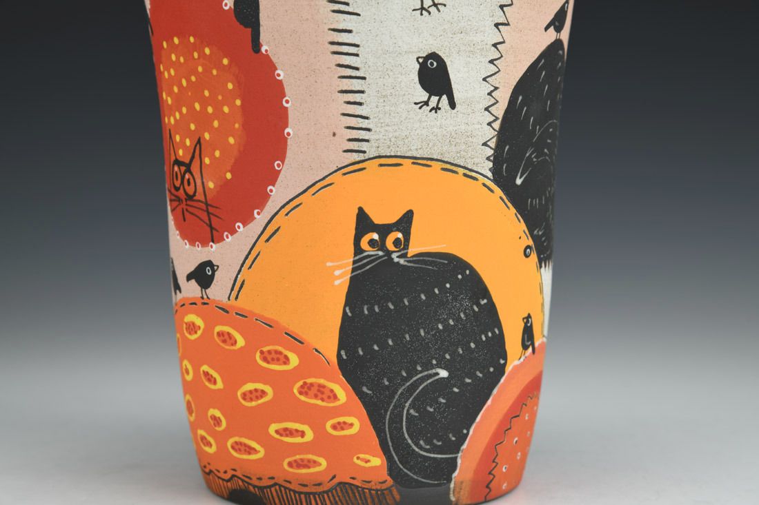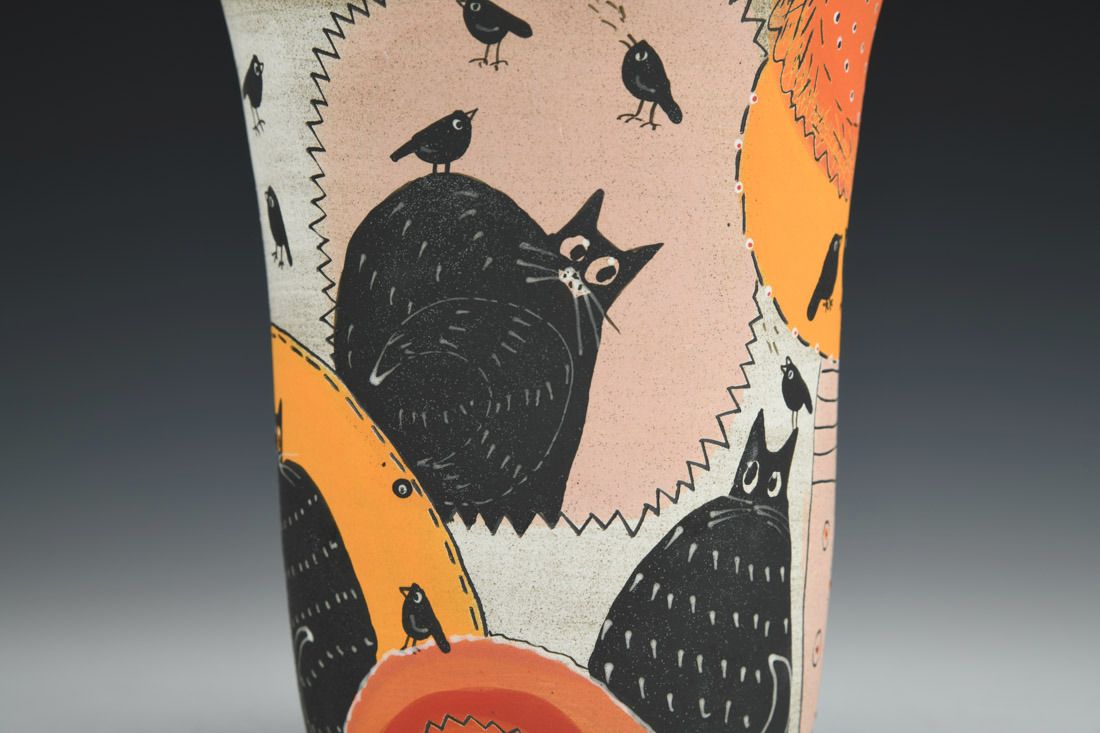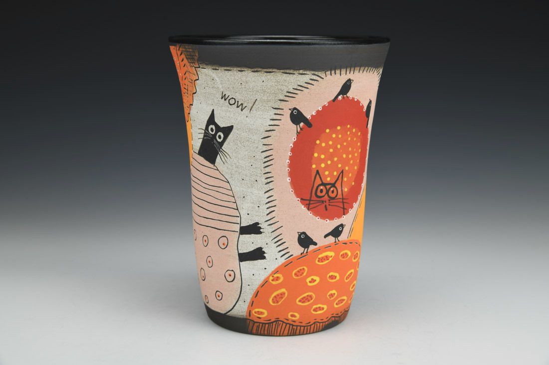 Stoneware, wheel thrown, hand carved, hand painted, underglaze, glaze, cone 6 fired, 6.5 x 5 x 5 inches.