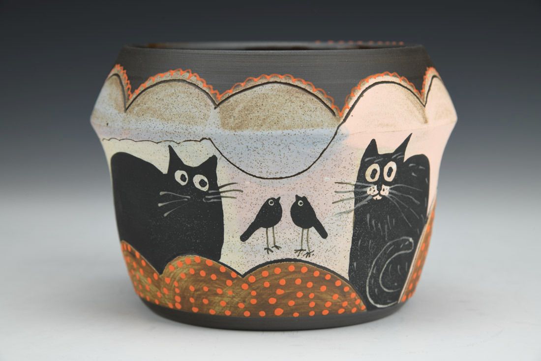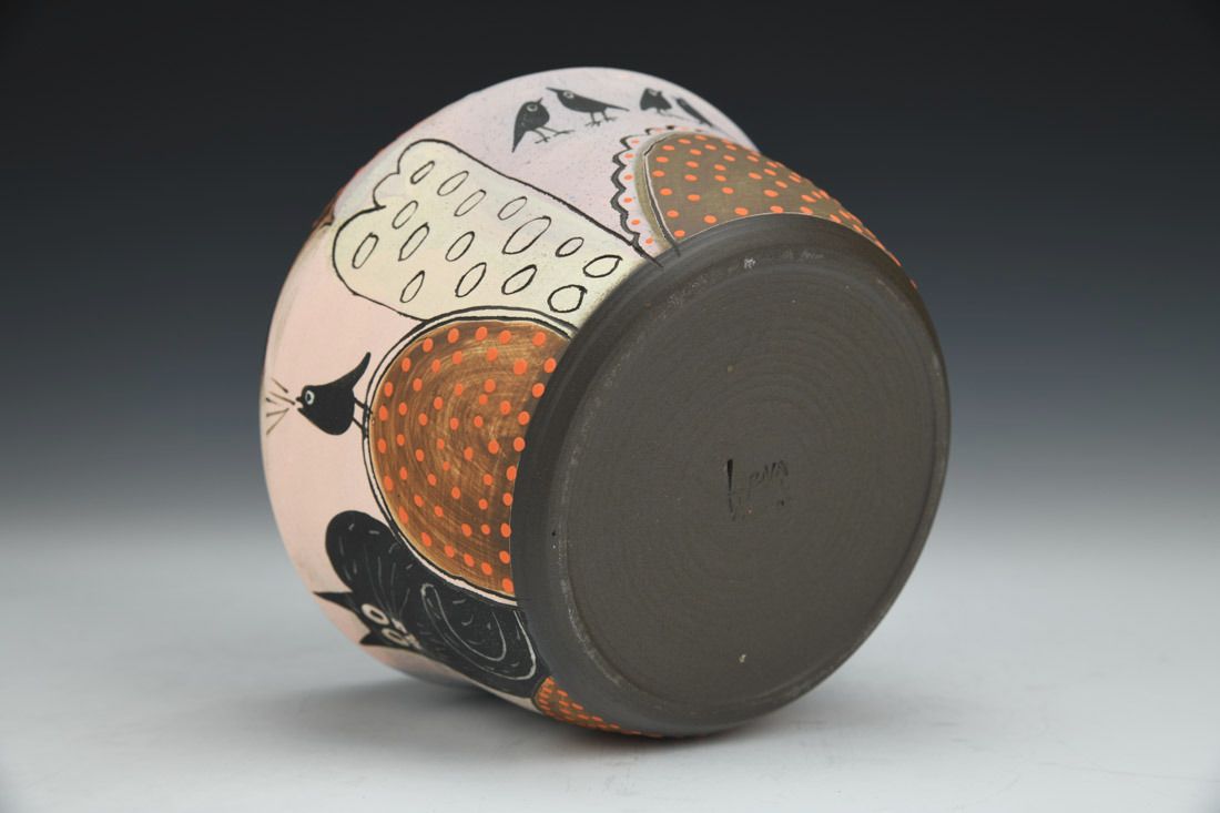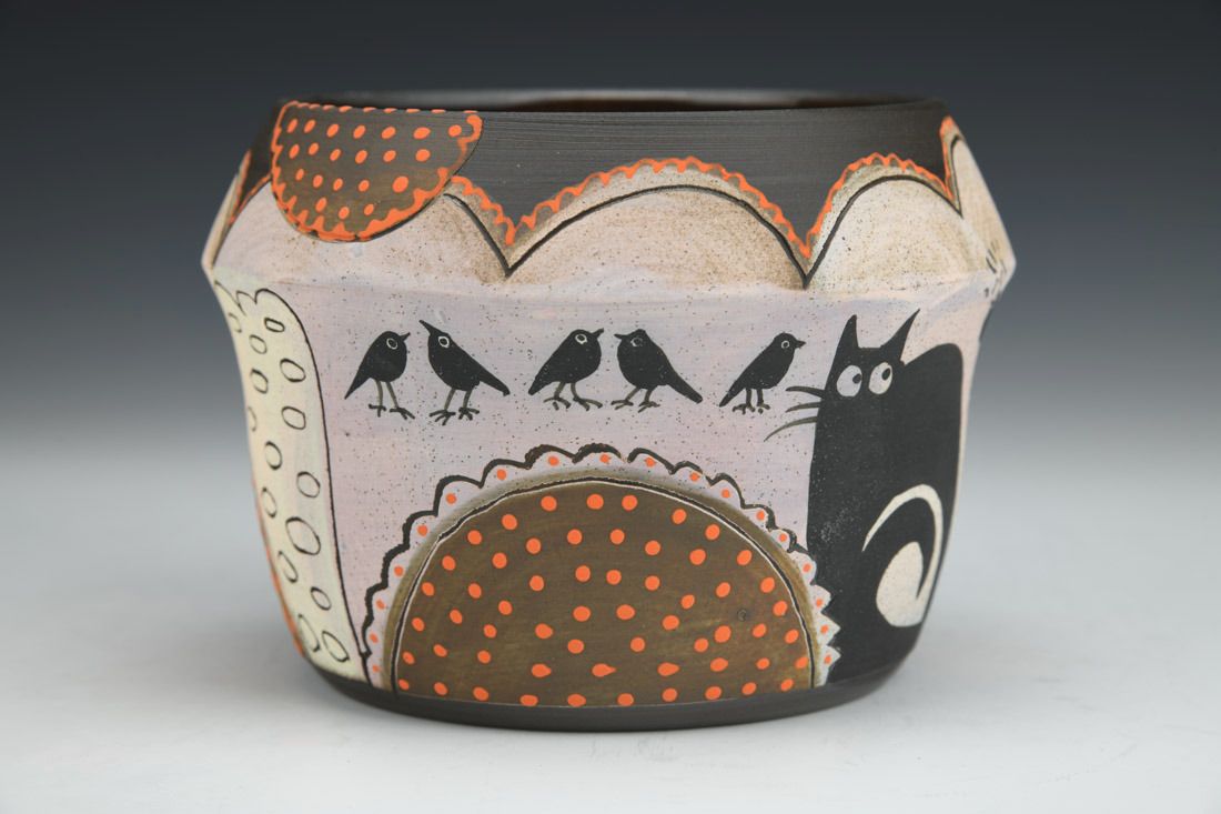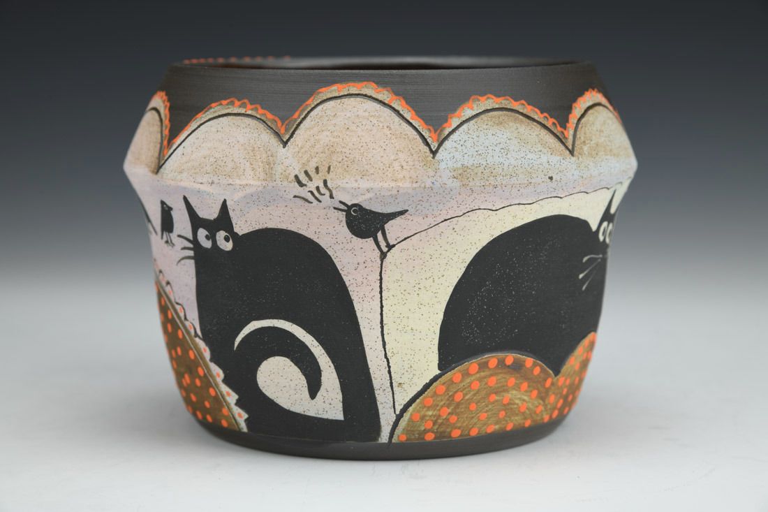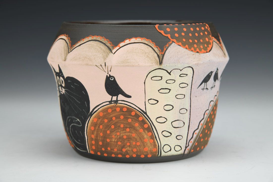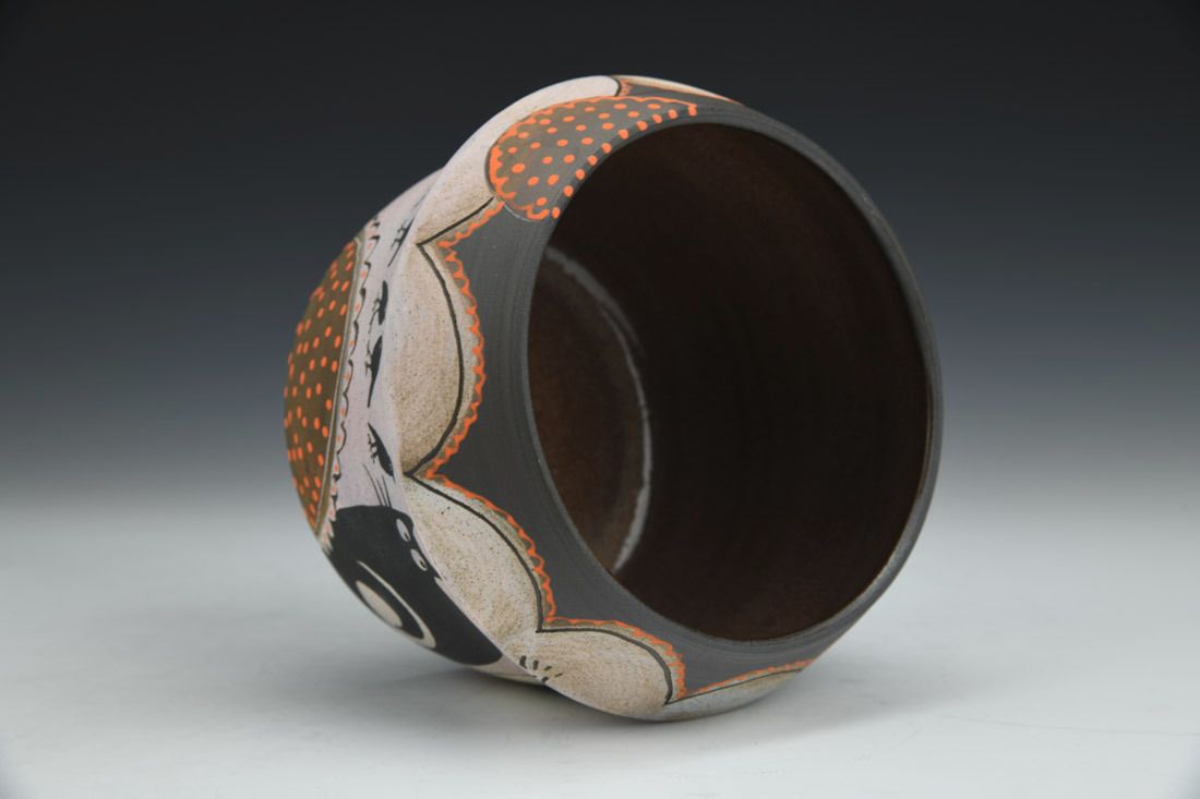 Stoneware, wheel thrown, hand carved, hand painted, underglaze, glaze, cone 6 fired, 3.75 x 5 x 5 inches.