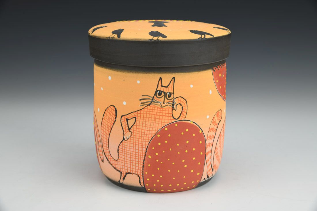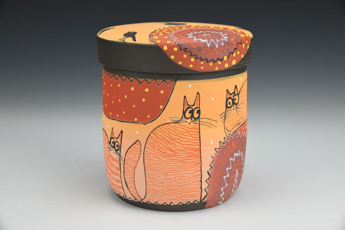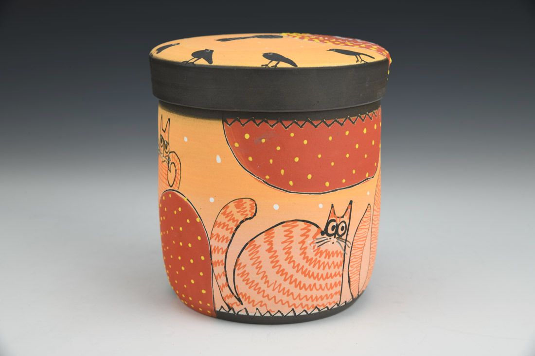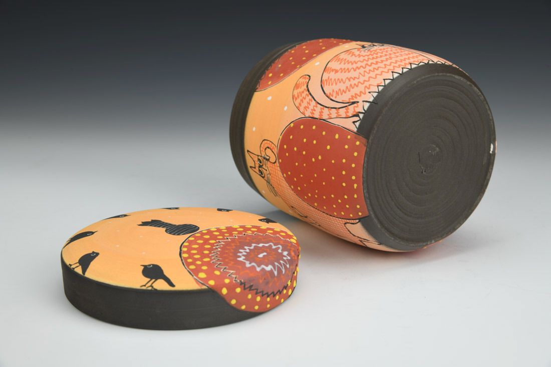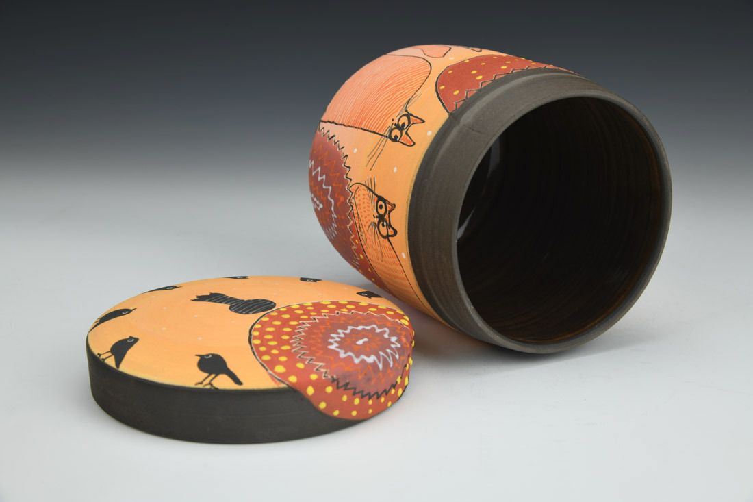 Stoneware, wheel thrown, hand carved, hand painted, underglaze, glaze, cone 6 fired, 5 x 4.5 x 4.5 inches.