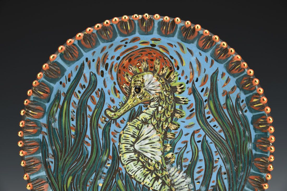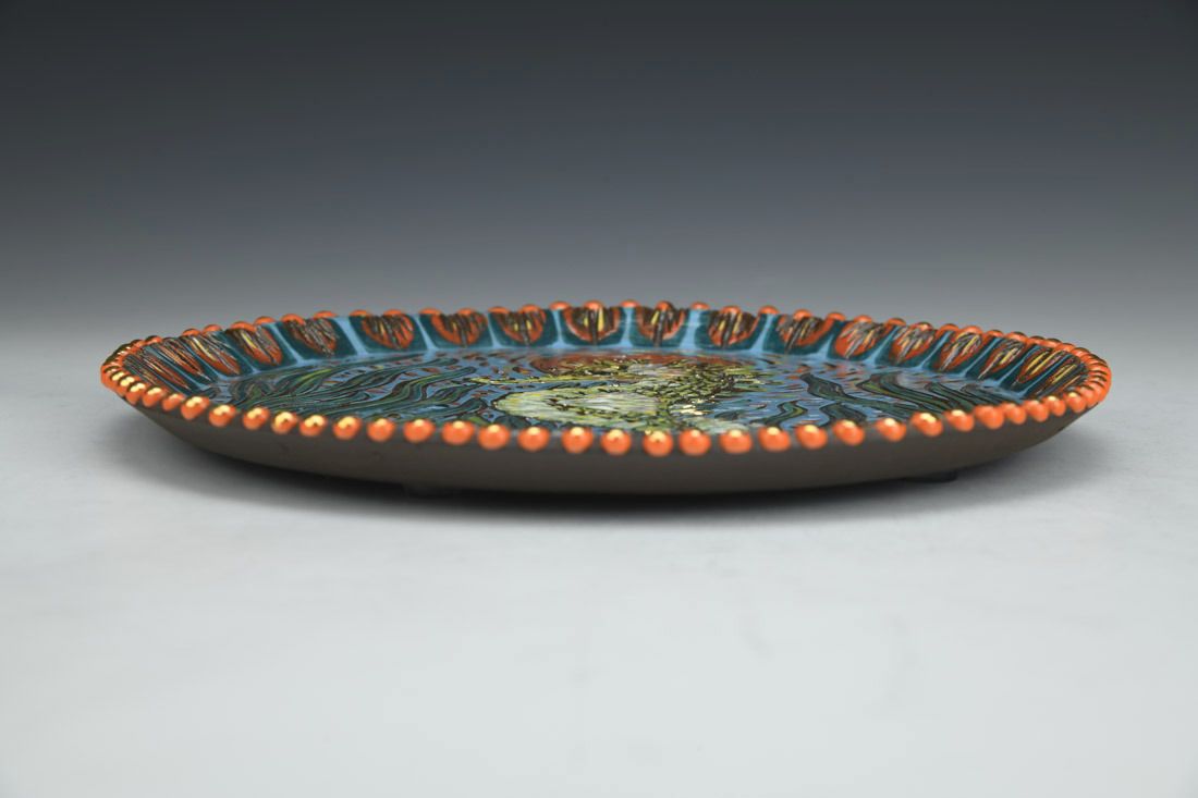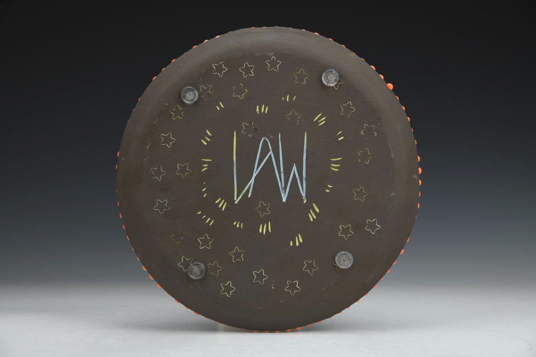 Black stoneware with white engobe and rubber feet, hand built with slabs, sgraffito, underglaze, textured glaze, luster, cone 5 fired, 0.75 x 8.5 x 8.5 inches.