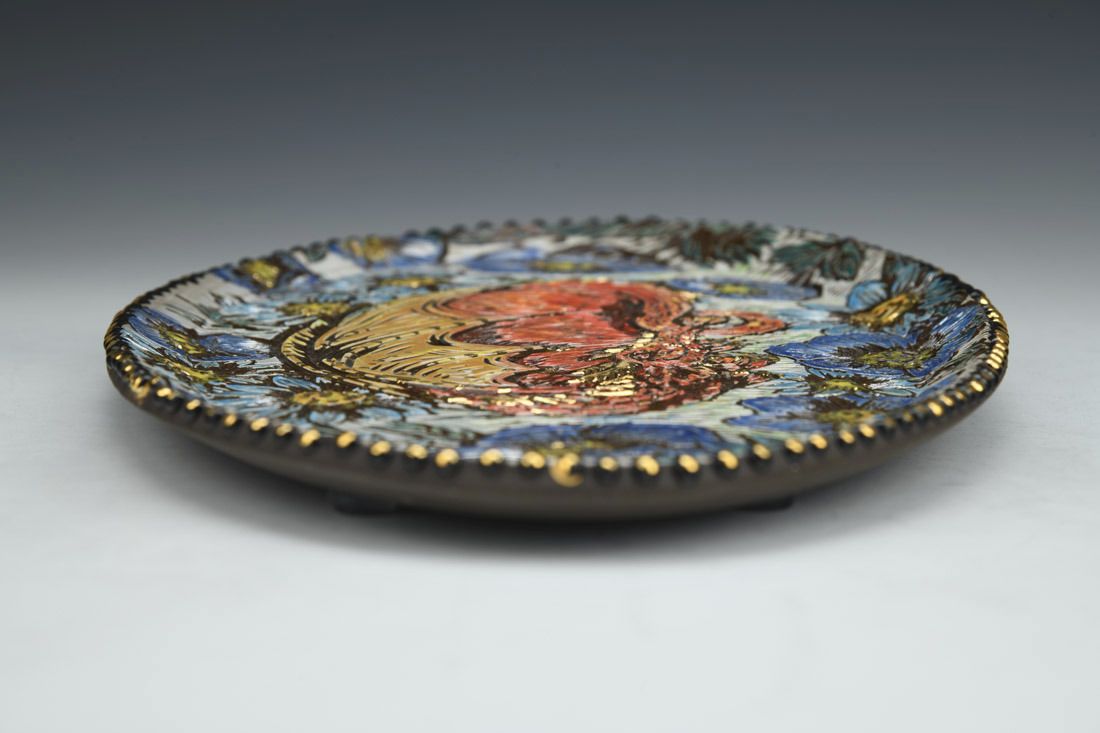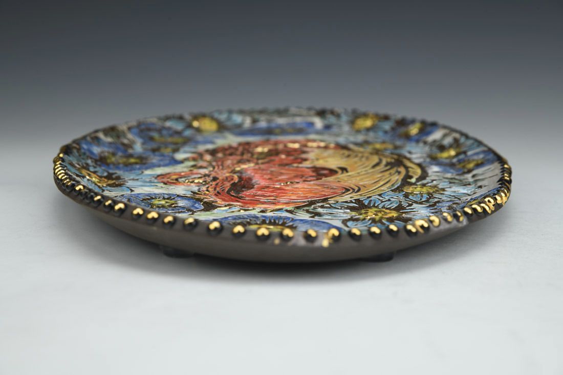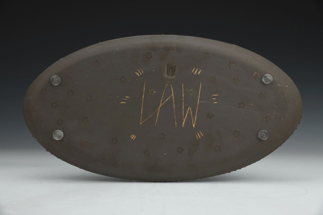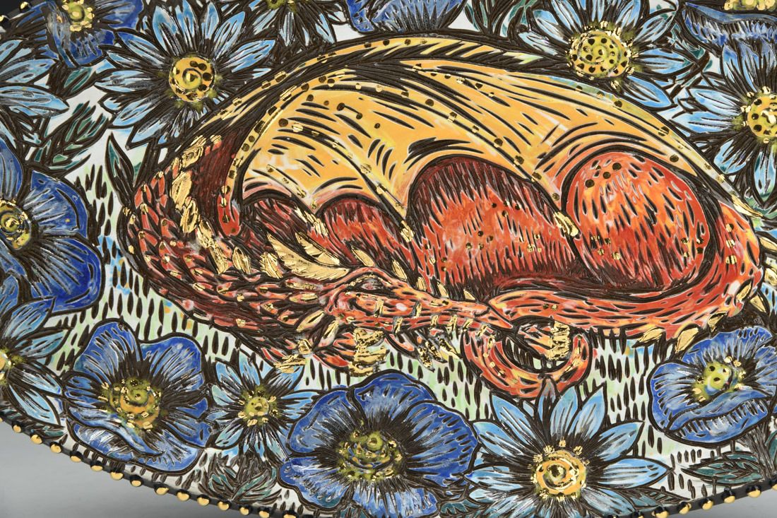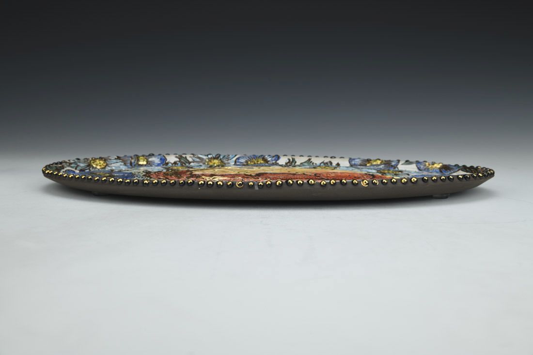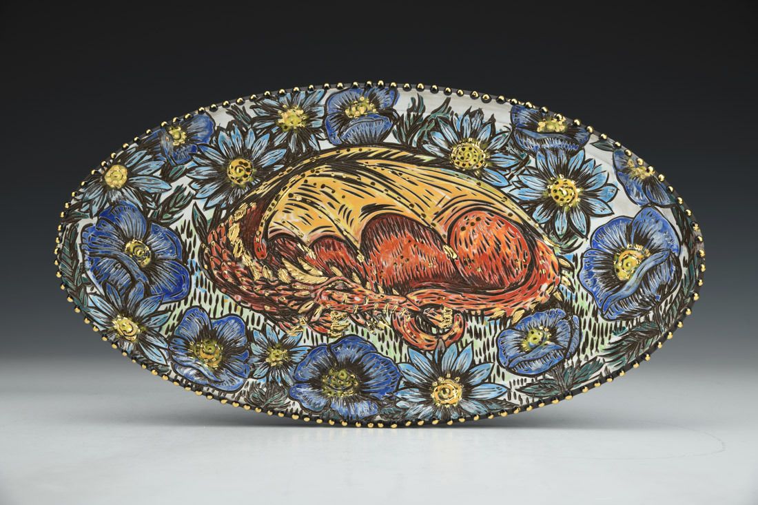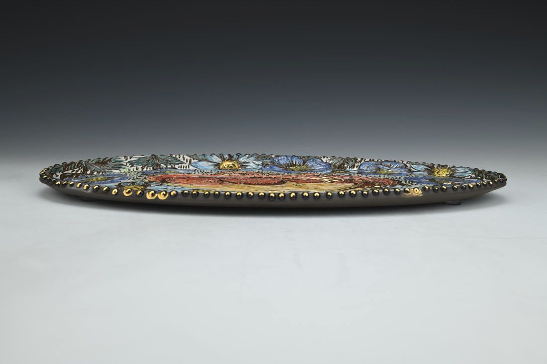Black stoneware with white engobe and rubber feet, hand built with slabs, sgraffito, underglaze, textured glaze, clear glaze, luster, cone 5 fired, 0.75 x 13.5 x 7.25 inches.