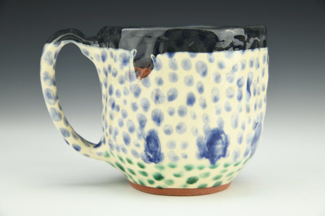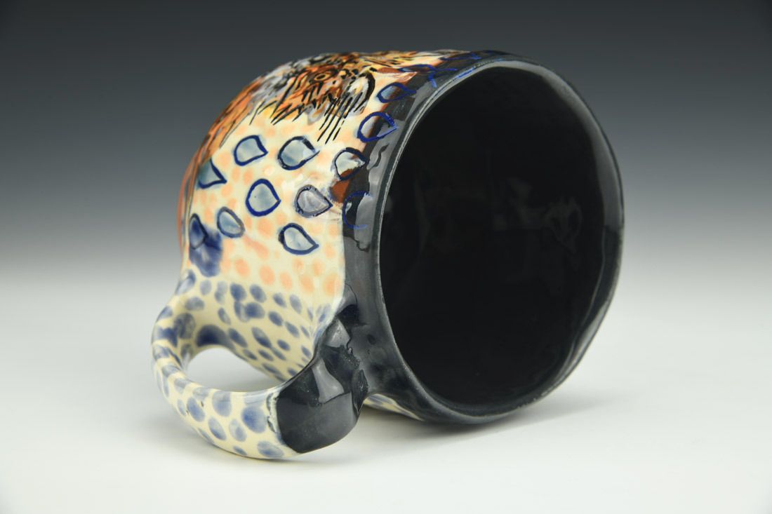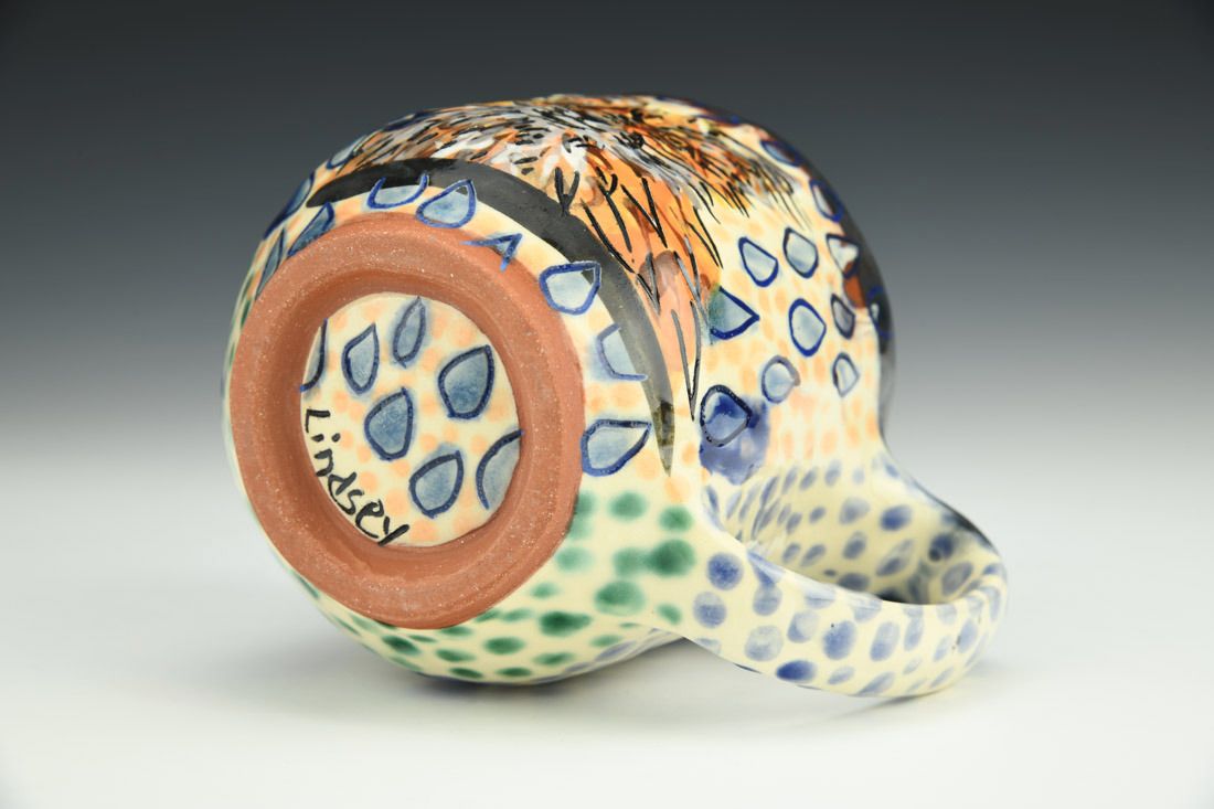Earthenware, hand built with pinching, slip, underglaze, glaze, cone 03 electric fired, 4 x 5.25 x 3.75 inches.