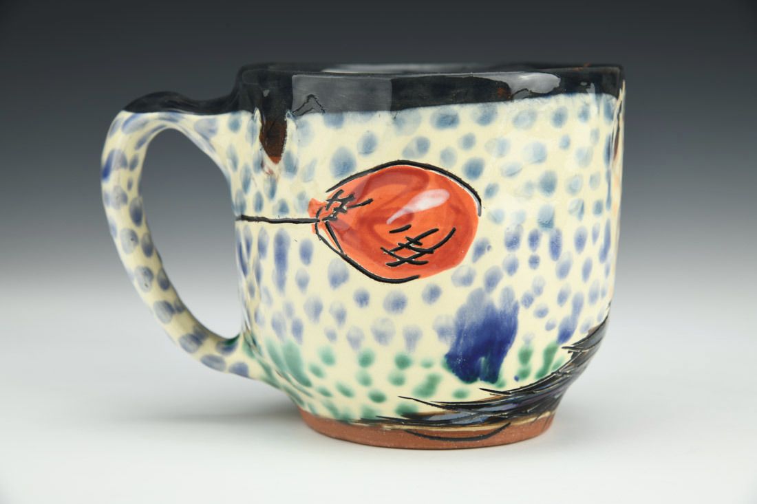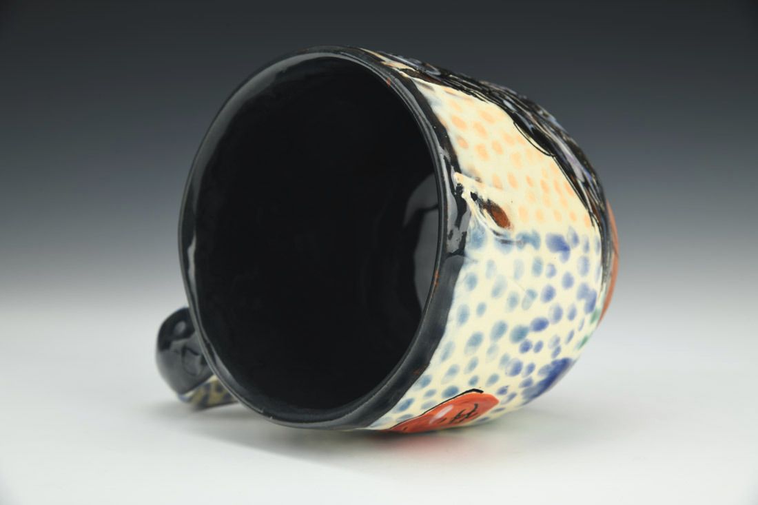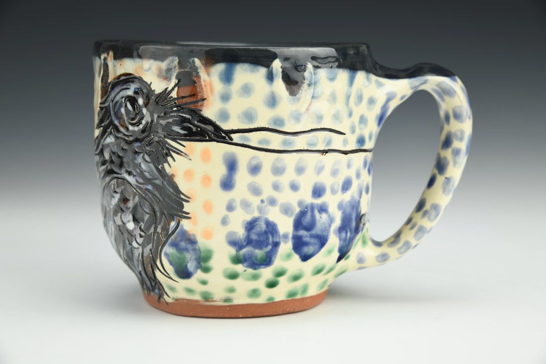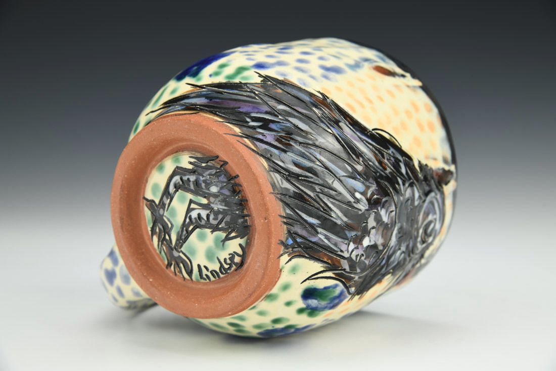 Earthenware, hand built with pinching, slip, underglaze, glaze, cone 03 electric fired, 3.75 x 5.5 x 4 inches.