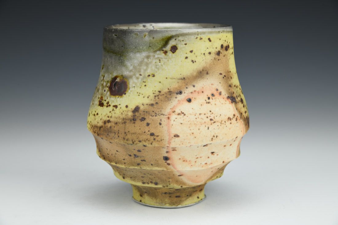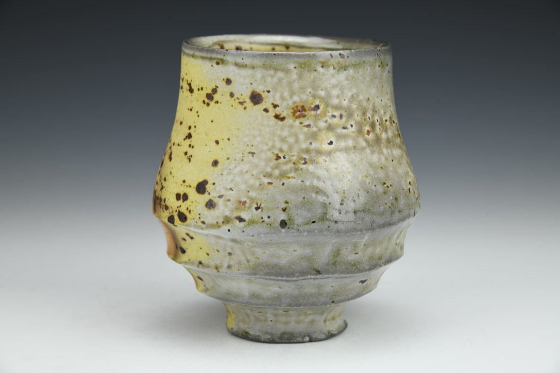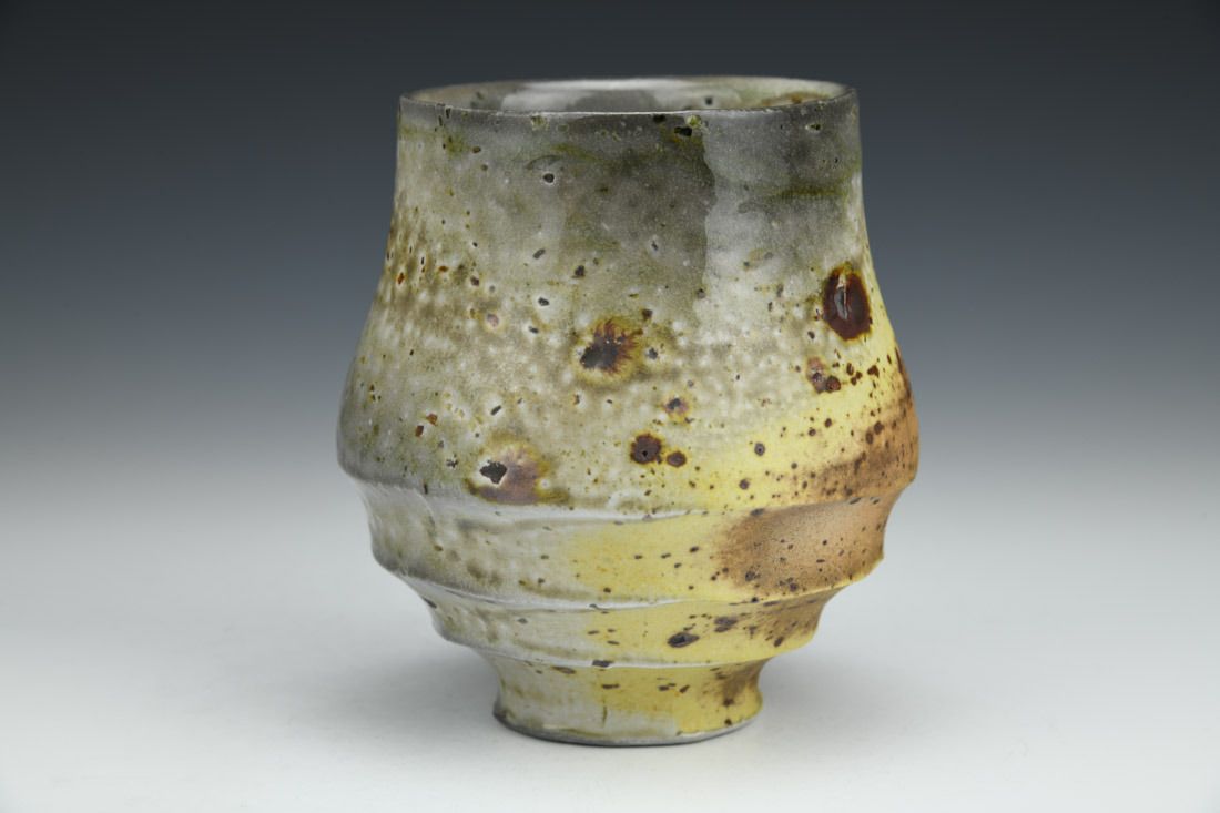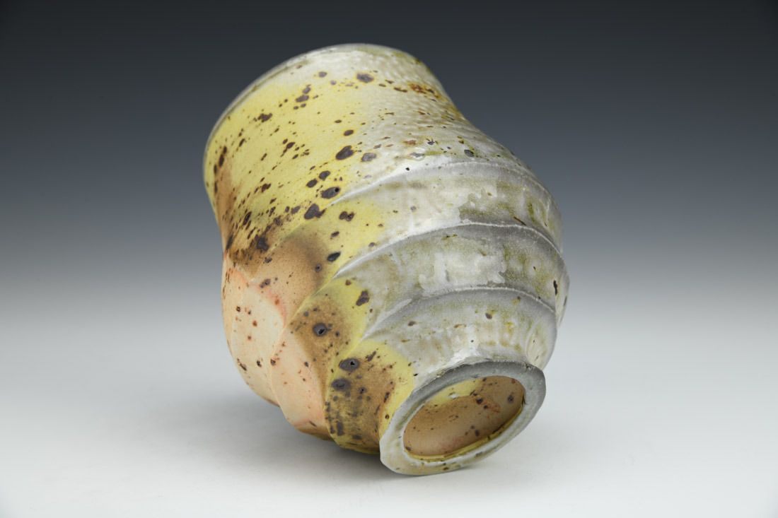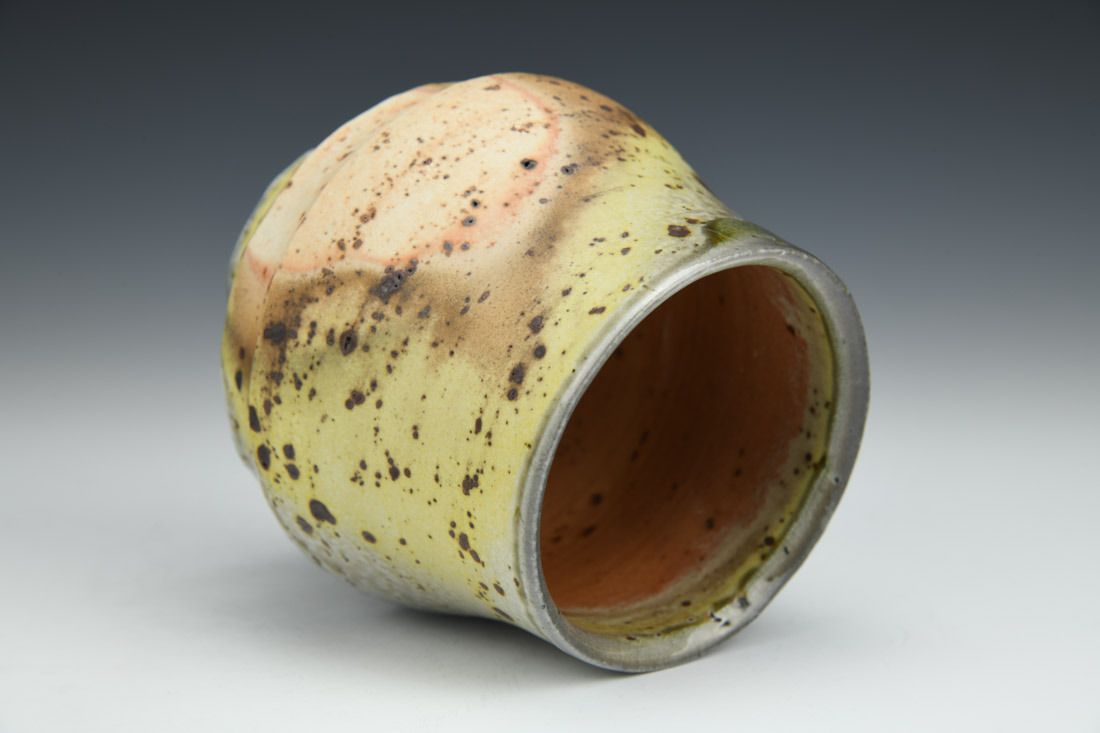 Porcelain with wild clay inclusions, wheel thrown, hand carved, shino liner glaze, wood-soda fired for 2 days, 4.75 x 4.5 x 4.5 inches.