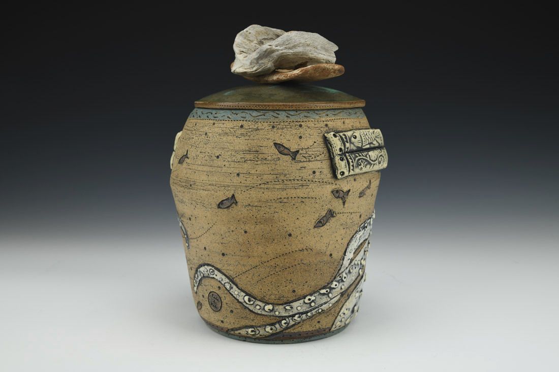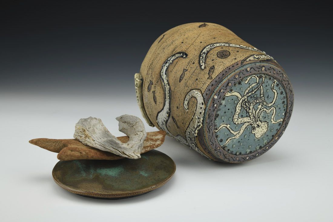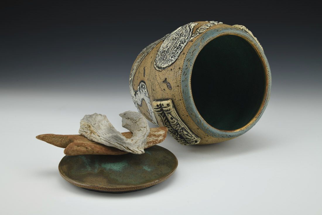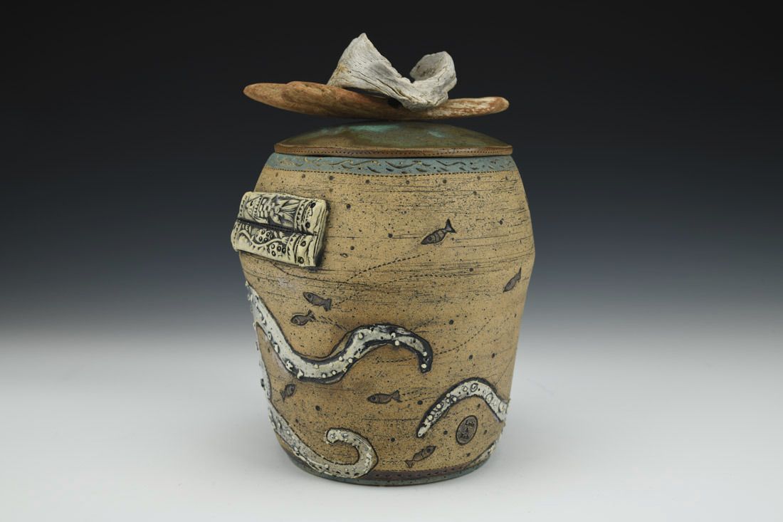 Stoneware with driftwood and string, wheel thrown, cone 6 electric fired, 8.5 x 6.5 x 5 inches.
