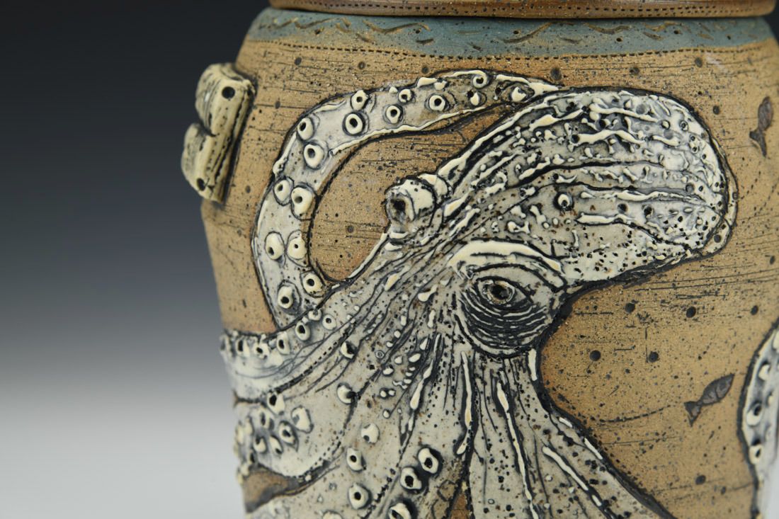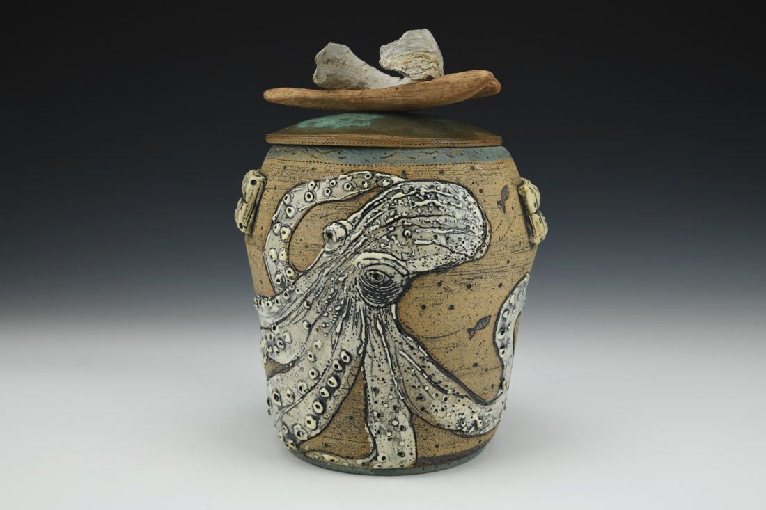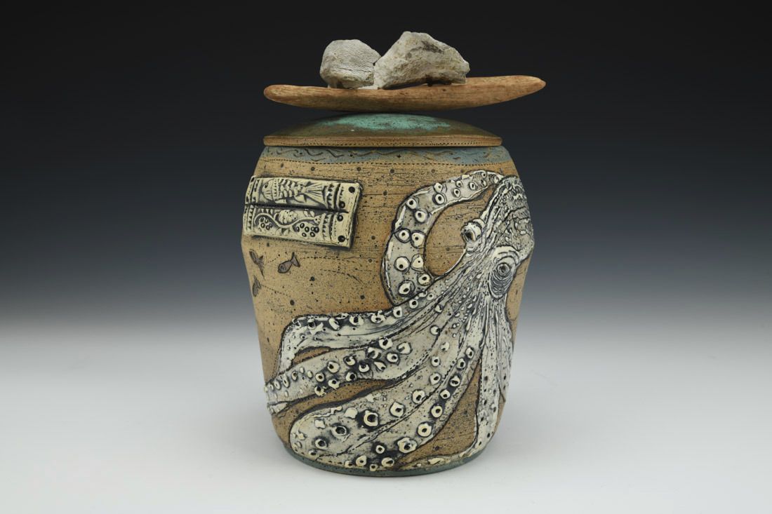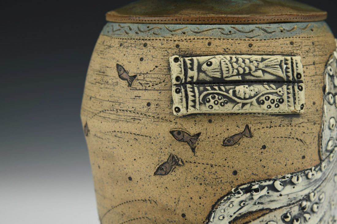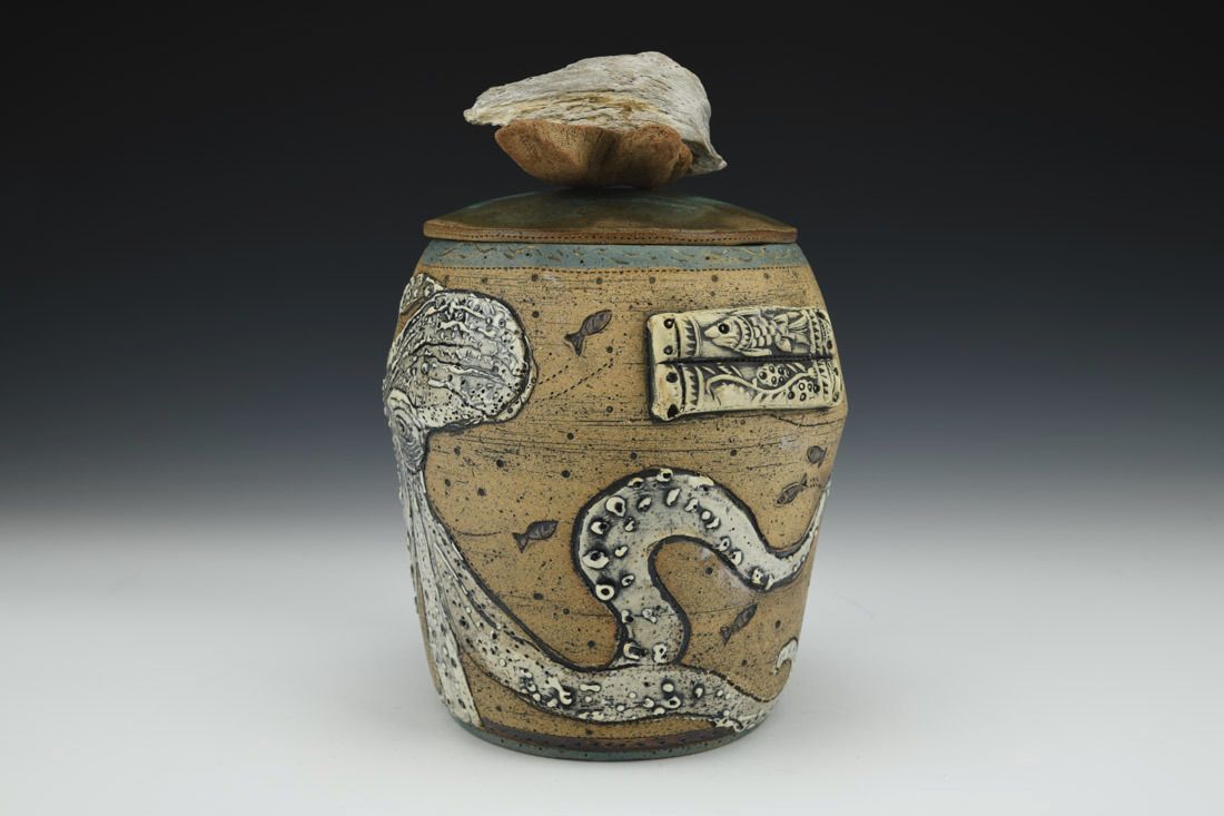 Stoneware with driftwood and string, wheel thrown, cone 6 electric fired, 8.5 x 6.5 x 5 inches.