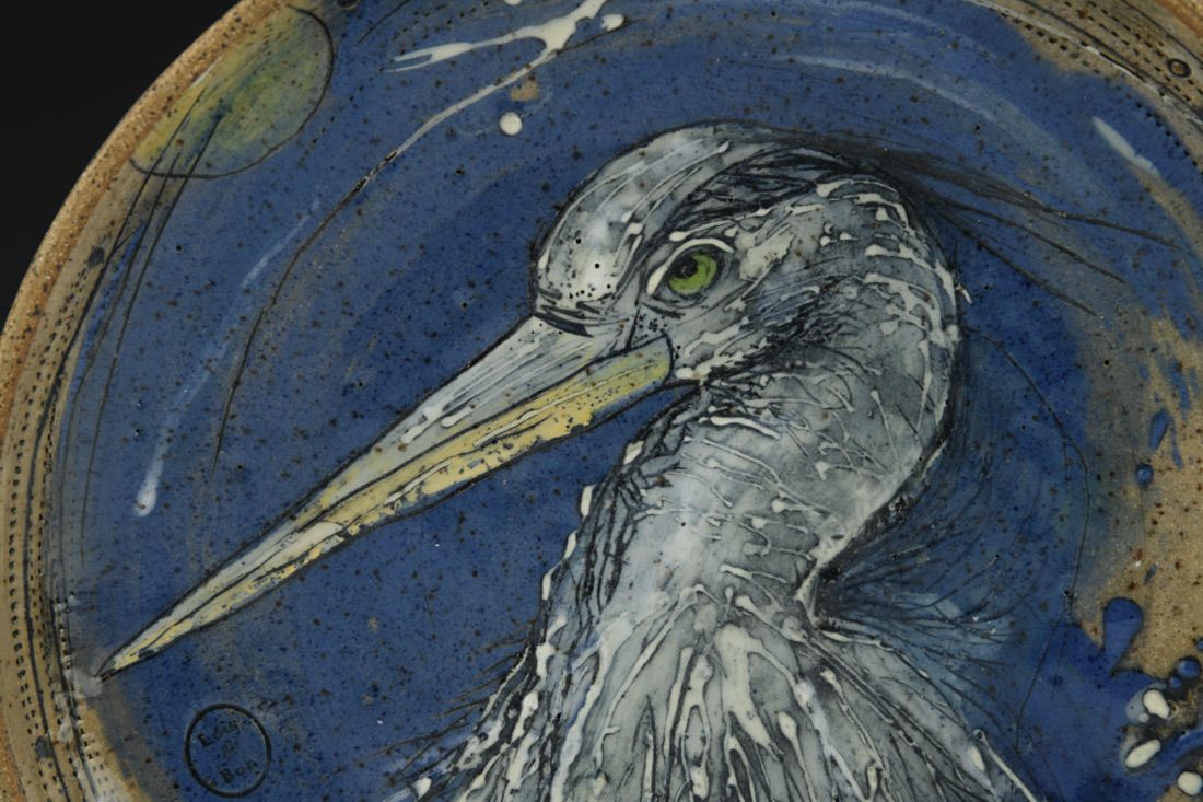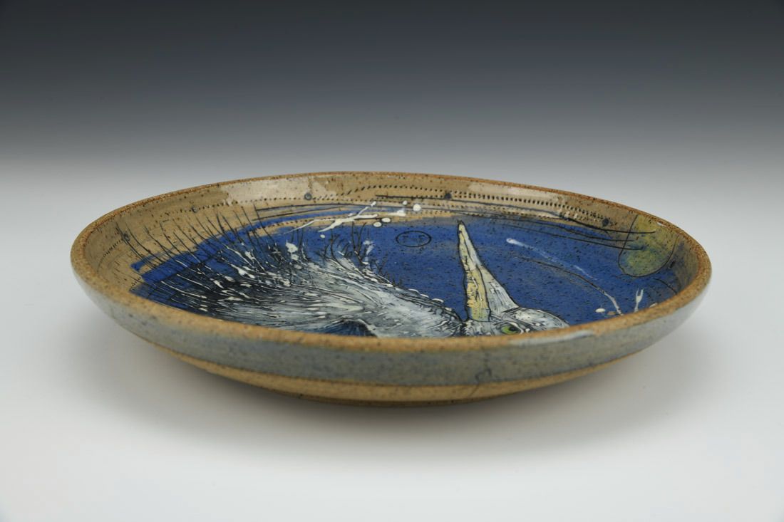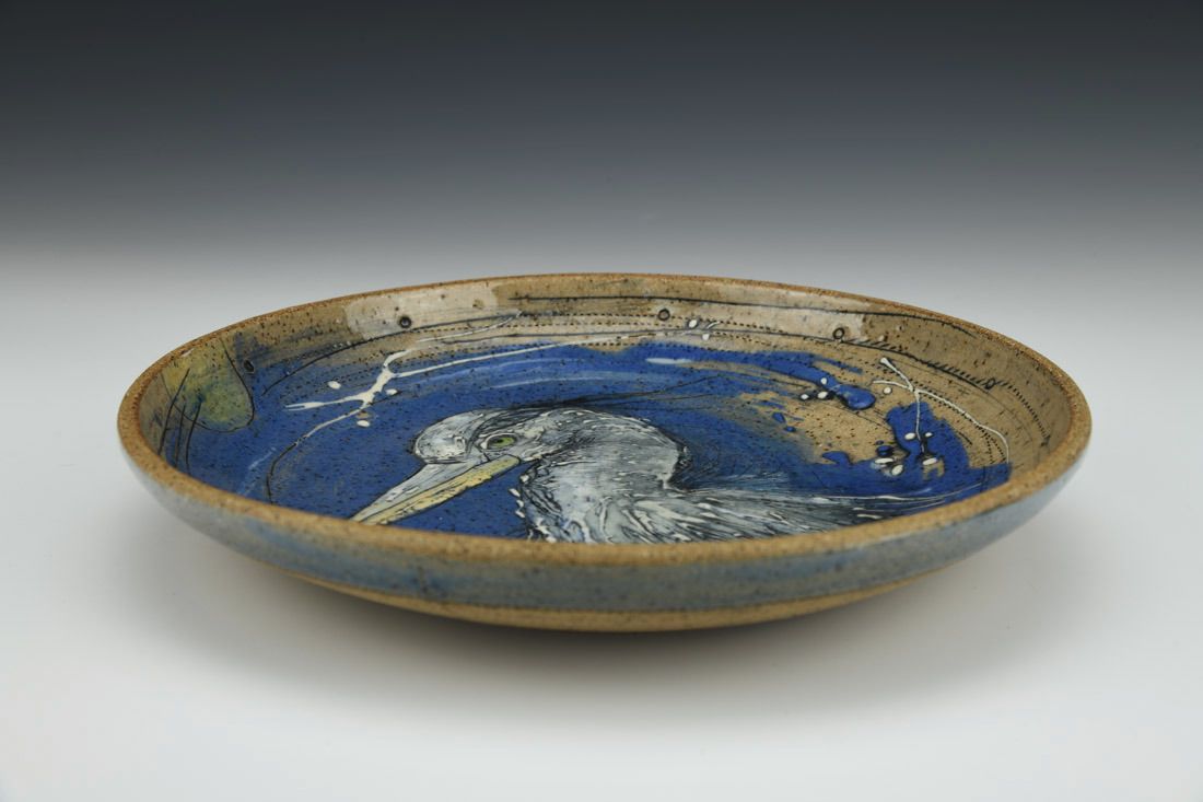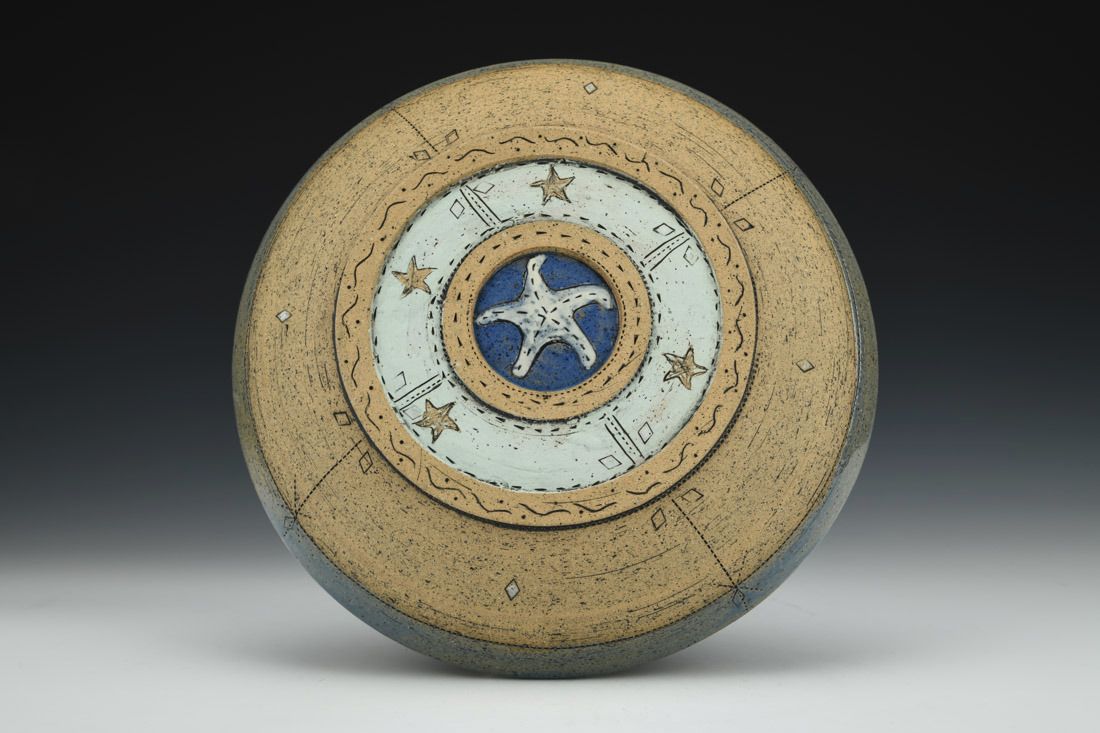 Stoneware, wheel thrown, cone 6 electric fired, 1.5 x 9 x 9 inches.