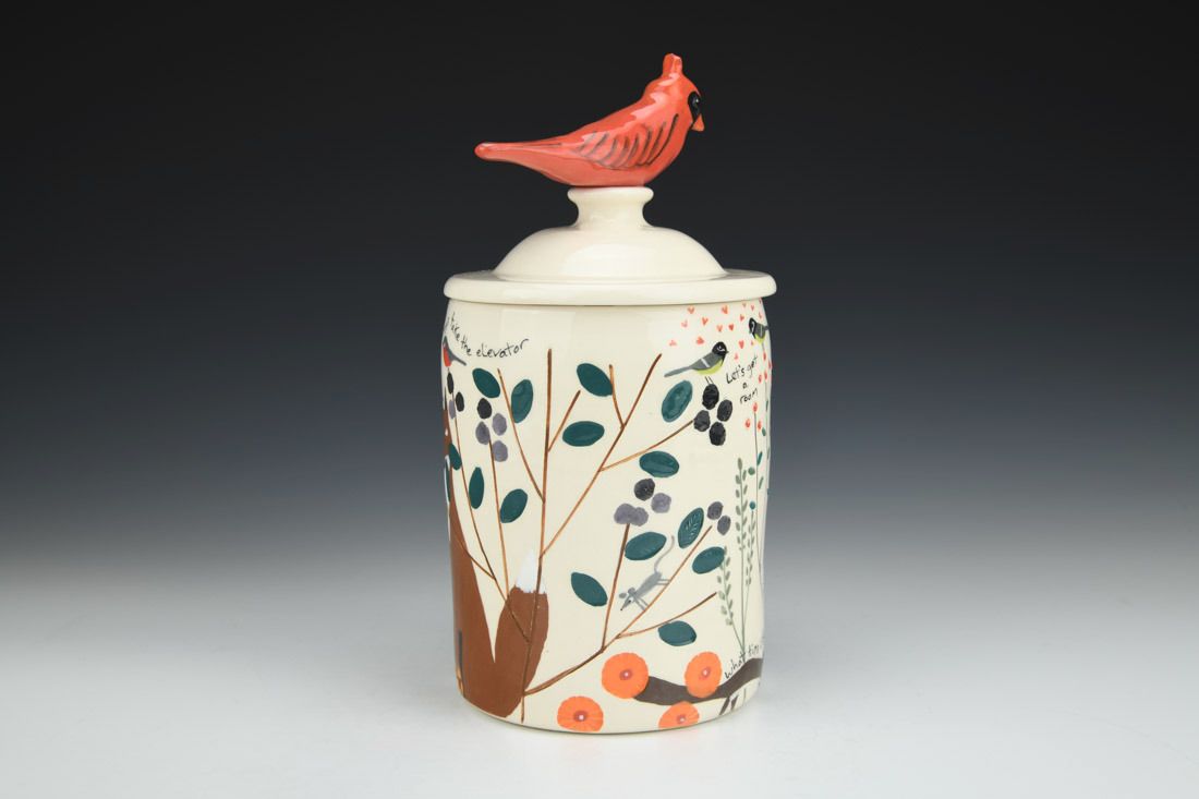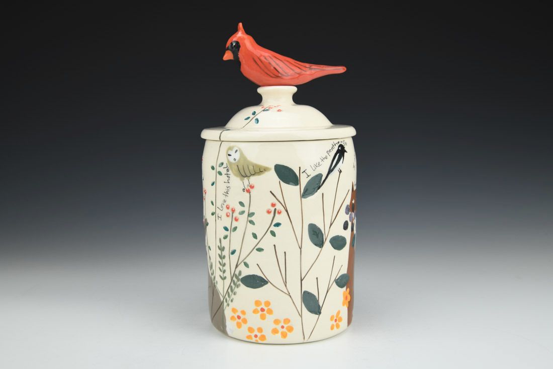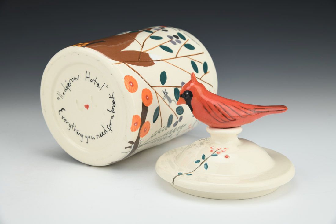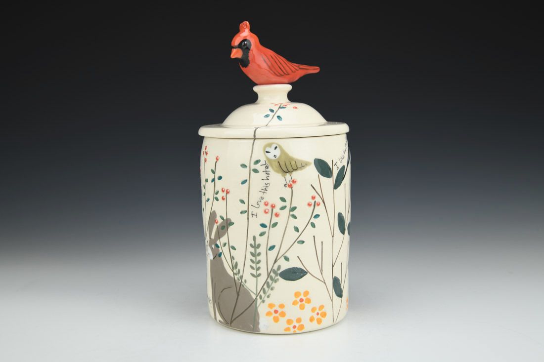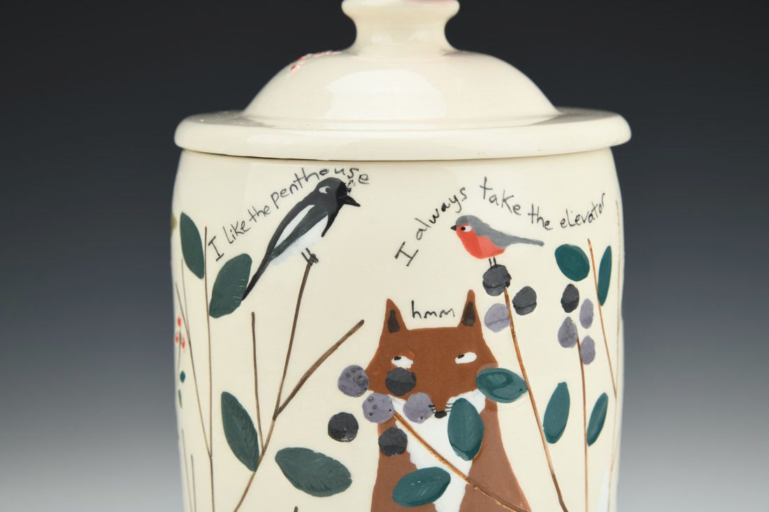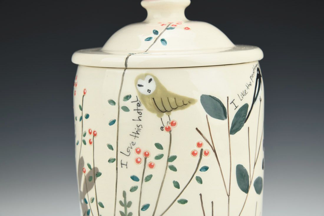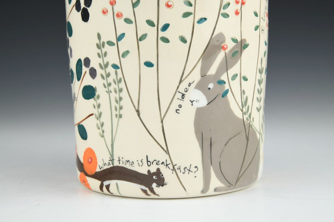 White earthenware, wheel thrown and hand built, slip, transparent glaze, cone 06 electric fired, 9.25 x 4.5 x 4.5 inches.