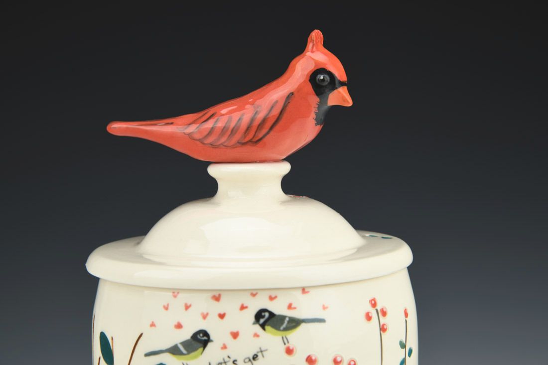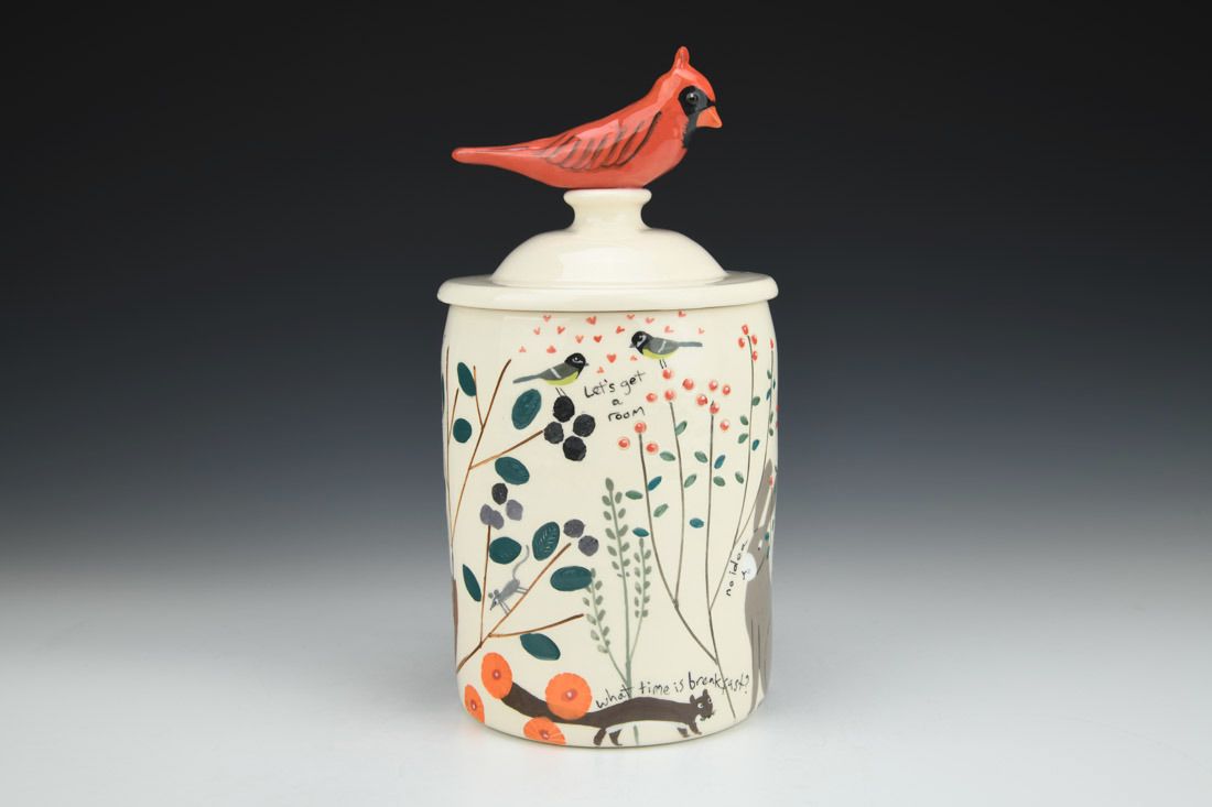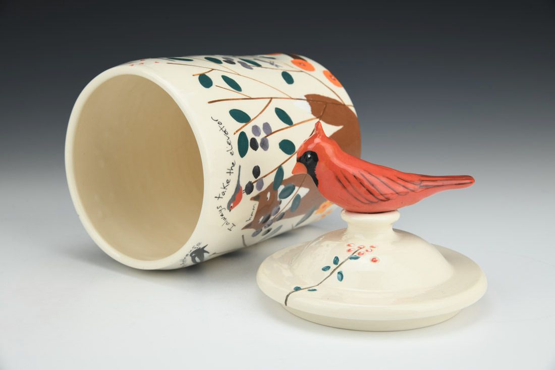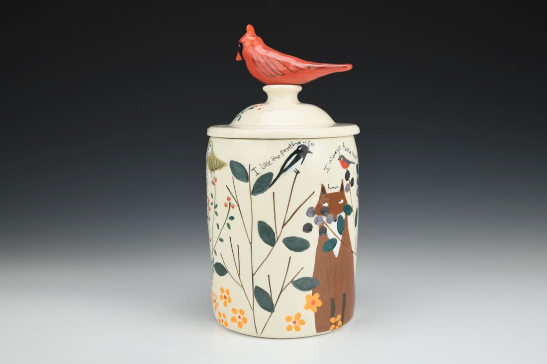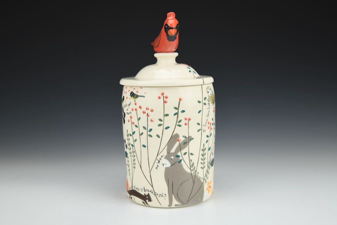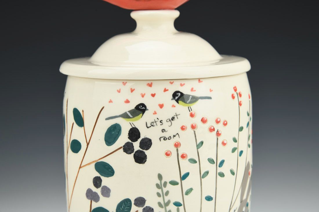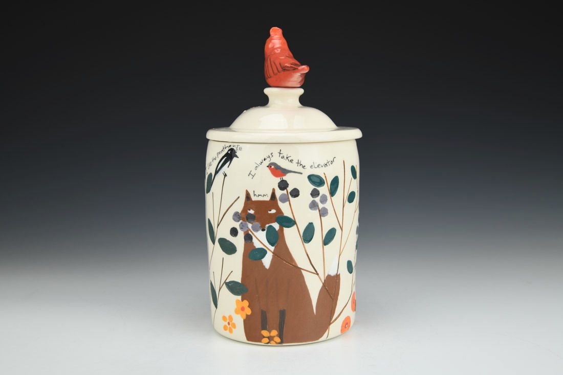 White earthenware, wheel thrown and hand built, slip, transparent glaze, cone 06 electric fired, 9.25 x 4.5 x 4.5 inches.
