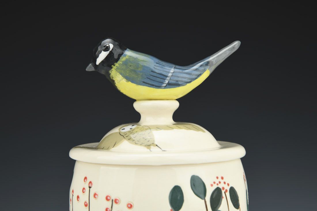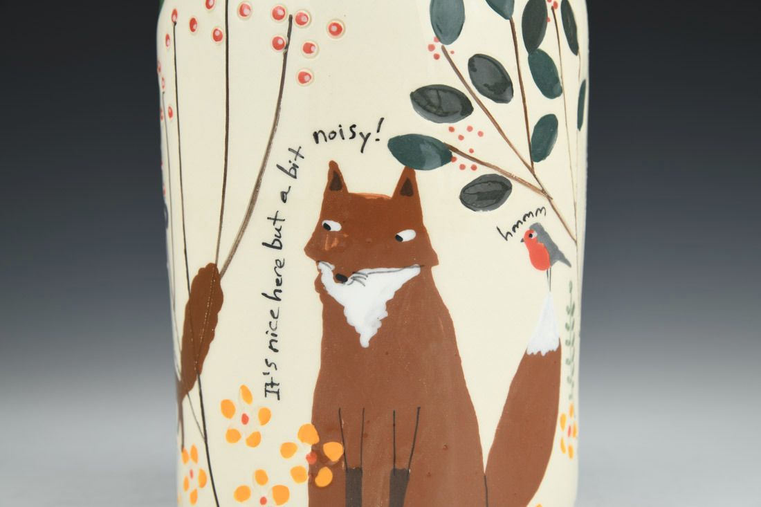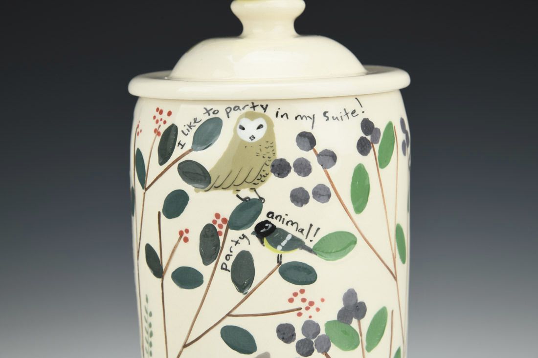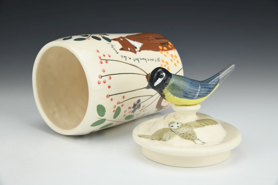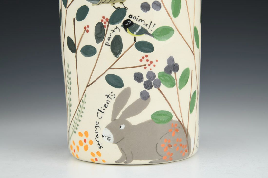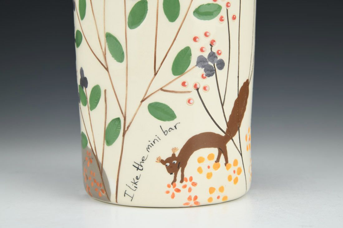 White earthenware, wheel thrown and hand built, slip, transparent glaze, cone 06 electric fired, 8.5 x 4.25 x 4.25 inches.