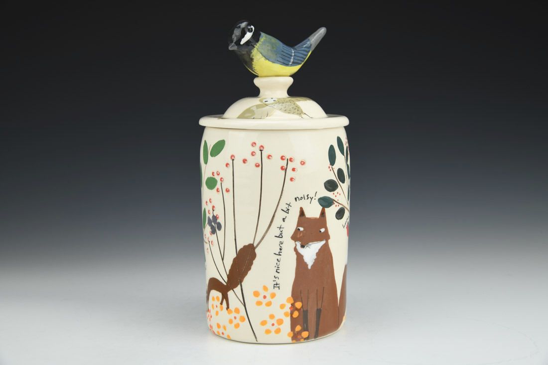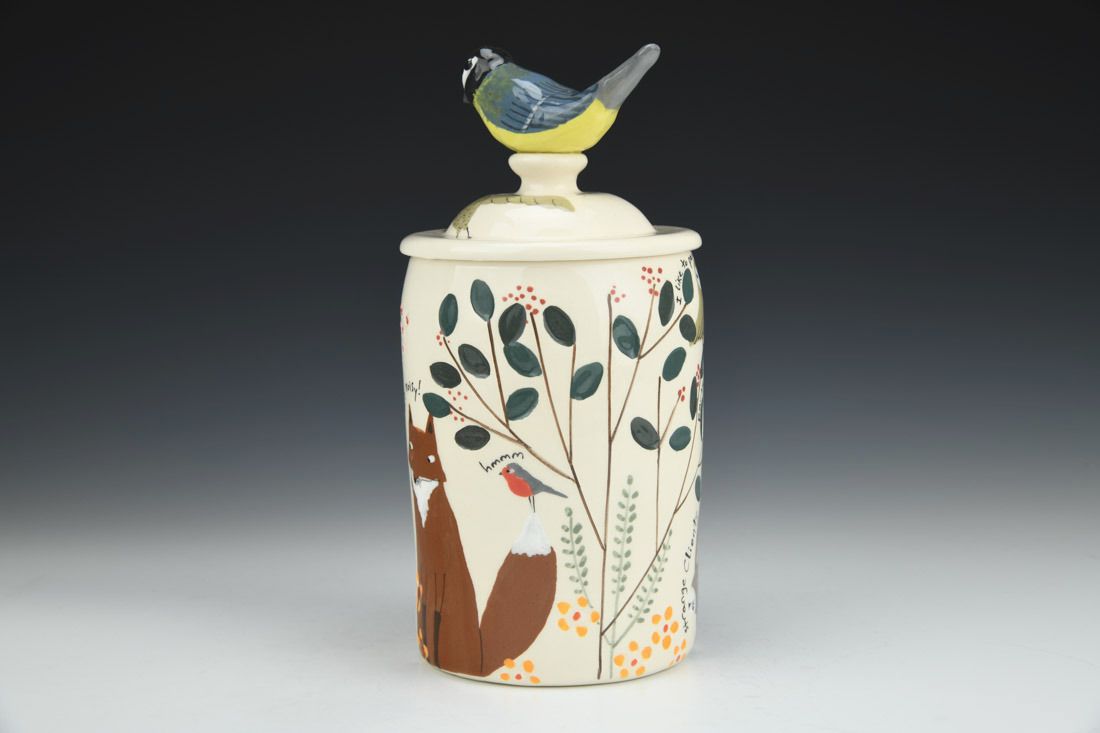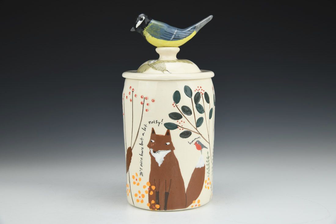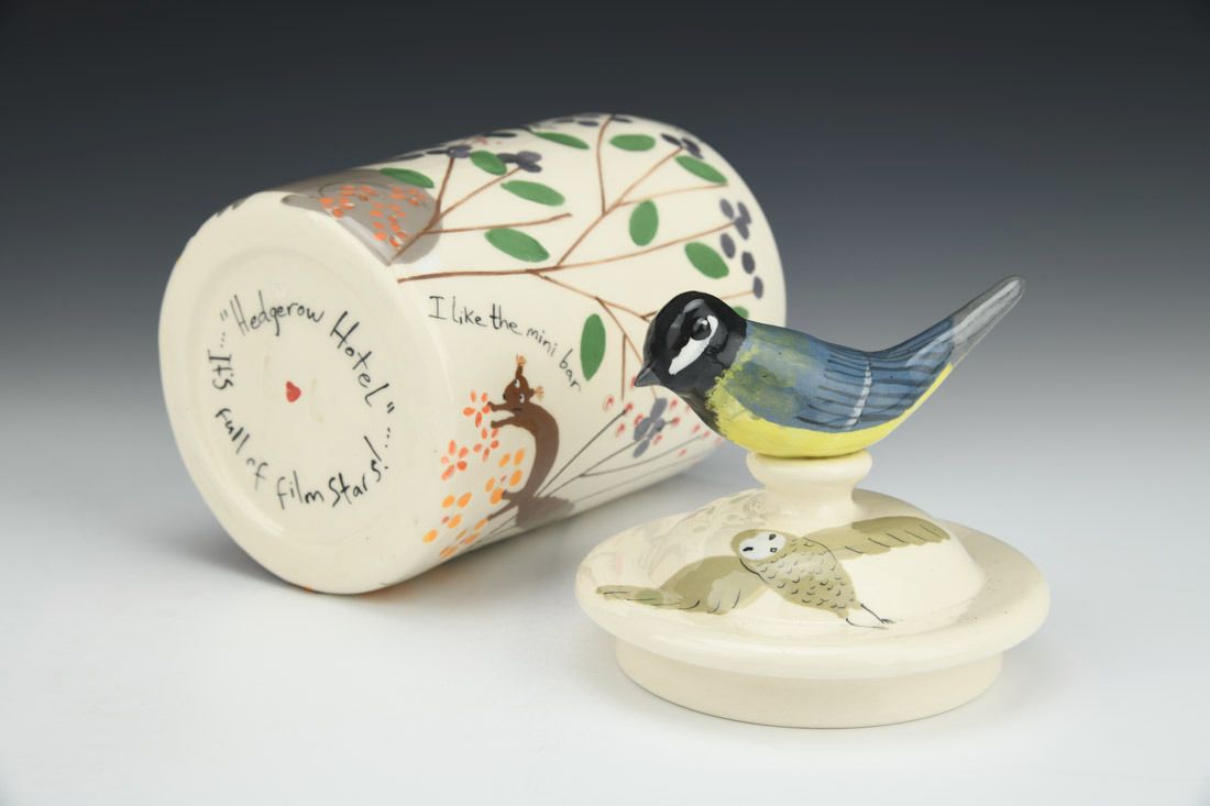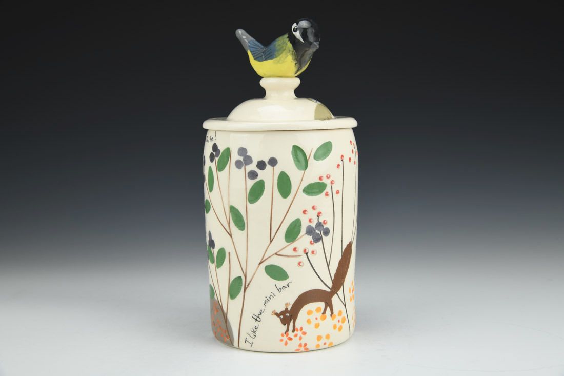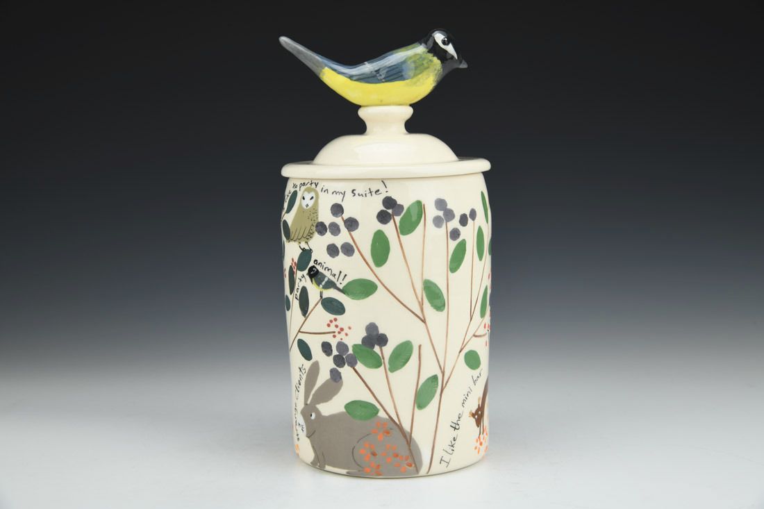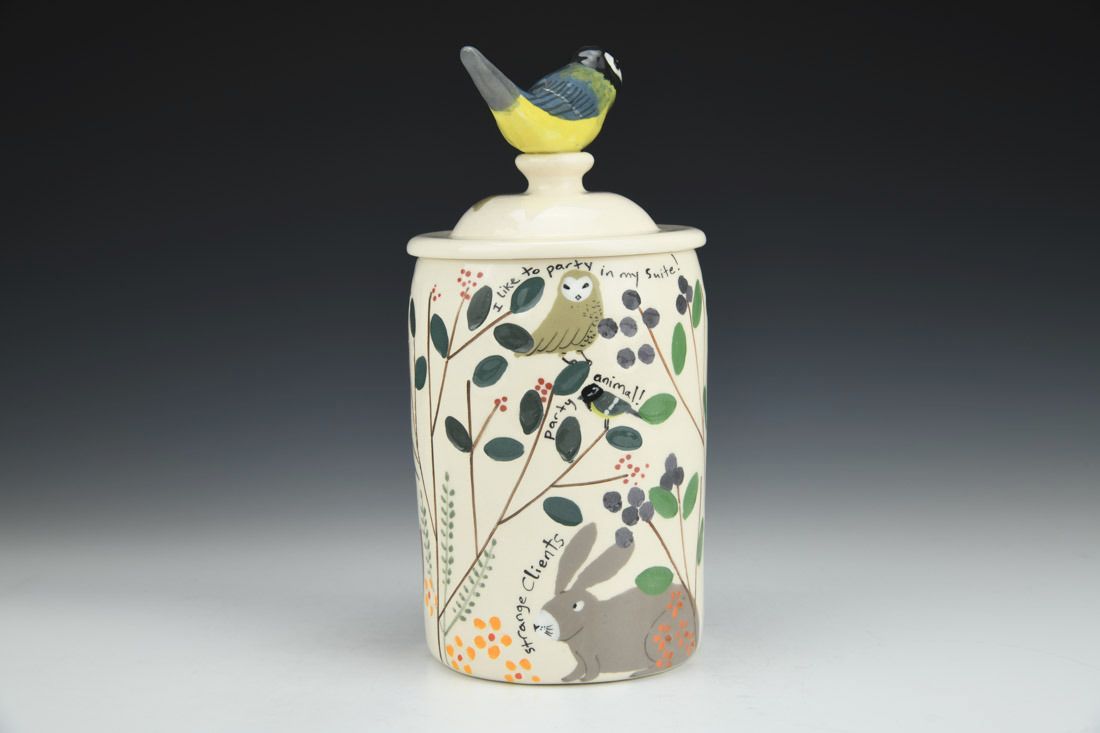 White earthenware, wheel thrown and hand built, slip, transparent glaze, cone 06 electric fired, 8.5 x 4.25 x 4.25 inches.