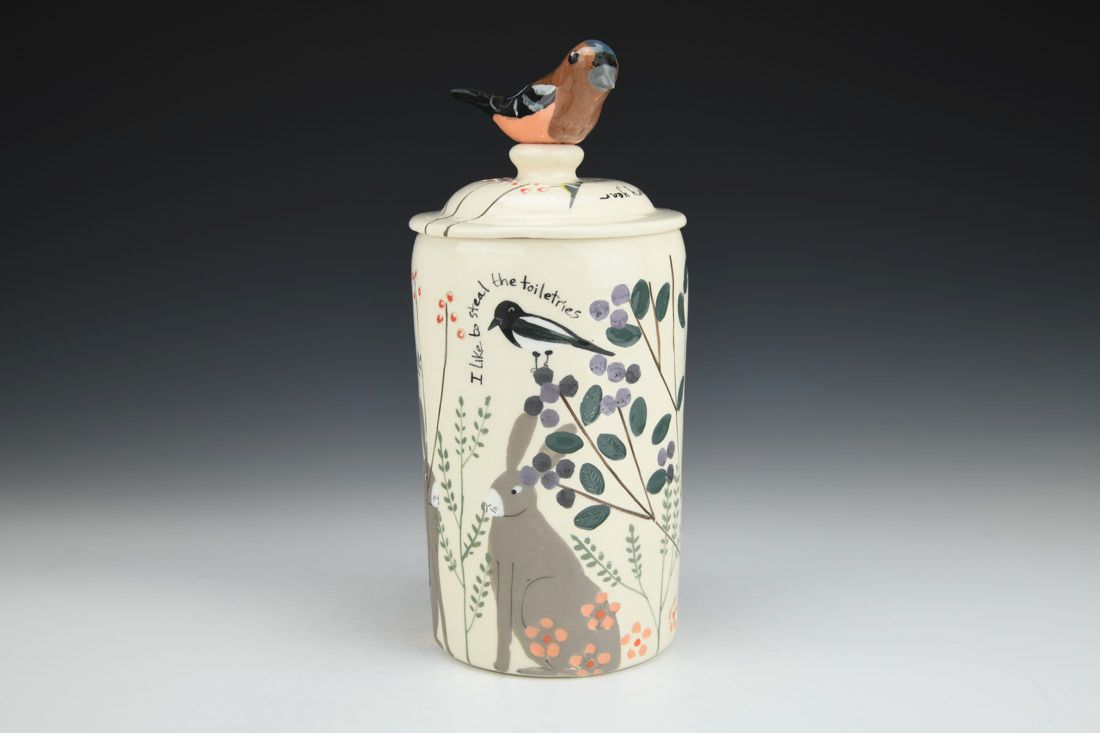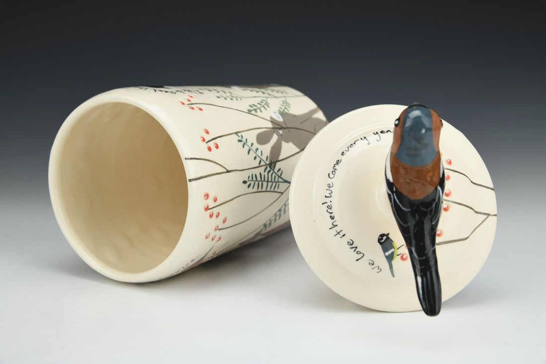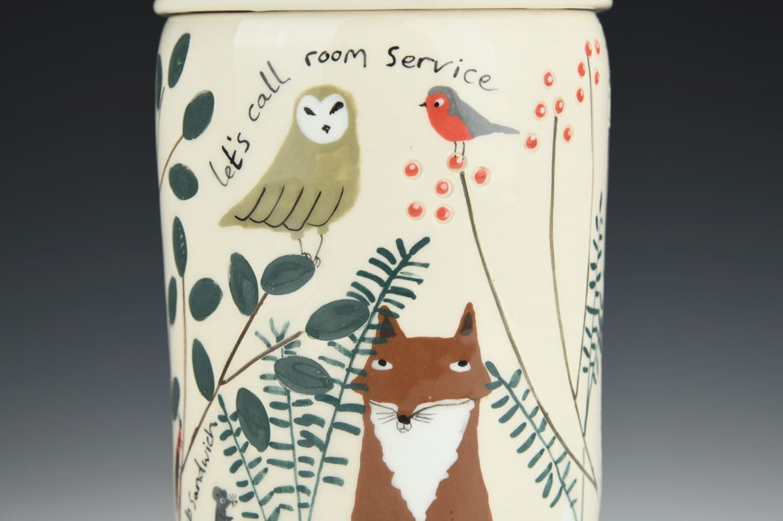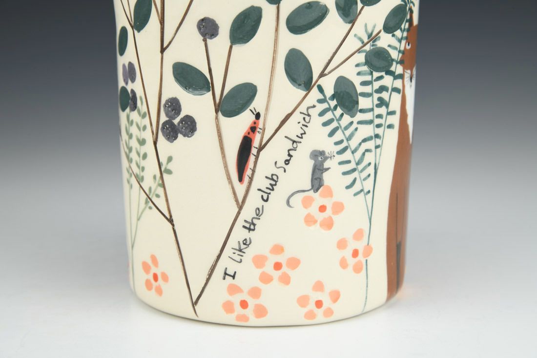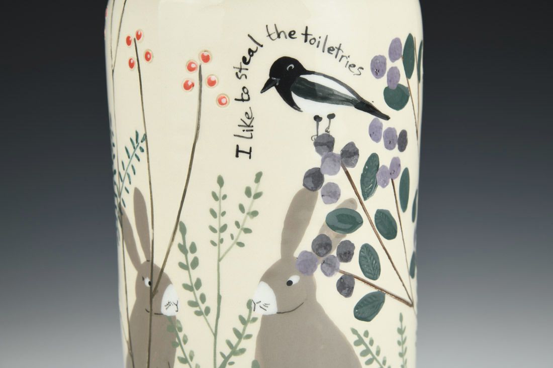 White earthenware, wheel thrown and hand built, slip, transparent glaze, cone 06 electric fired, 9.5 x 4.25 x 4.25 inches.