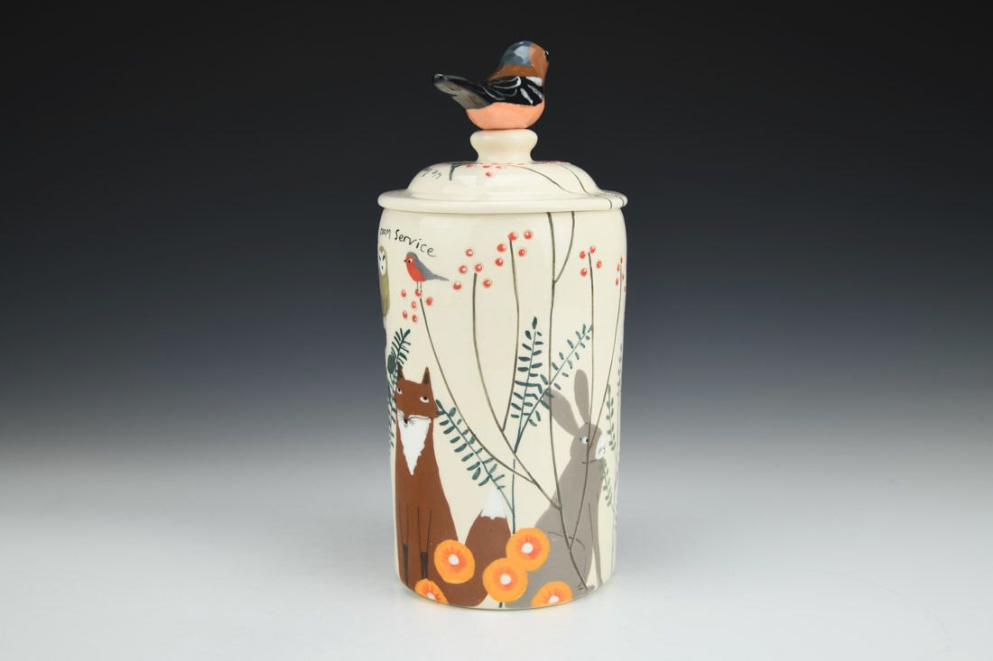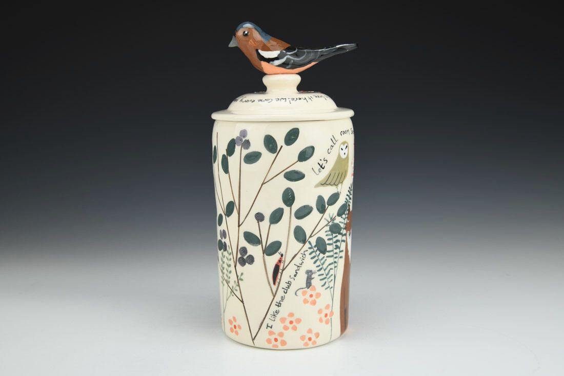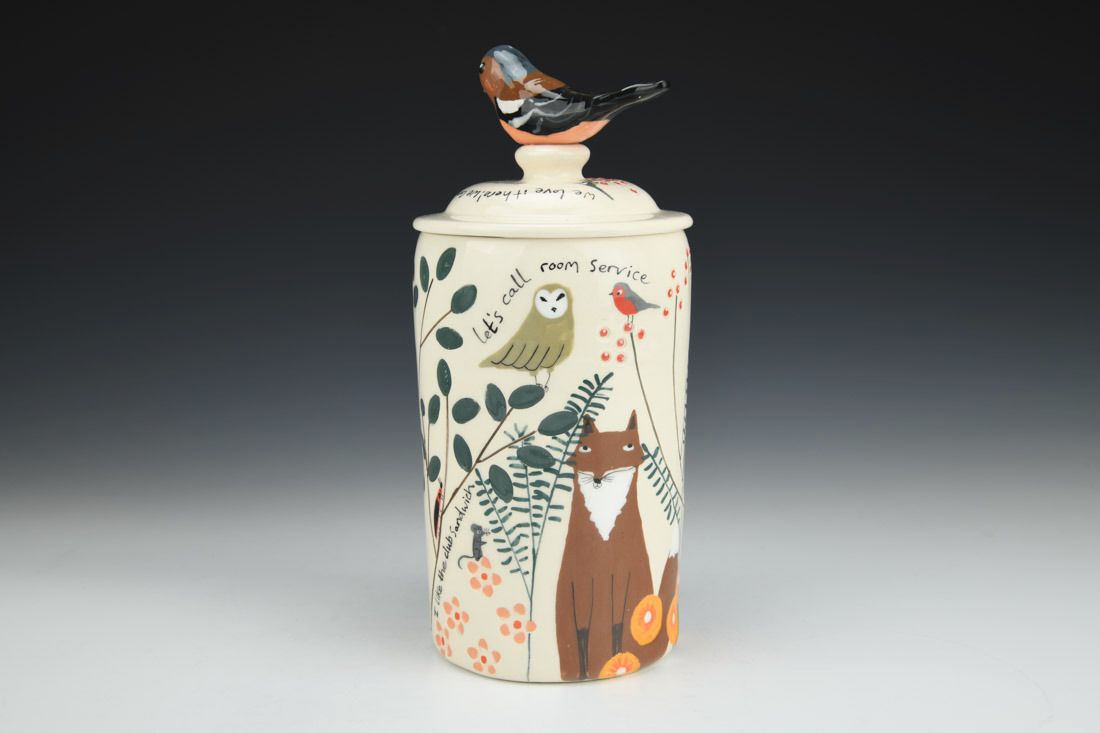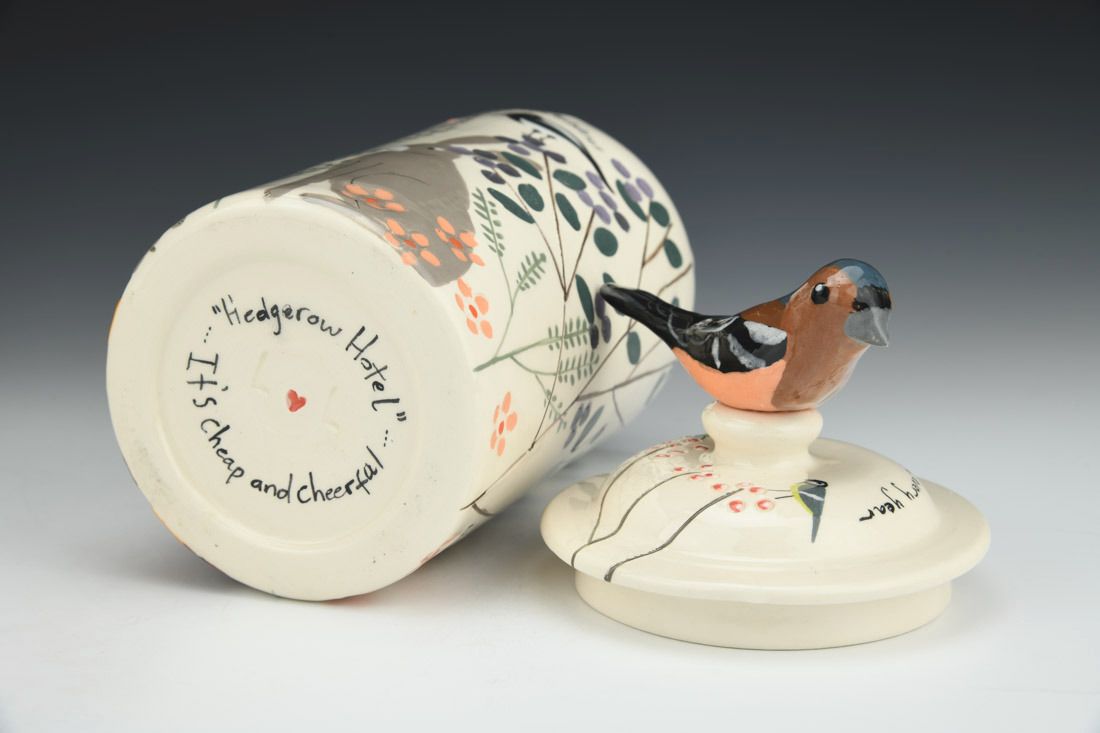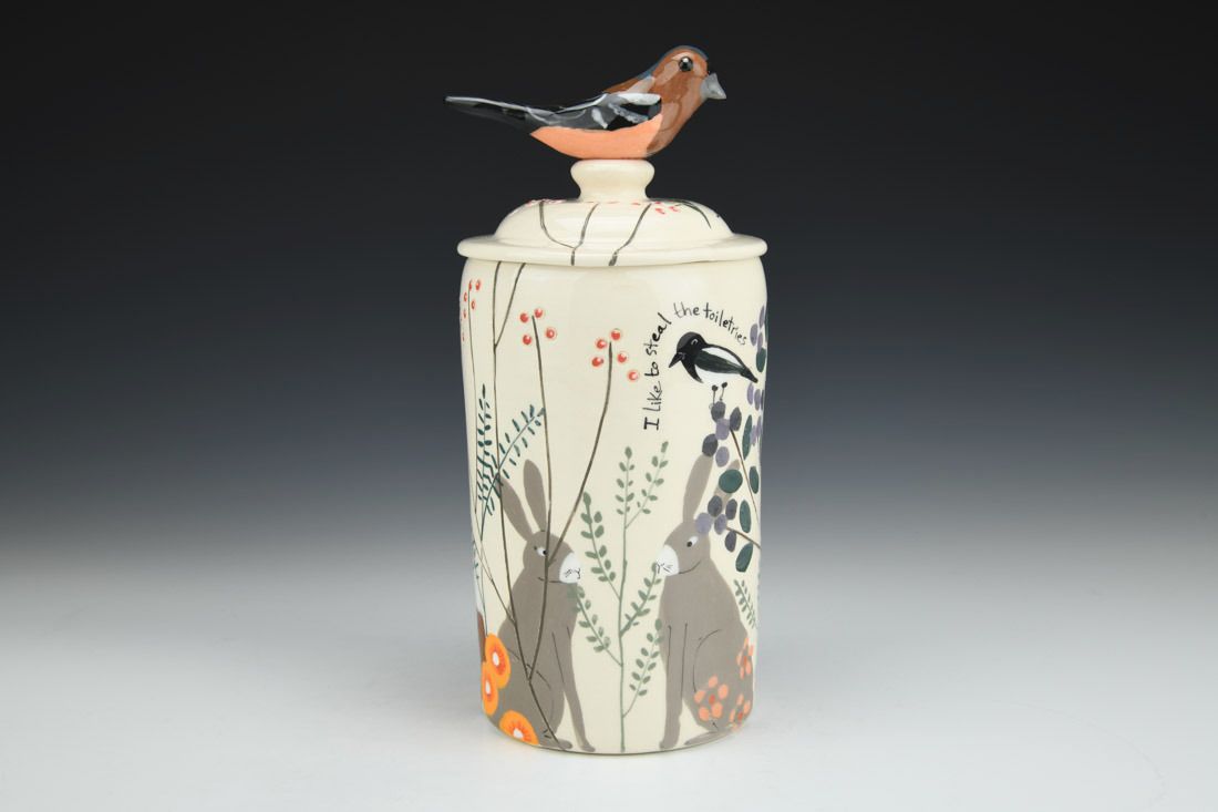 White earthenware, wheel thrown and hand built, slip, transparent glaze, cone 06 electric fired, 9.5 x 4.25 x 4.25 inches.