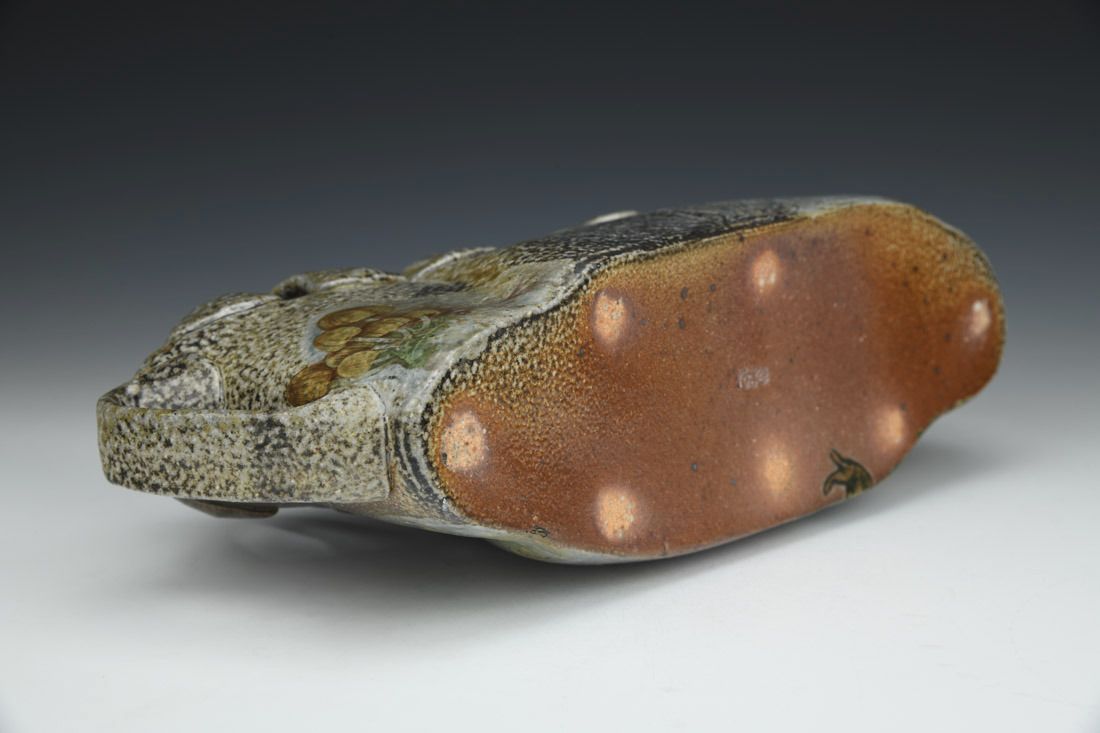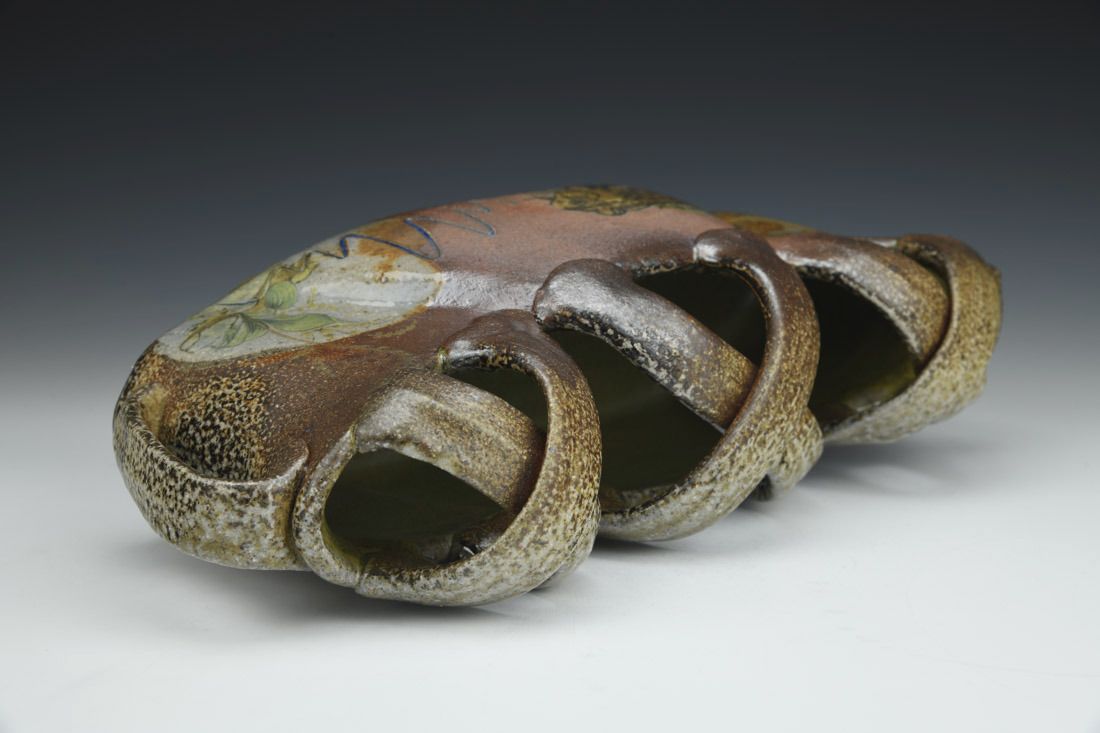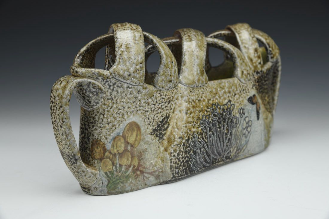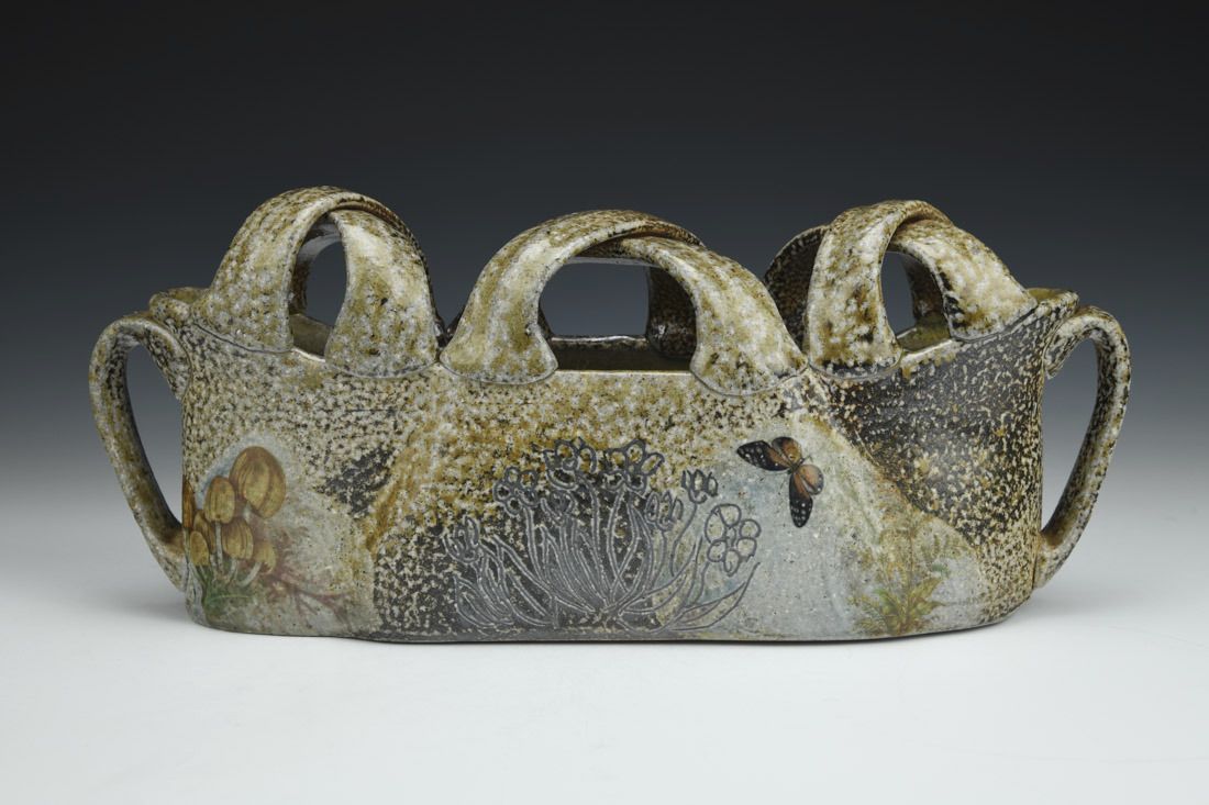 North Carolina stoneware, wheel thrown and altered, screen printed slip transfer, decals, wood/salt fired, 5.25 x 12.5 x 3.5 inches.
