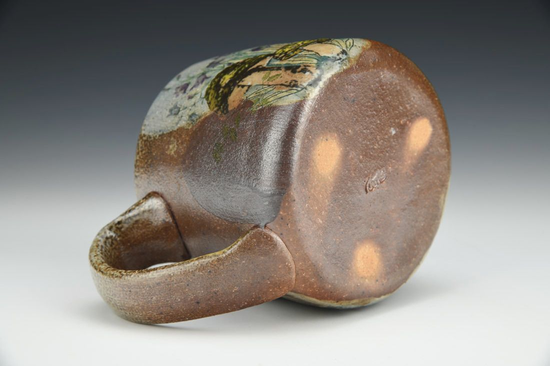North Carolina stoneware, wheel thrown, brushed, inlaid, screen printed slip transfer, underglaze crayon, decals, wood/salt fired, 3.75 x 5.5 x 4 inches.