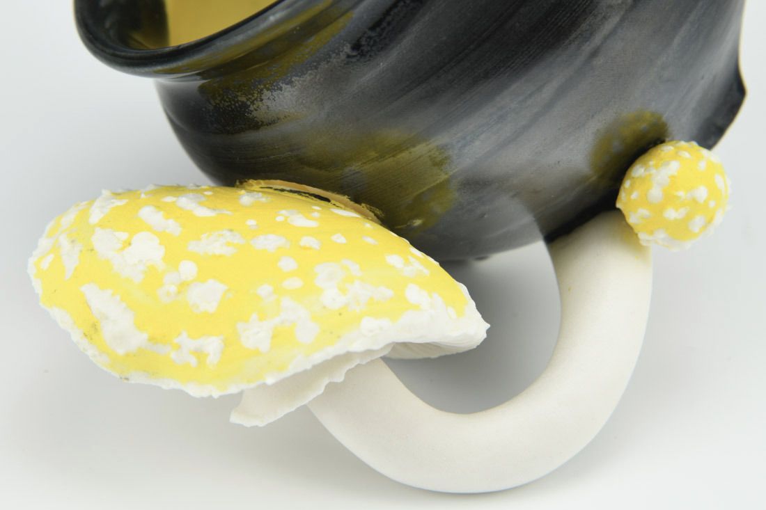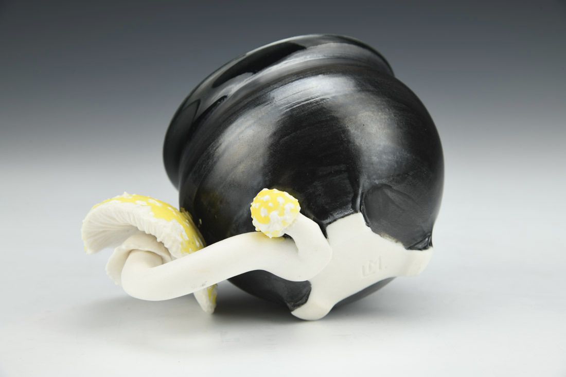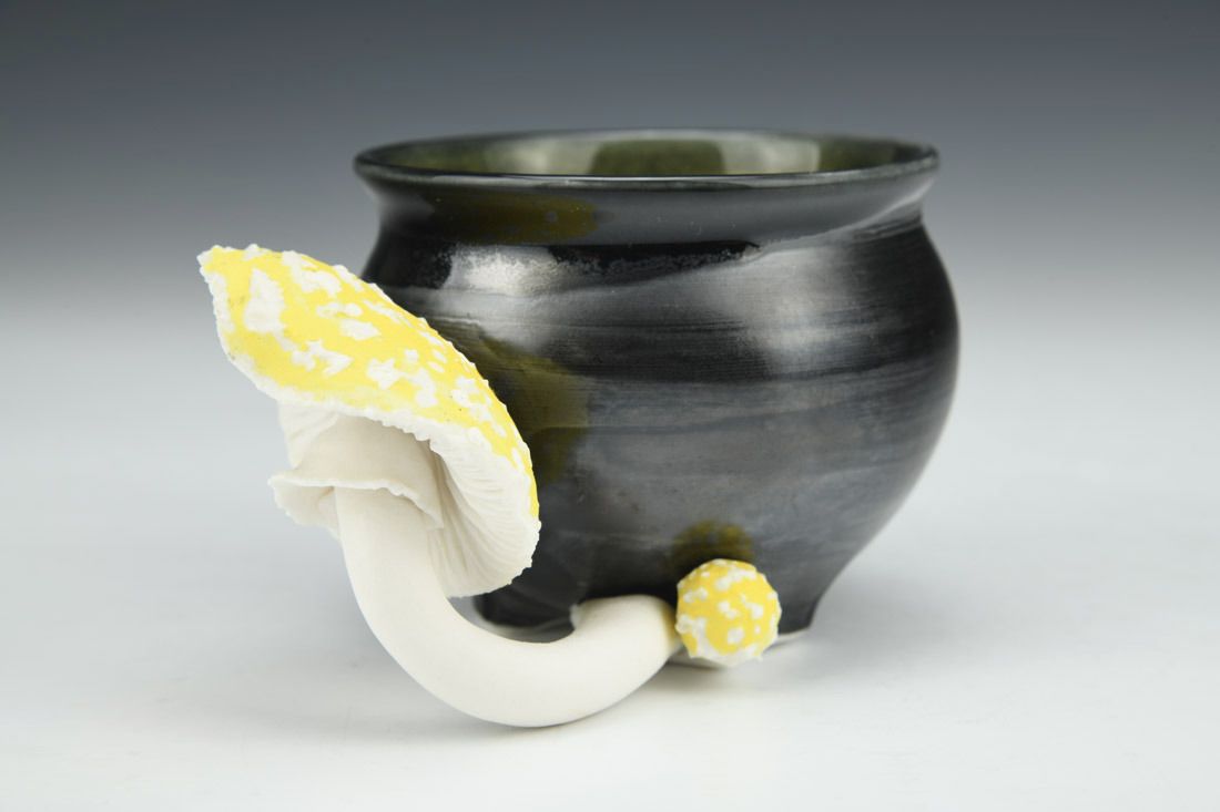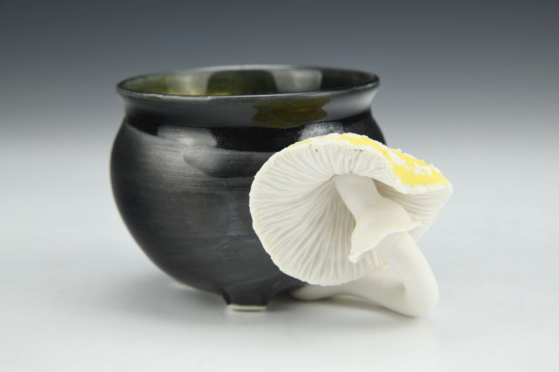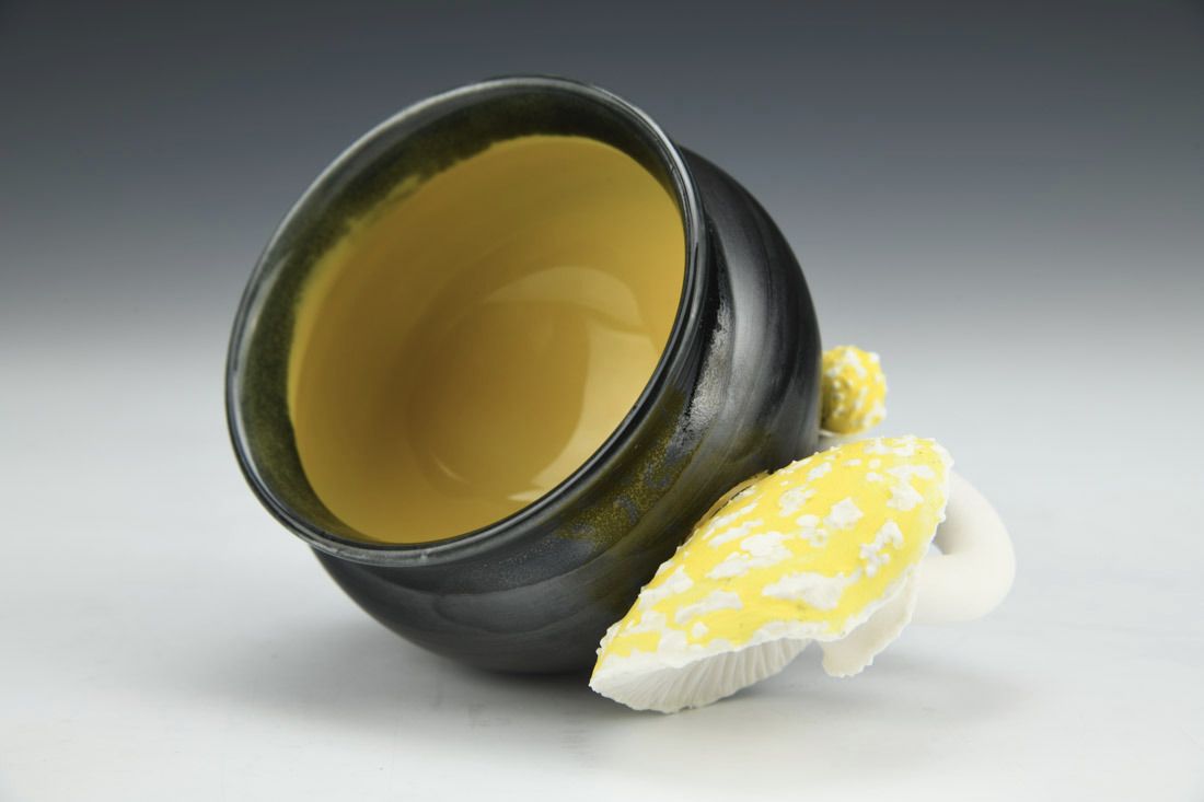 Porcelain, wheel thrown, hand carved, oxides, underglaze, celadon glaze, 2.75 x 5 x 3.5 inches.