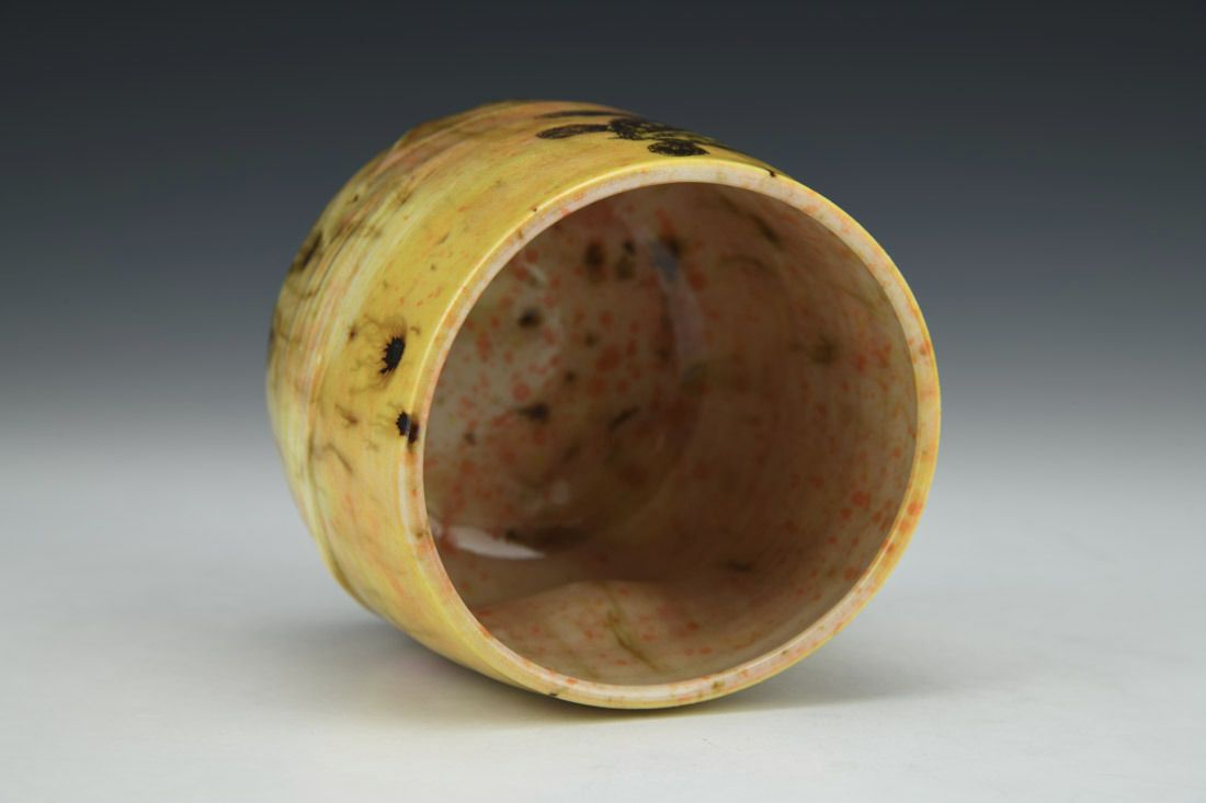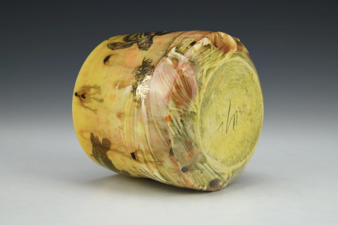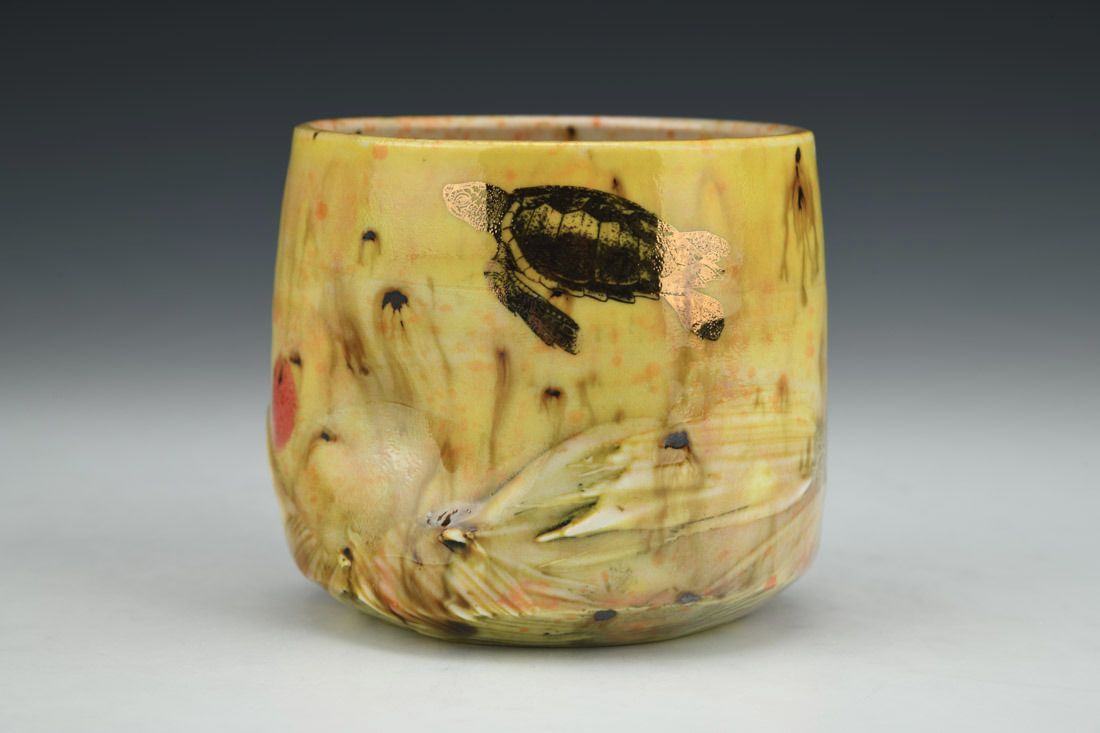 Porcelain, wheel thrown and altered, glazes, gold luster, decals, cone 6 electric fired with multiple firings, 3.5 x 4 x 3.75 inches.