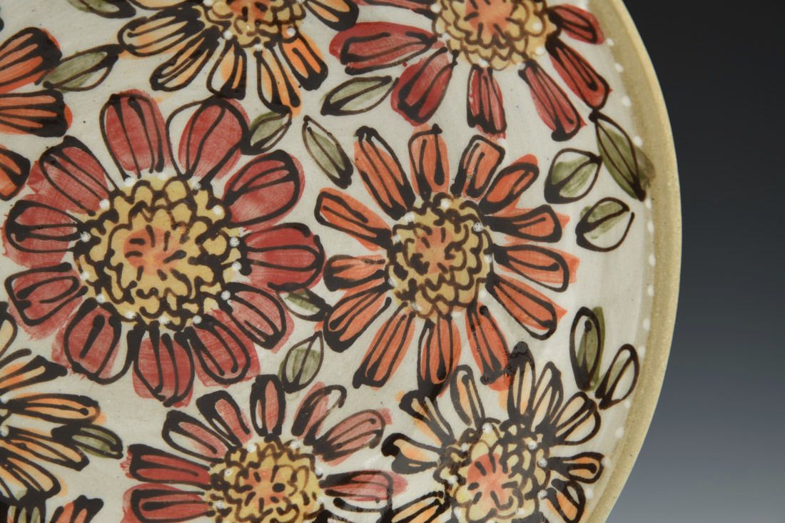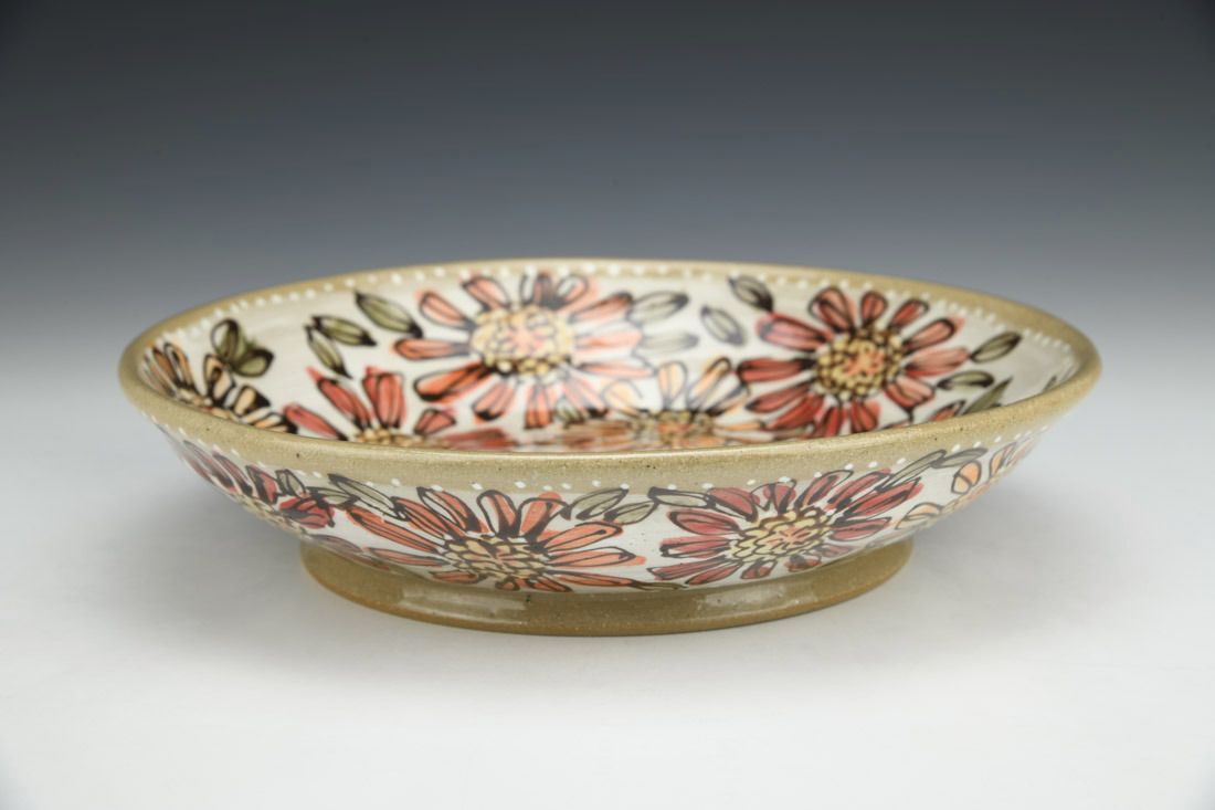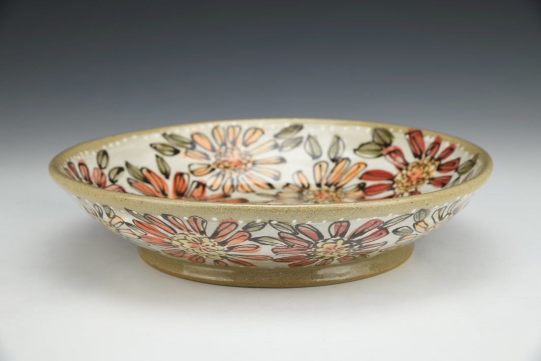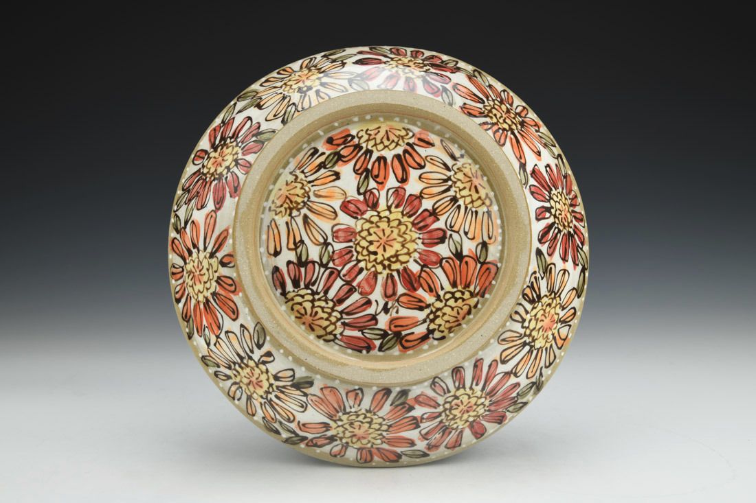 Stoneware, wheel thrown, underglaze, glaze, cone 6 electric fired, 2 x 9.25 x 9.25 inches.